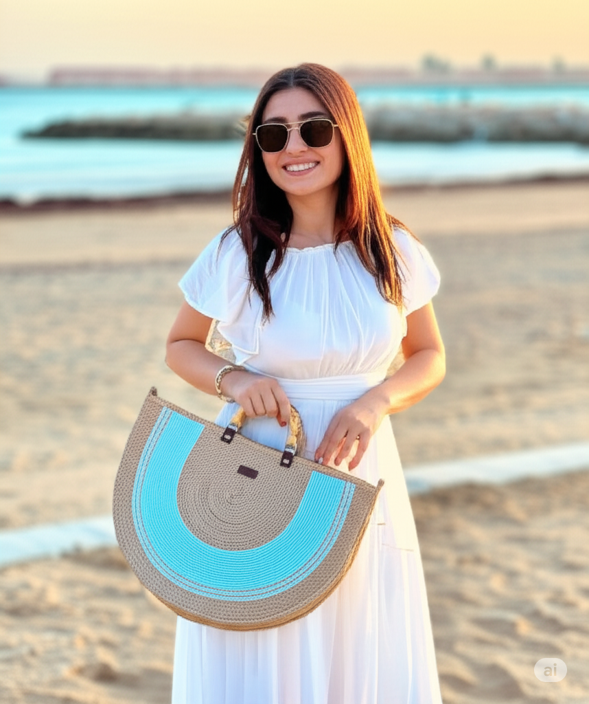 شنطة يد صيفية كبيرة منسوجة بلون بيج طبيعي، تتميز بقوس فيروزي جذاب ومقابض أنيقة من الخيزران، مثالية للشاطئ والاستخدام اليومي.