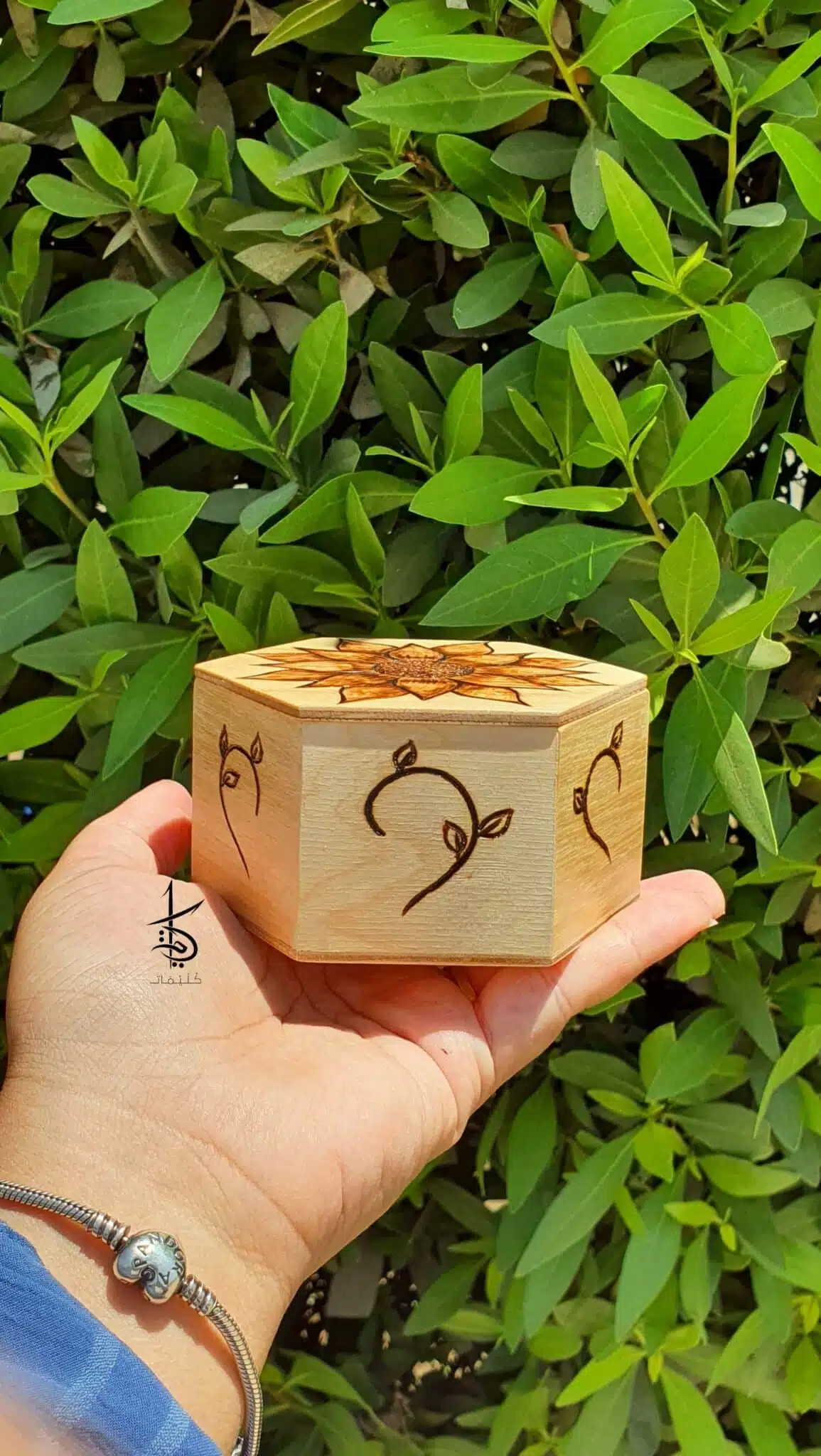 Hexagon-shaped mini wood box, with a hand-burned design.