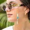 sunglasses chain is made with pearl and turquoise beads and adjustable rubber grip that fit any pair of eyewear