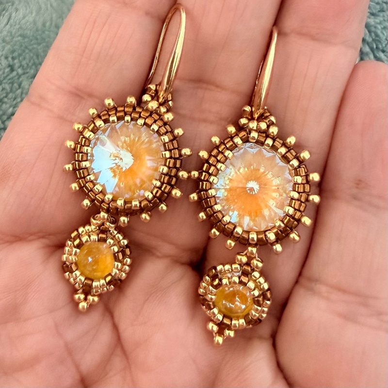 Handcrafted with radiant golden crystals and intricate Miyuki Delica beadwork, these earrings capture the warmth of sunlit elegance. A refined statement piece designed to shimmer with every movement.