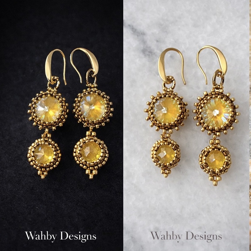 Handcrafted with radiant golden crystals and intricate Miyuki Delica beadwork, these earrings capture the warmth of sunlit elegance. A refined statement piece designed to shimmer with every movement.Wahby DesignsWahby Designs