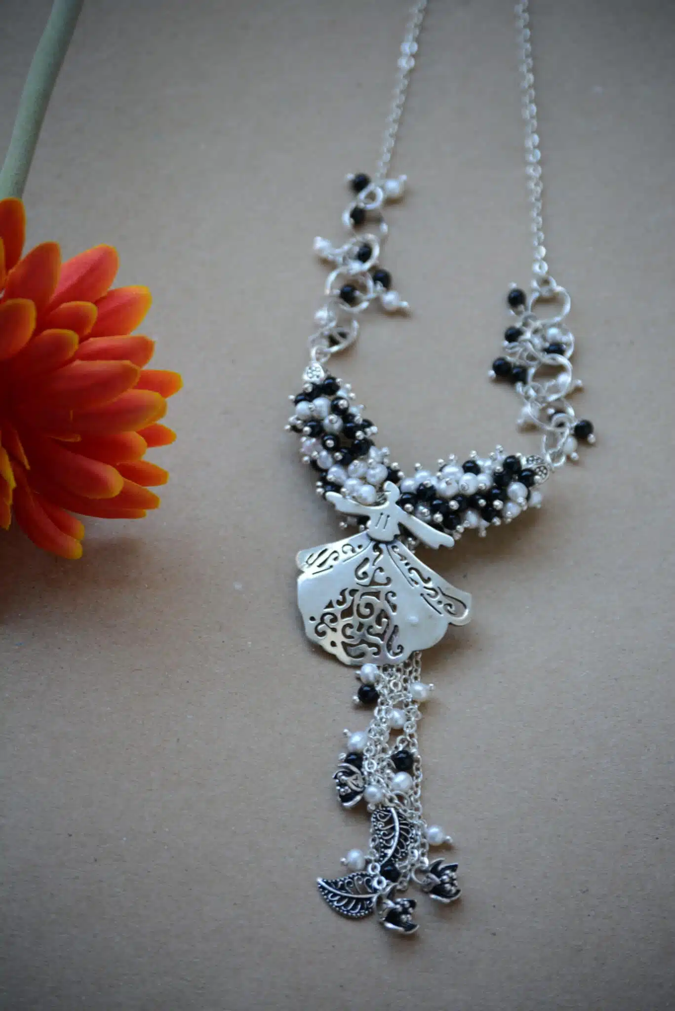 The swirling Darwish sterling silver 925 hand made necklace with pearls and onyx stones