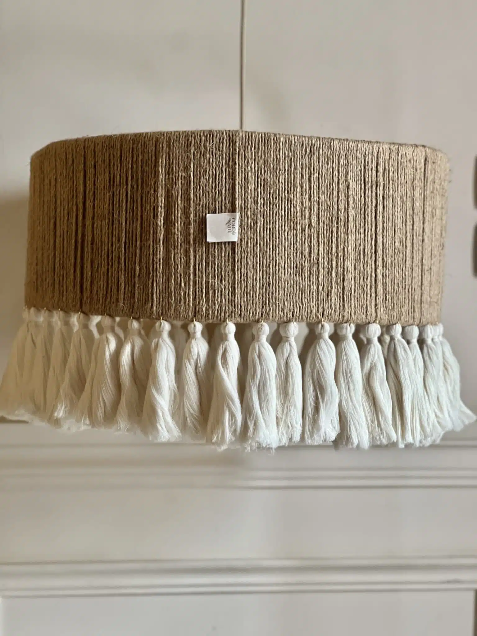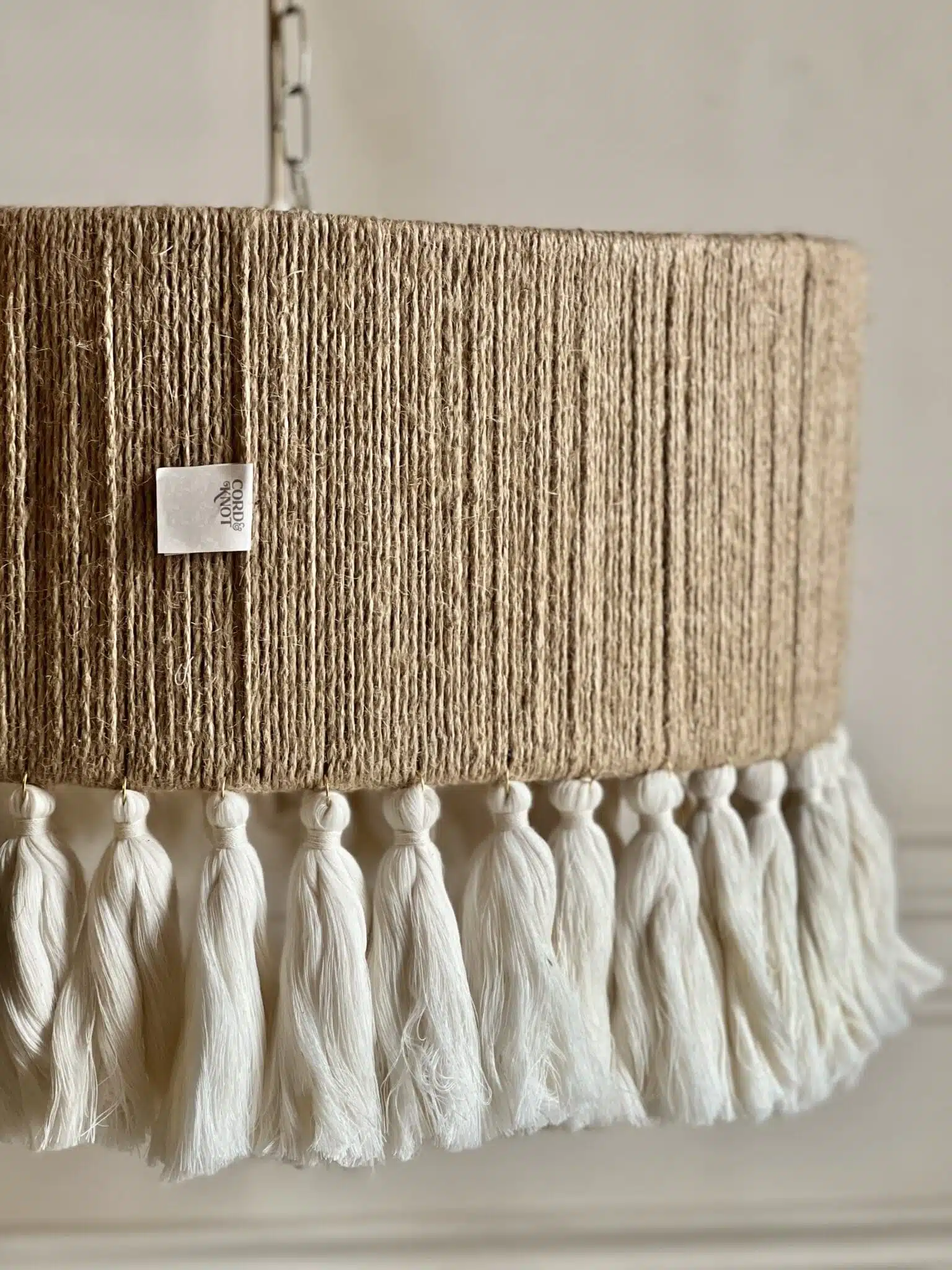 Tasseled chandelier made from natural jute and delicate cotton tassels.