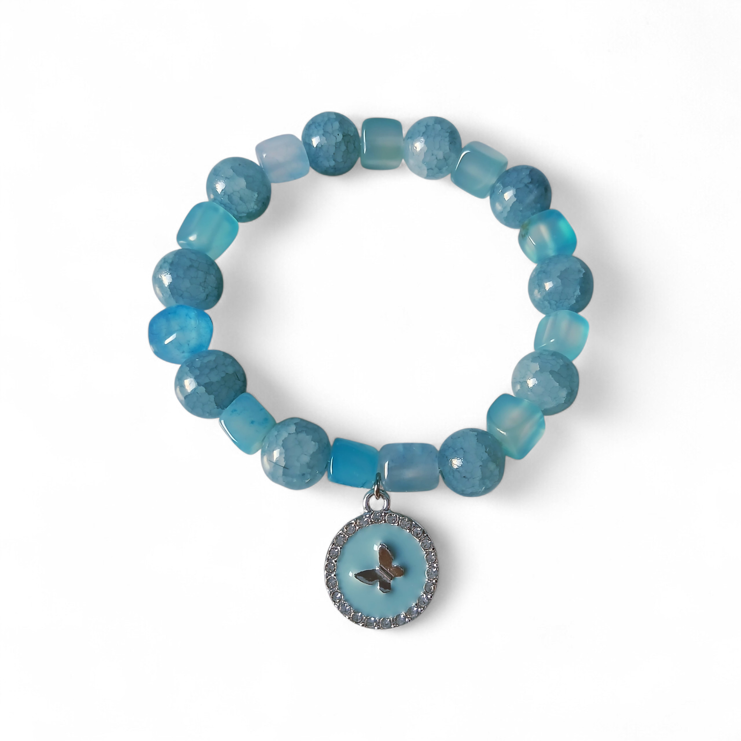 A bracelet made of teal blue agate stone beads in different shapes and a teal blue round pendant with a shape of butterfly made of tiny zircon