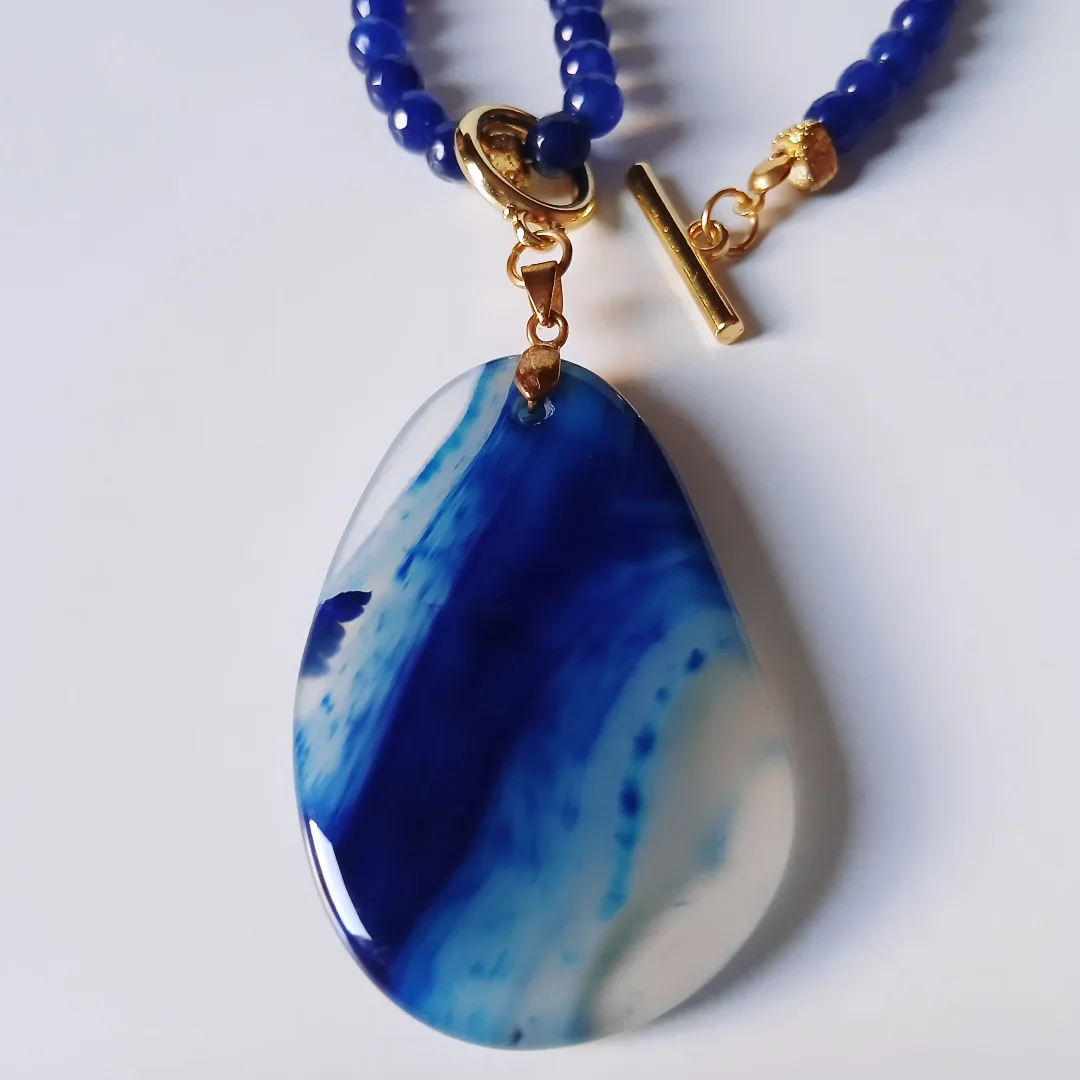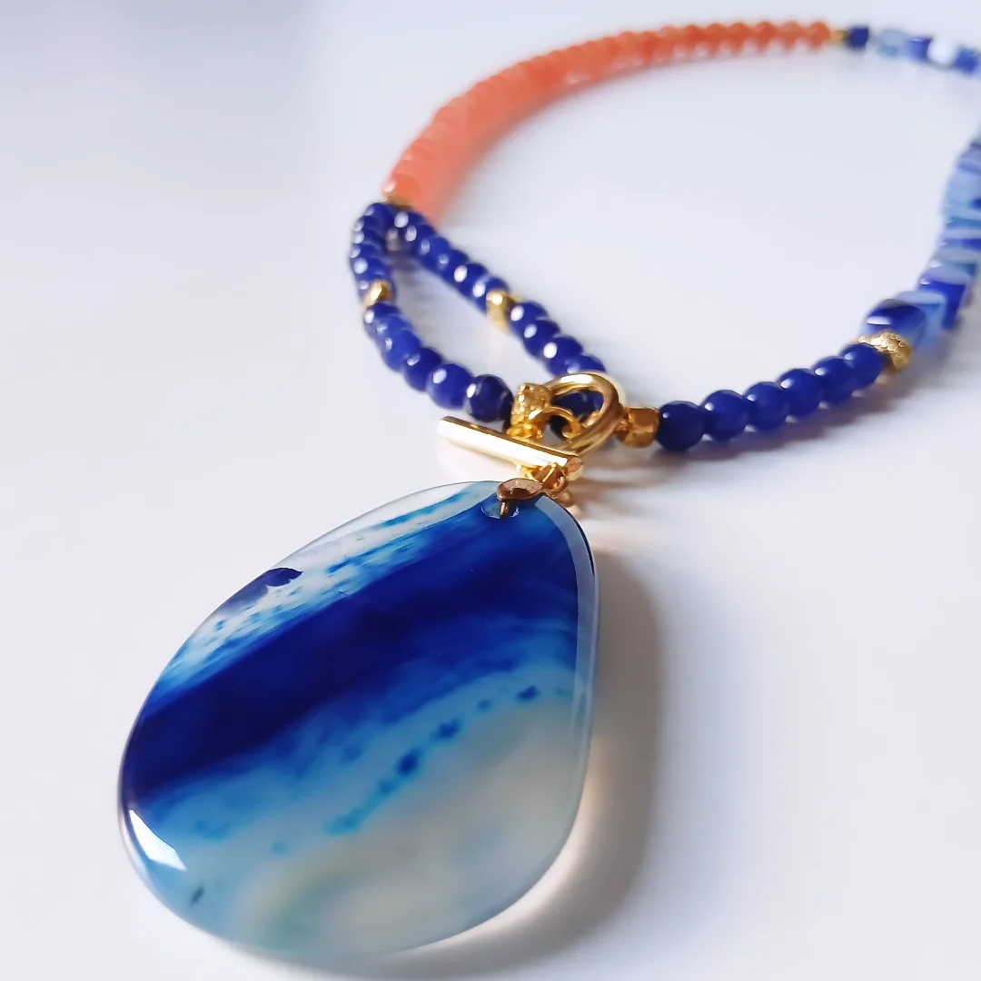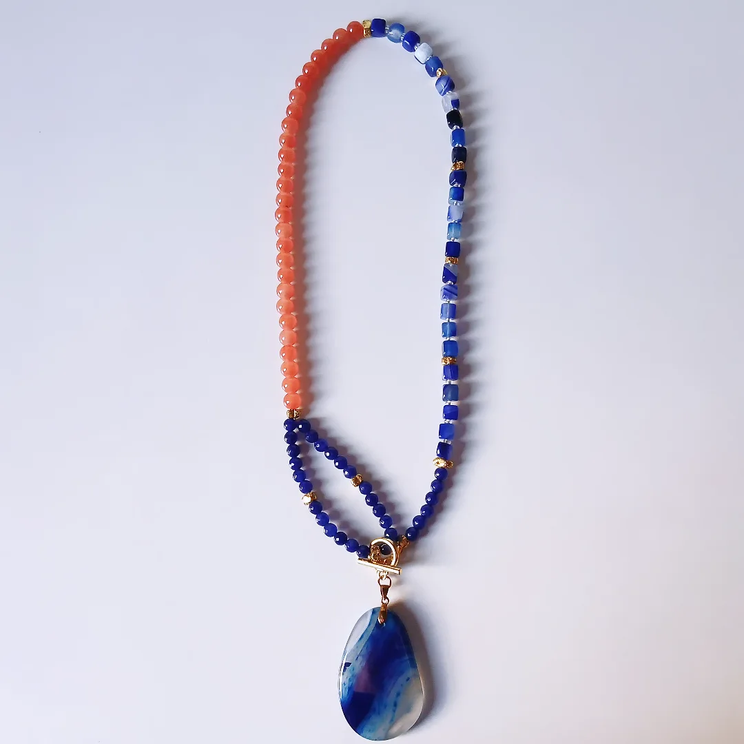 Statement necklace made of alabaster round and square stones in terracotta and navy blue with a big blue gemstone