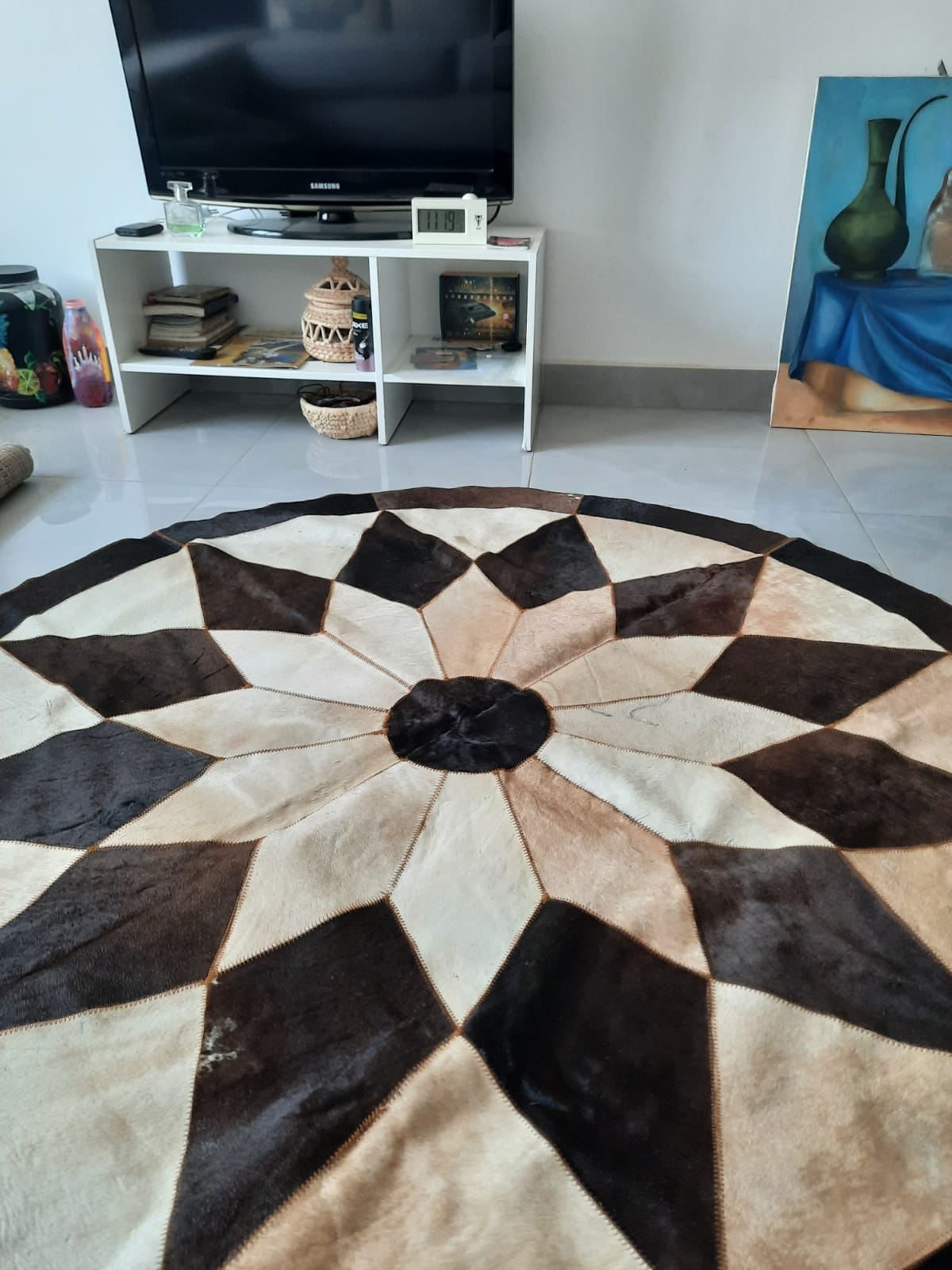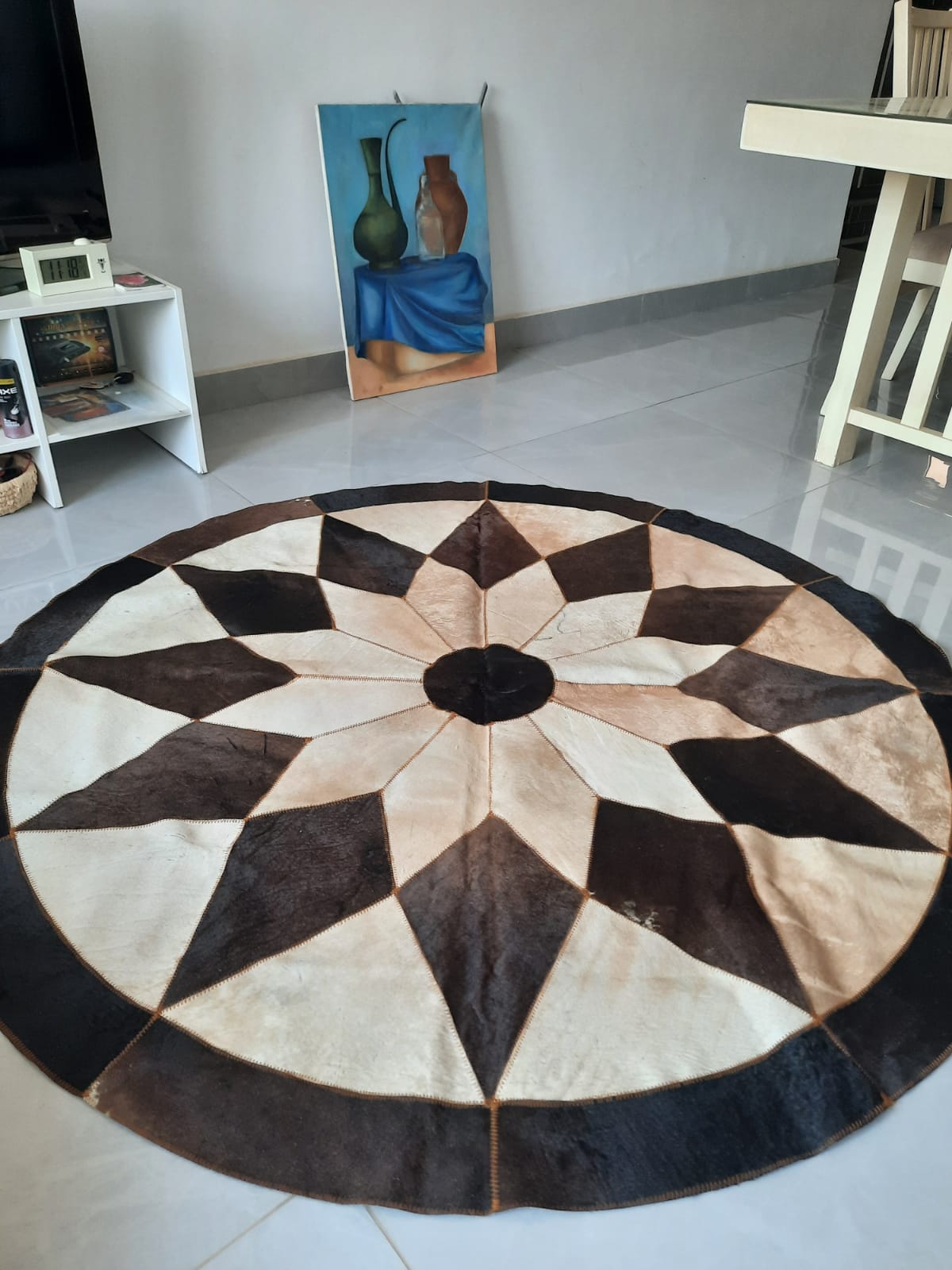 سجادة مصنوعة من الجلد الطبيعى 100%, بتصميم هندسى متوازن يعكس الجمال و الهدوء فى آن واحد. كل قطعة جلد تم اختيارها و تنسيقها بعناية , لتخرج لنا سجادة تحمل بصمتها الخاصة,و لا تتكرر. هذه السجادة صممت لمن يؤمن ان الفخامة الحقيقية تكمن فى القطع التى لا تشبه غيرها.