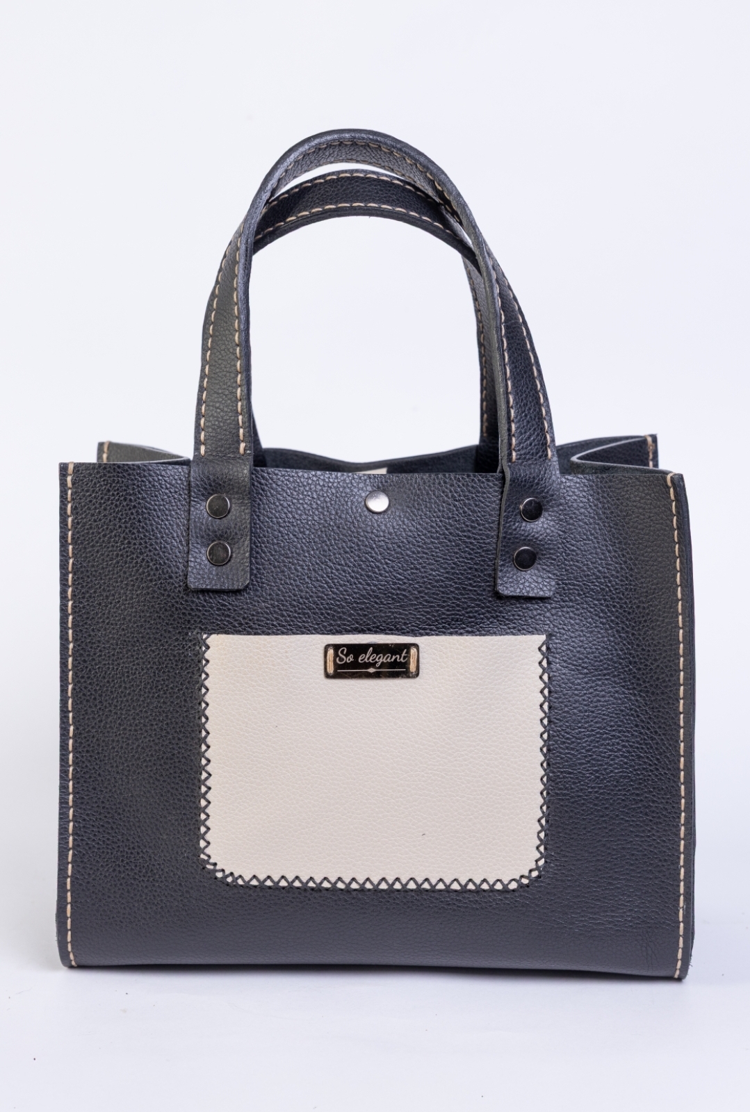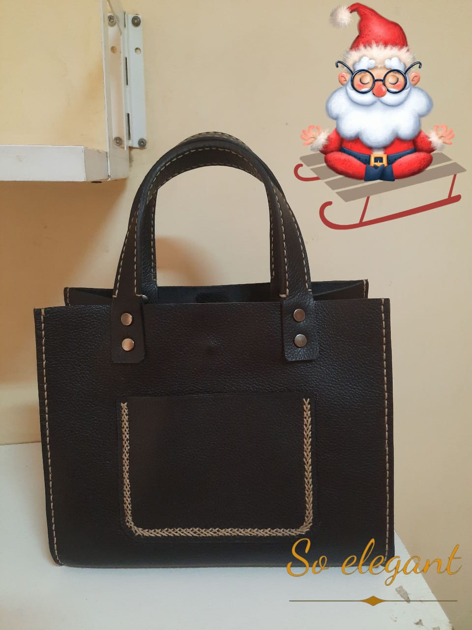 This handmade leather tote features lovely hand stitching and soooo elegant style.