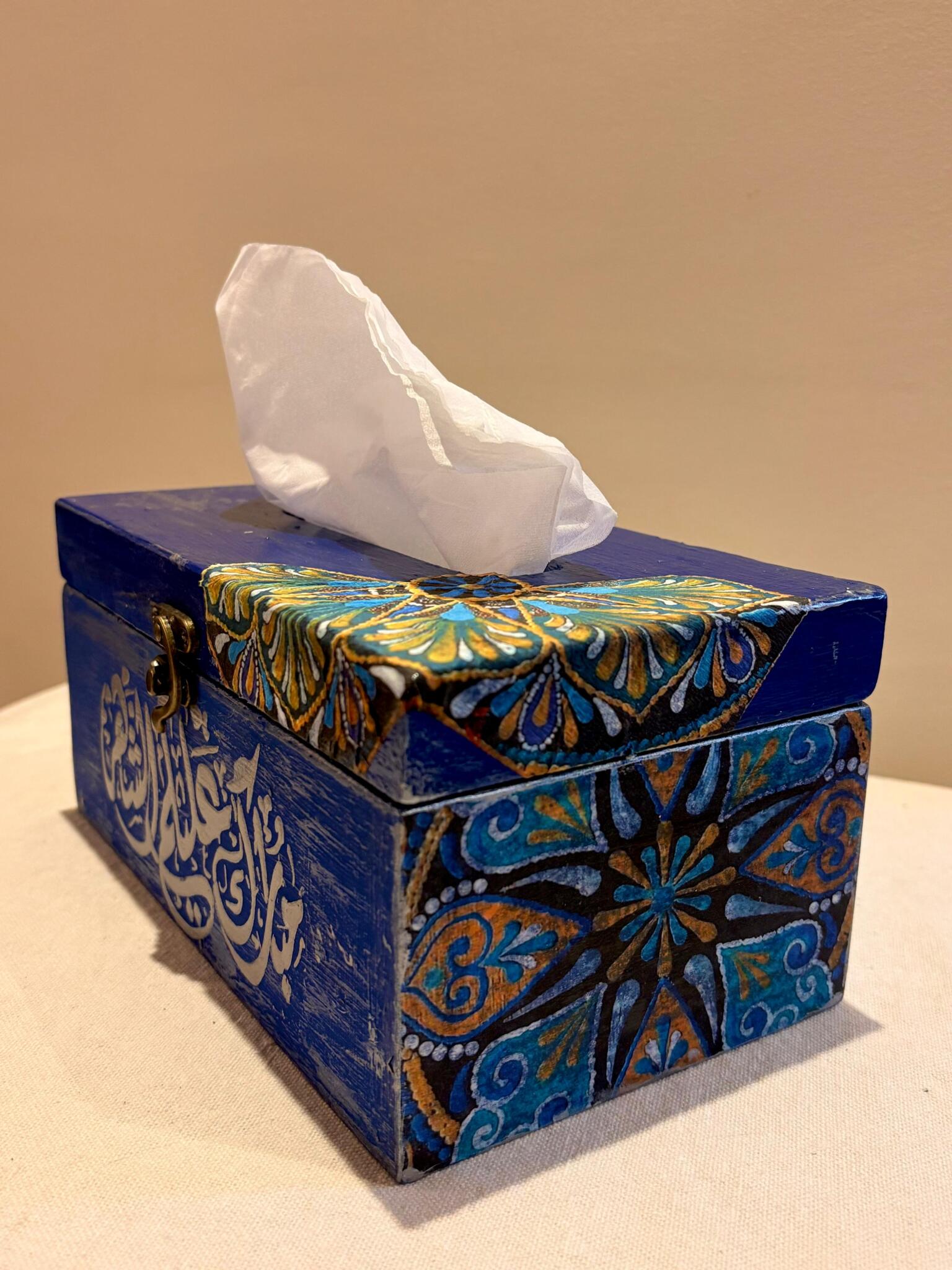 Colors: The box is Blue with handmade paintings colored with Green ,Orange, Turquoise, Yellow, Brown & White.