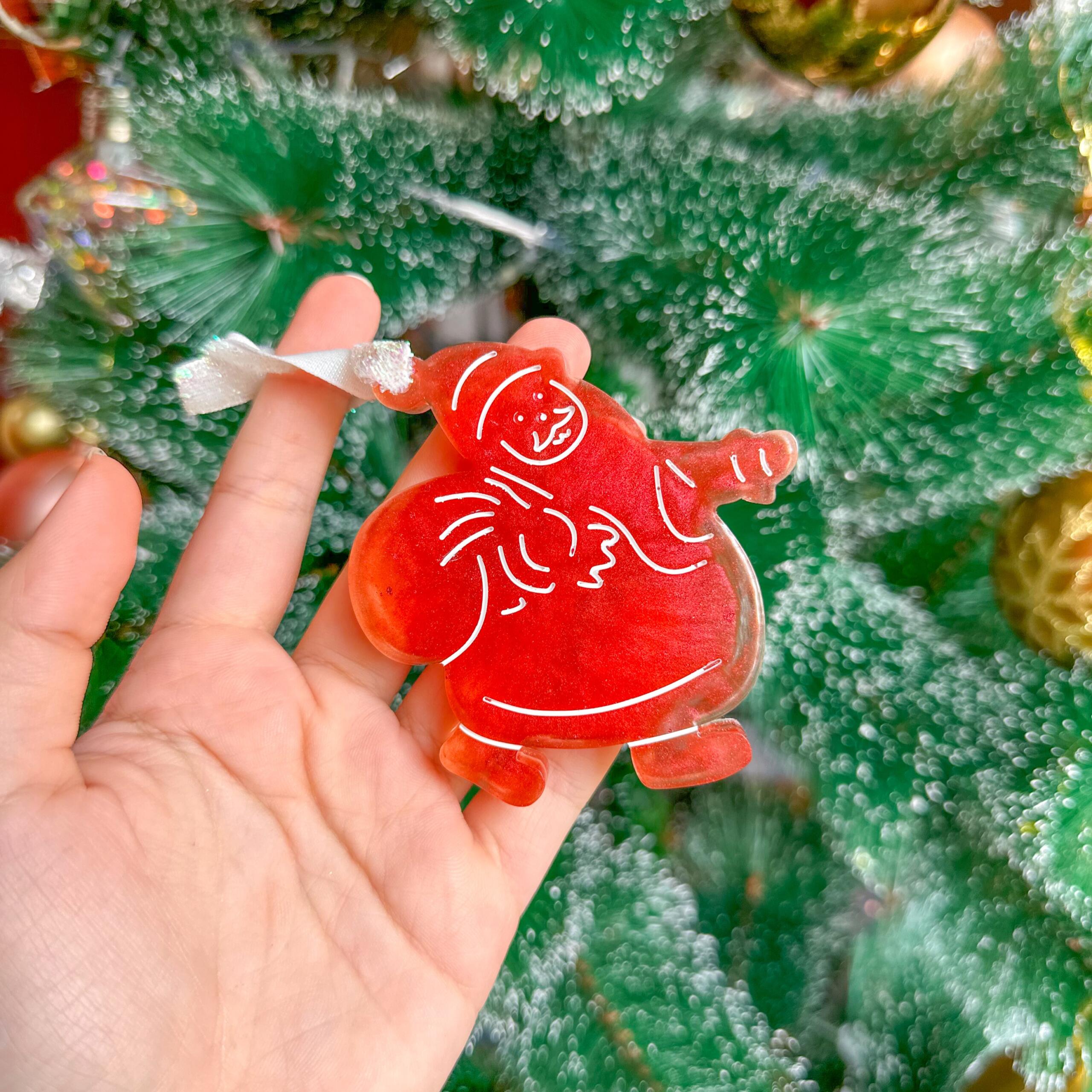 A handcrafted set of three festive resin ornaments — Santa, Snowman & Tree, and Holiday Cottage.