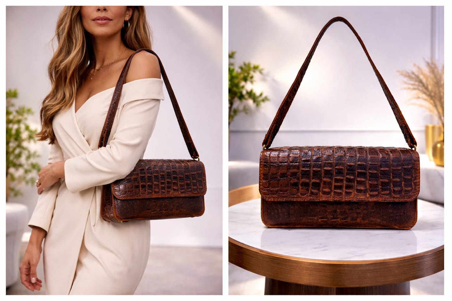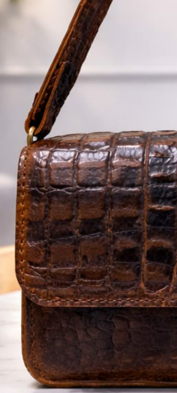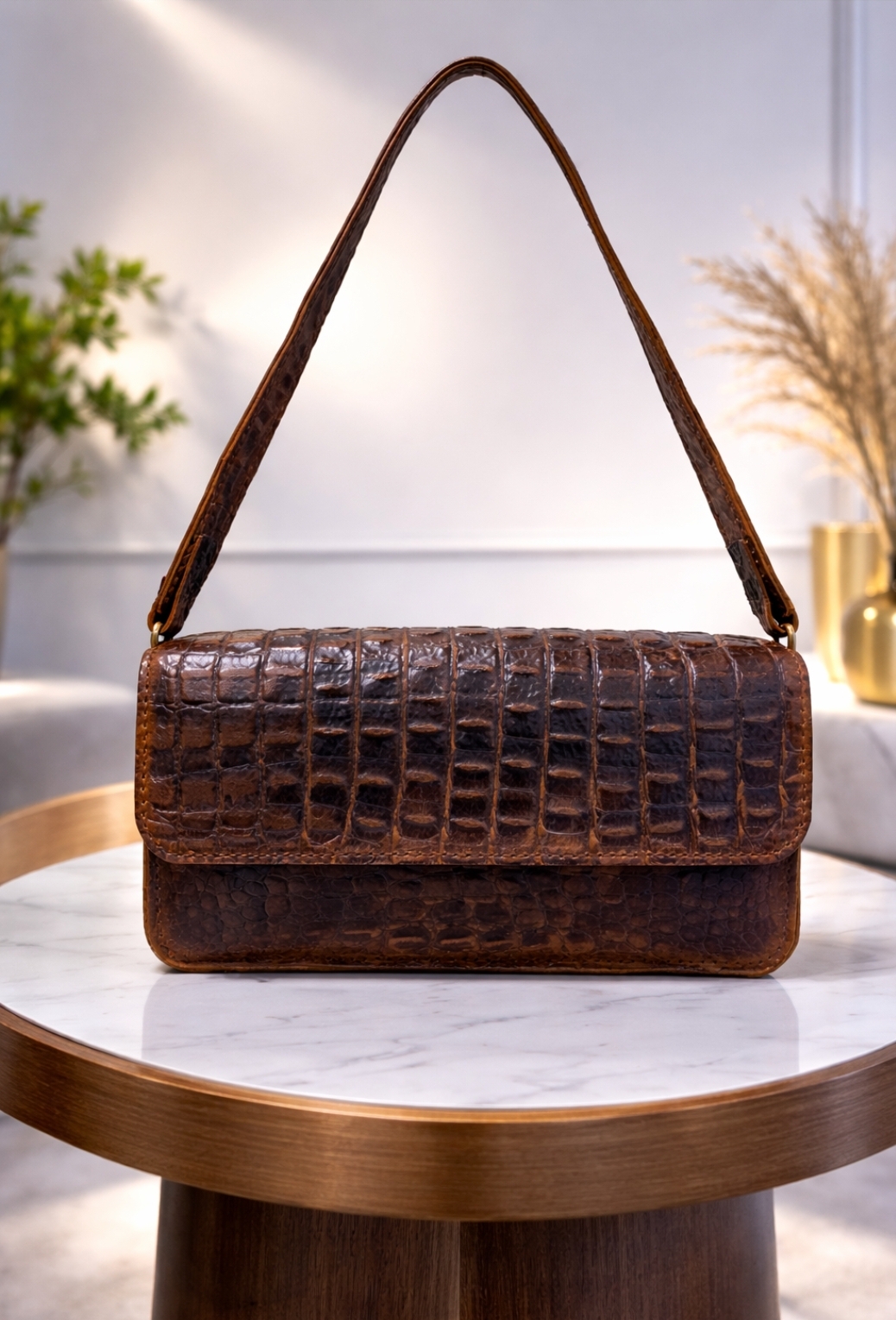 A statement piece crafted in rich, chocolate-toned crocodile-embossed leather. Elegant shoulder bag that blends sophistication with everyday ease. Perfect for both : refined daytime looks and chic evening outings.