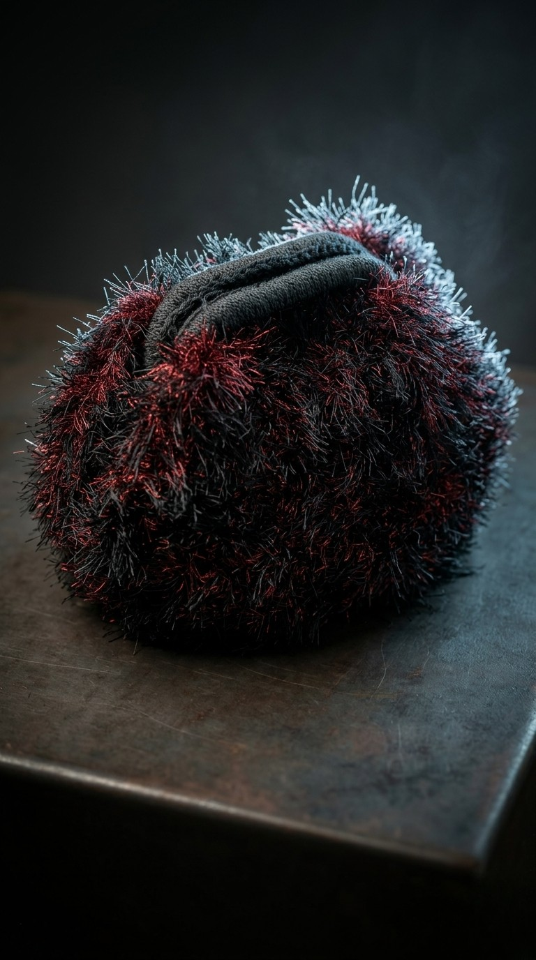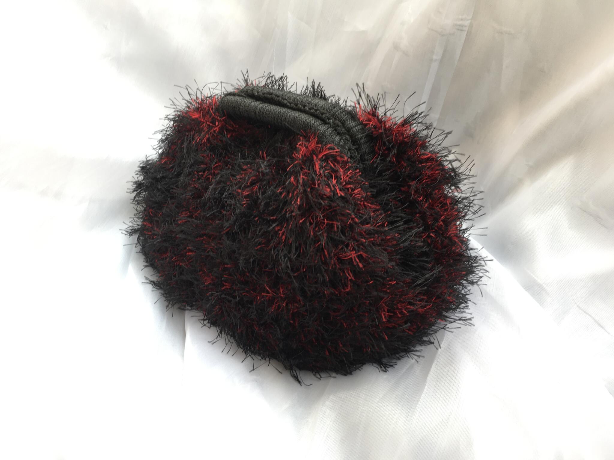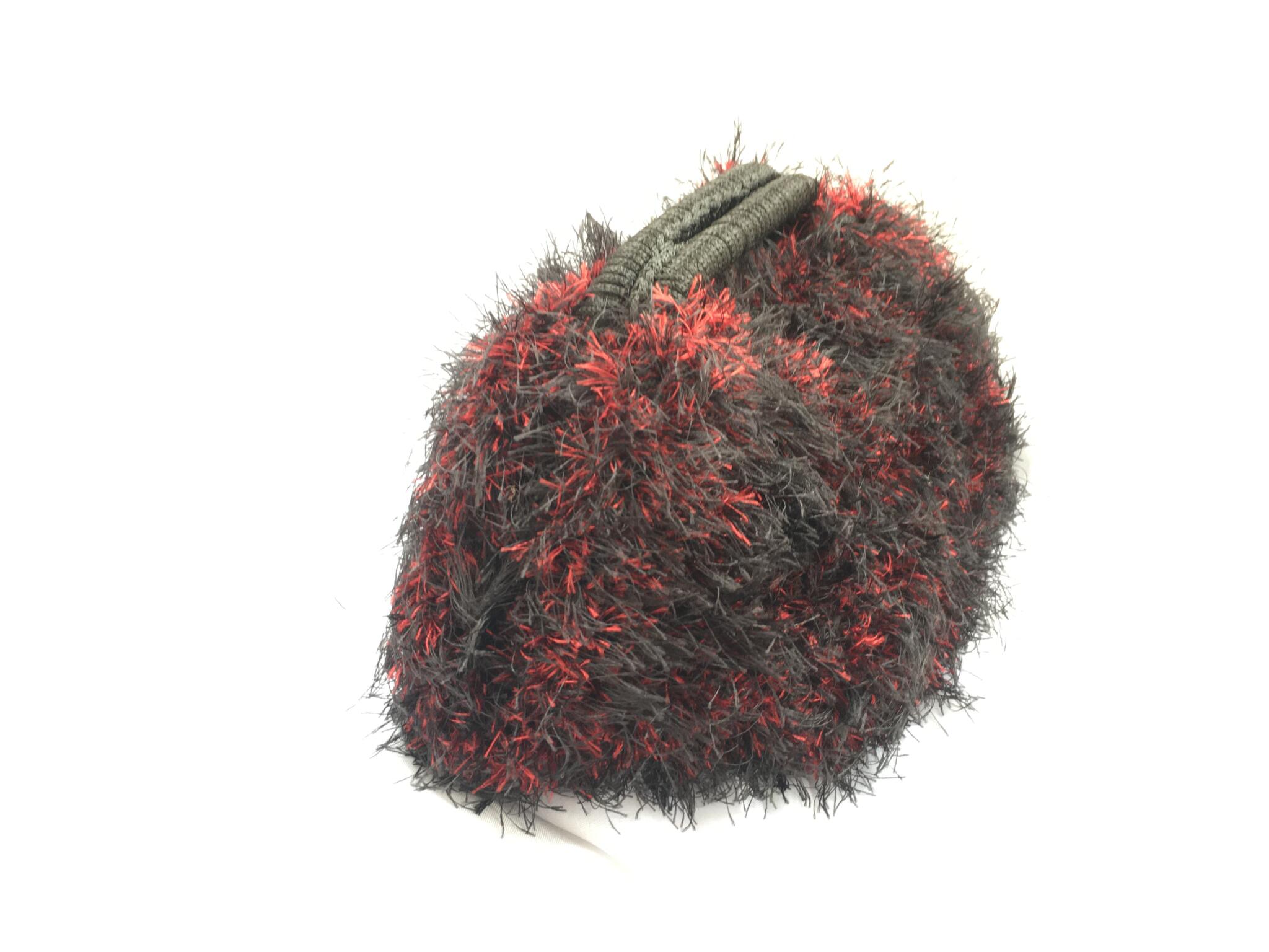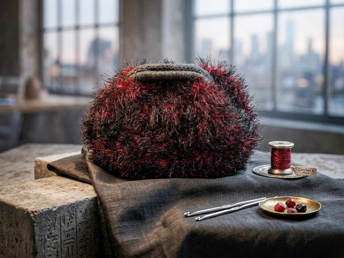 Elevate your evening silhouette with a piece that defies the ordinary. The Eyelash Midnight Clutch is meticulously hand-crocheted, blending deep obsidian structural fibers with shimmering metallic crimson fringe.