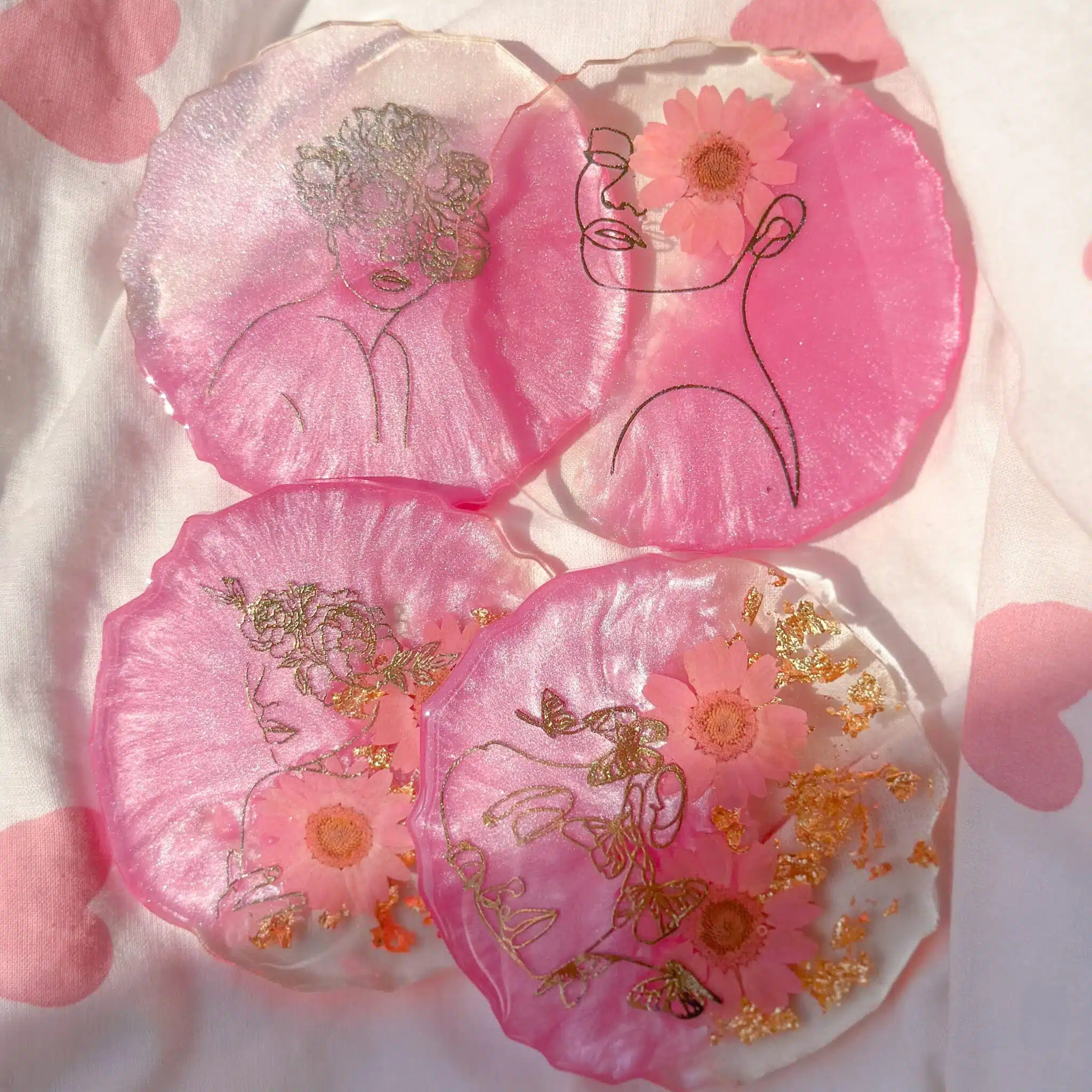 from shimmering blush-toned resin coaster set, adorned with real pressed florals, gold leaf flakes, and detailed line art celebrating the beauty of the female form.