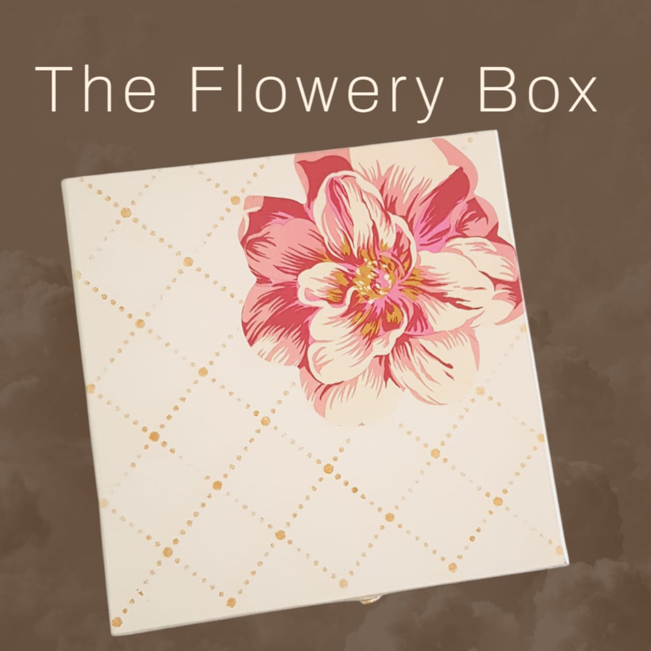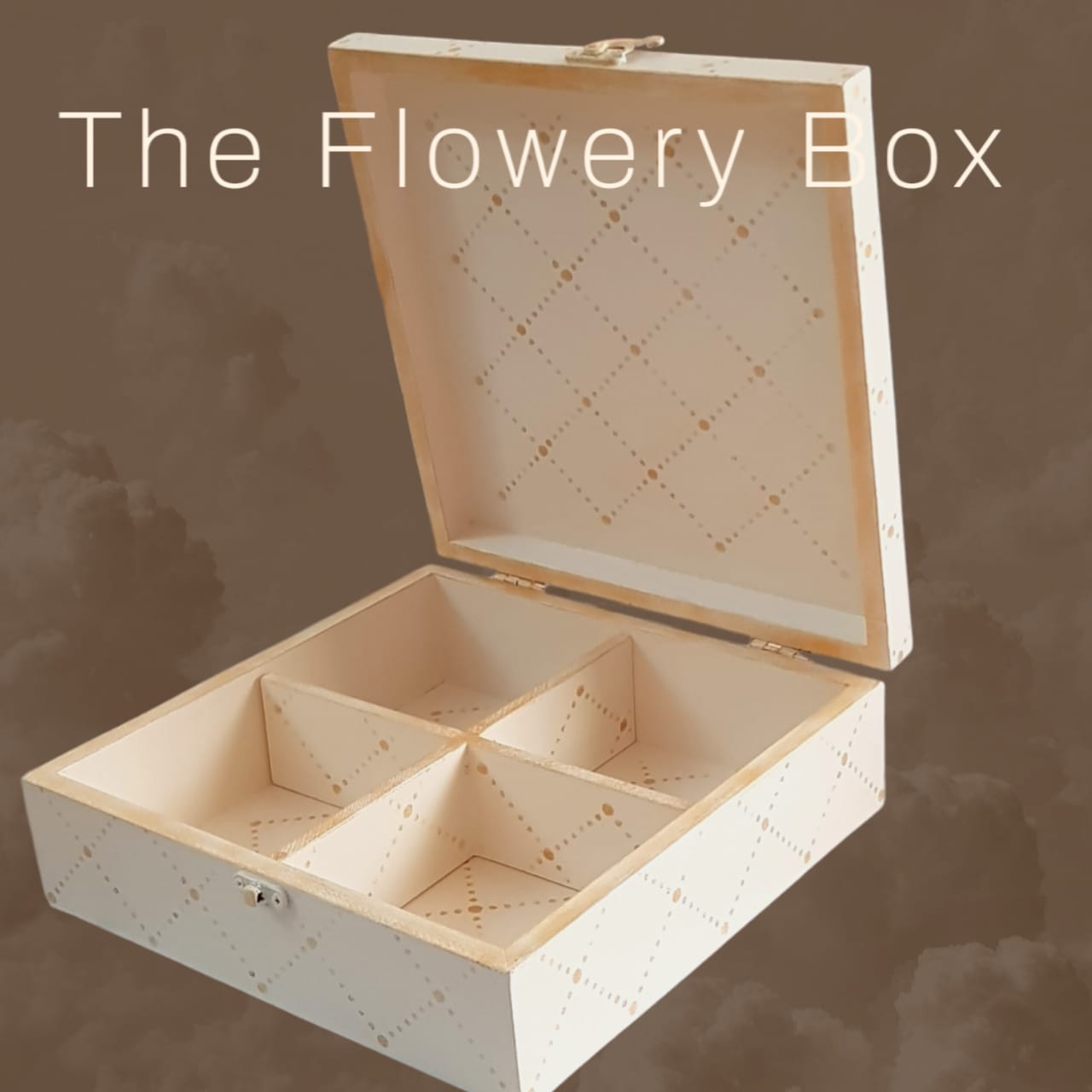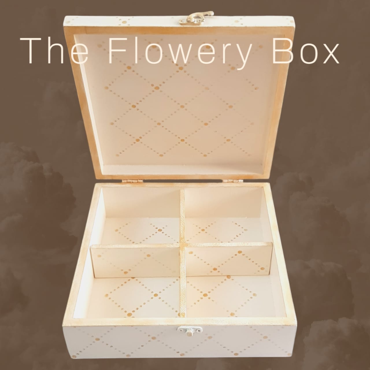 An elegant wood box decorated with a pinky flower that blends well with the off white color and the golden dots