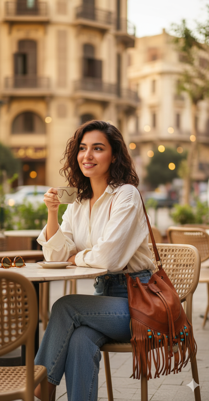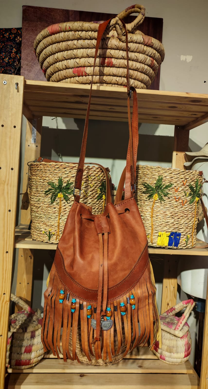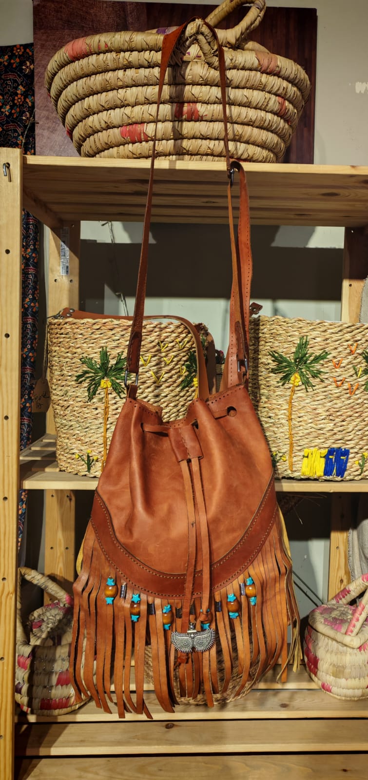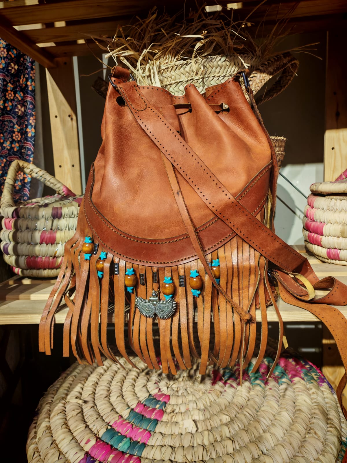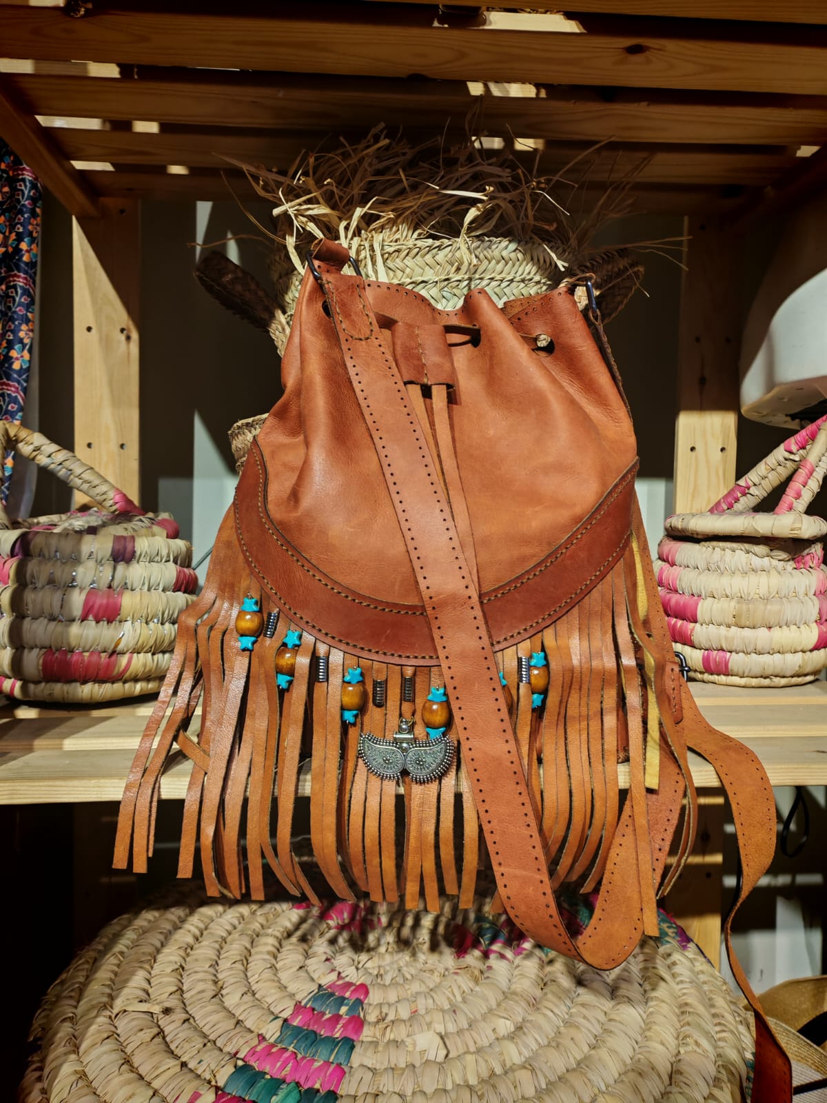 هذه حقيبة كتف جلدية مصنوعة يدويًا ذات طراز بوهيمي (Boho style)، تتميز بتصميم فريد ومفصل.