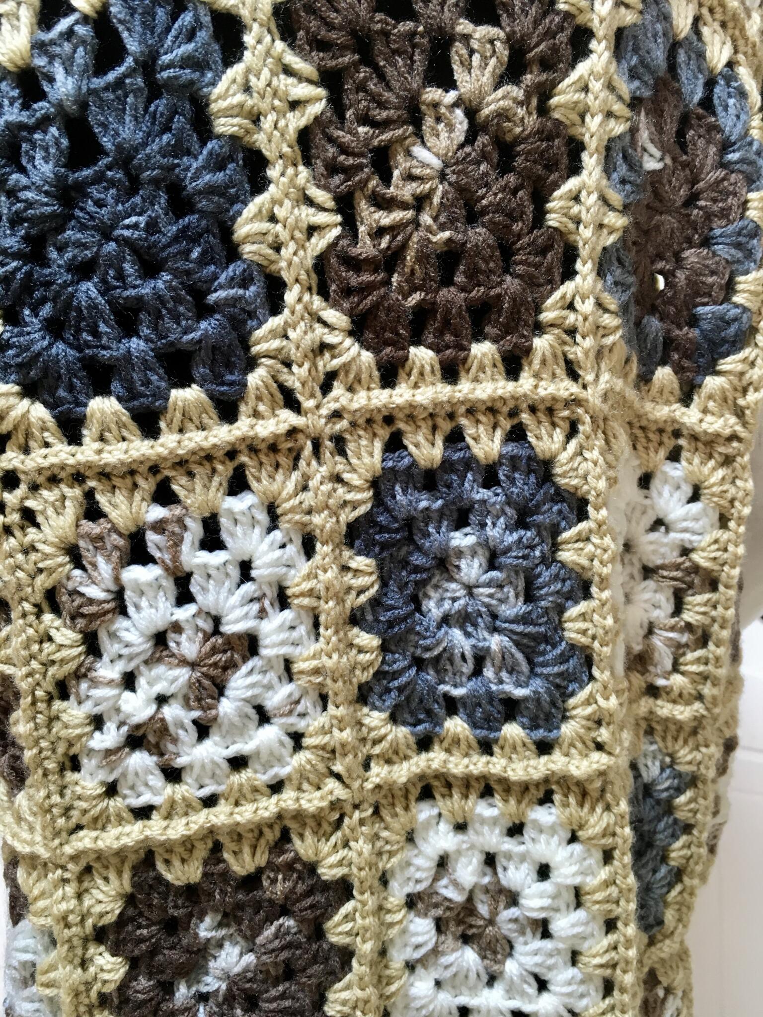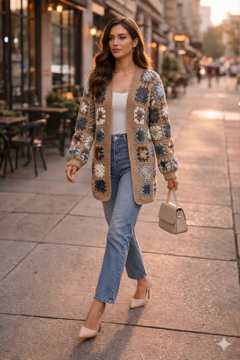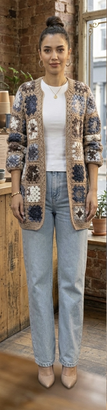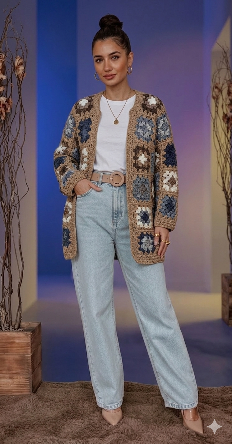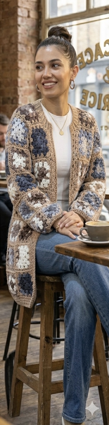 Elevate your layering with our Beige Multi-Color Granny Square Crochet Jacket. This unique piece features a detailed granny square design with earth tones of brown, blue, white, and tan. This knit jacket is perfect for a stylish and effortless look in winter and spring.