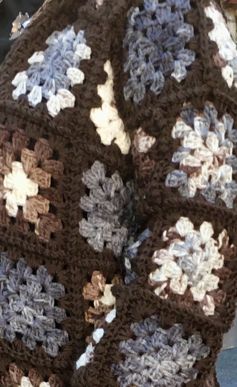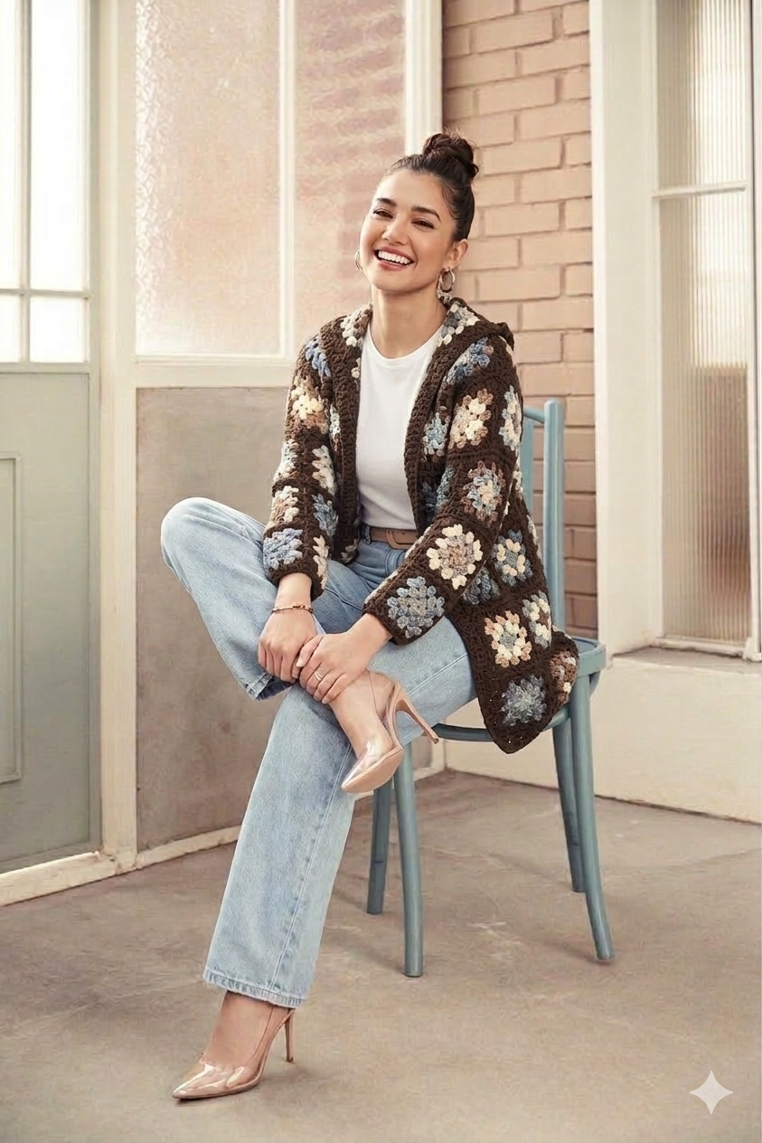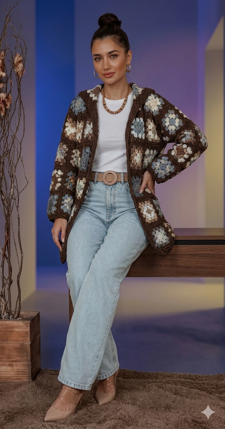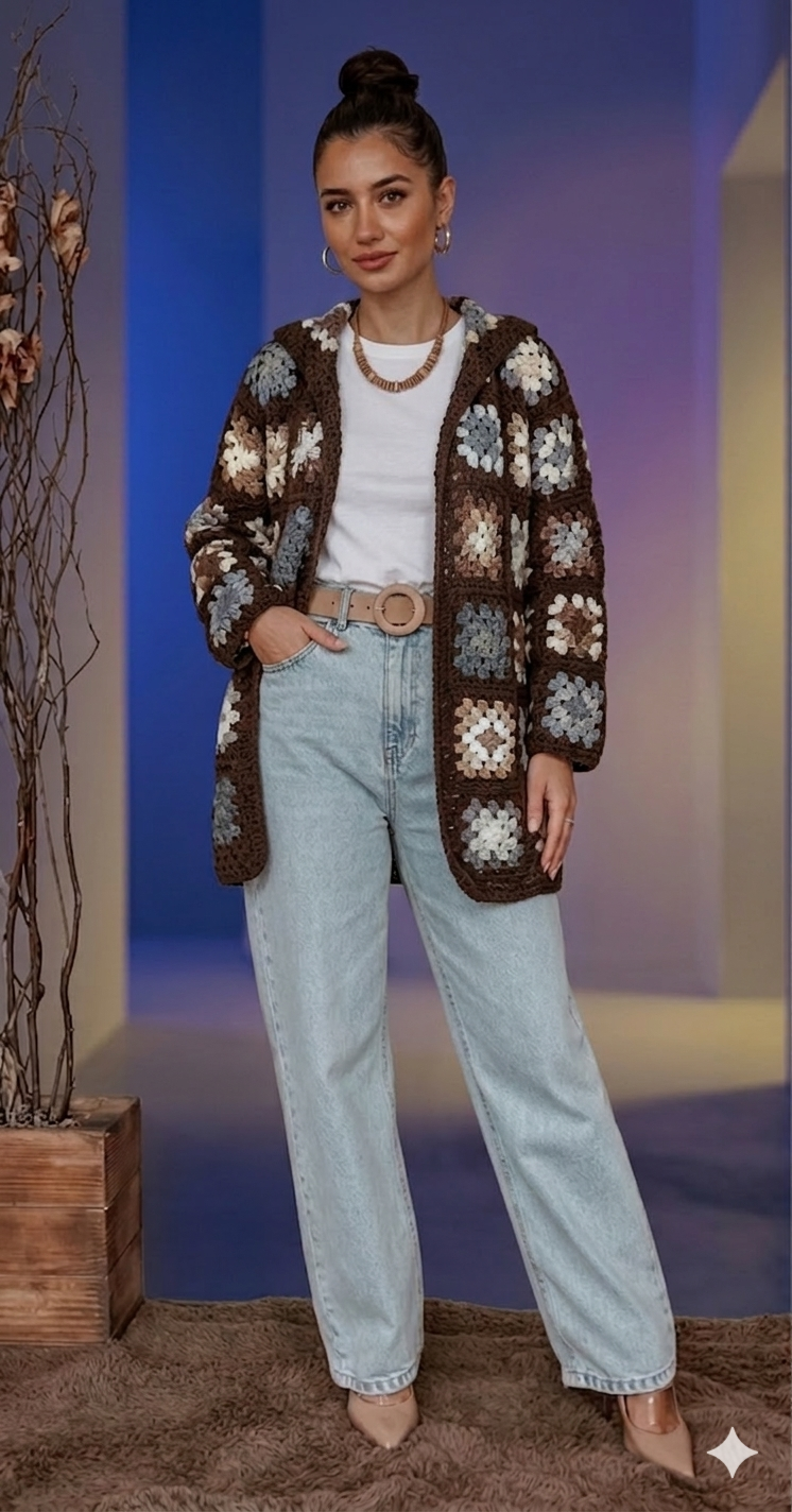 Elevate your layering with our Brown Multi-Color Granny Square Crochet Jacket. This unique piece features a detailed granny square design with earth tones of brown, blue, white, and tan. This hooded knit jacket is perfect for a stylish and effortless look.