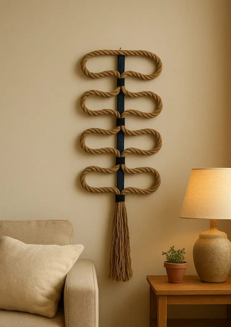 ”هذه القطعة الفنية هي ‘The Infinity Loop’ معلقة جدارية فريدة مصنوعة يدوياً من ألياف الجوت الطبيعية والمستدامة بنسبة 100%. تصميمنا يدمج بين الأشكال الهندسية العصرية وروح الطبيعة، ليضيف لمسة من الدفء والأناقة لأي مكان، مع الالتزام الكامل بالحفاظ على البيئة كونها قطعة قابلة للتحلل الحيوي بالكامل.”