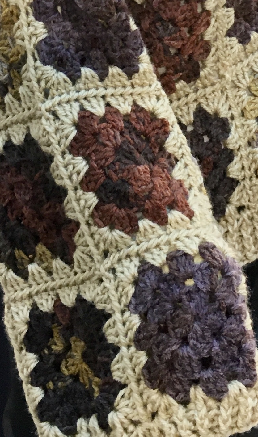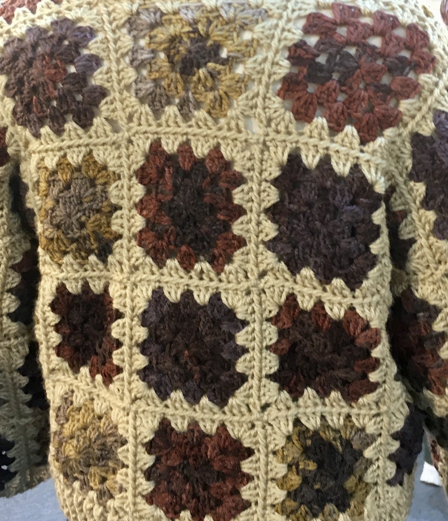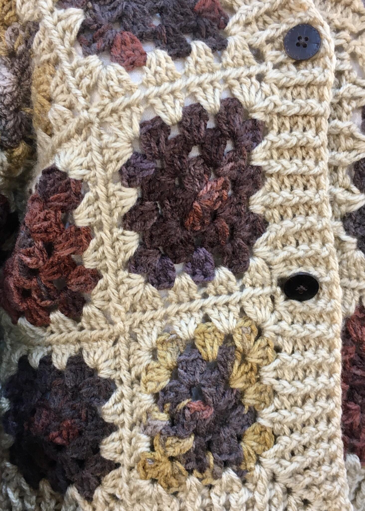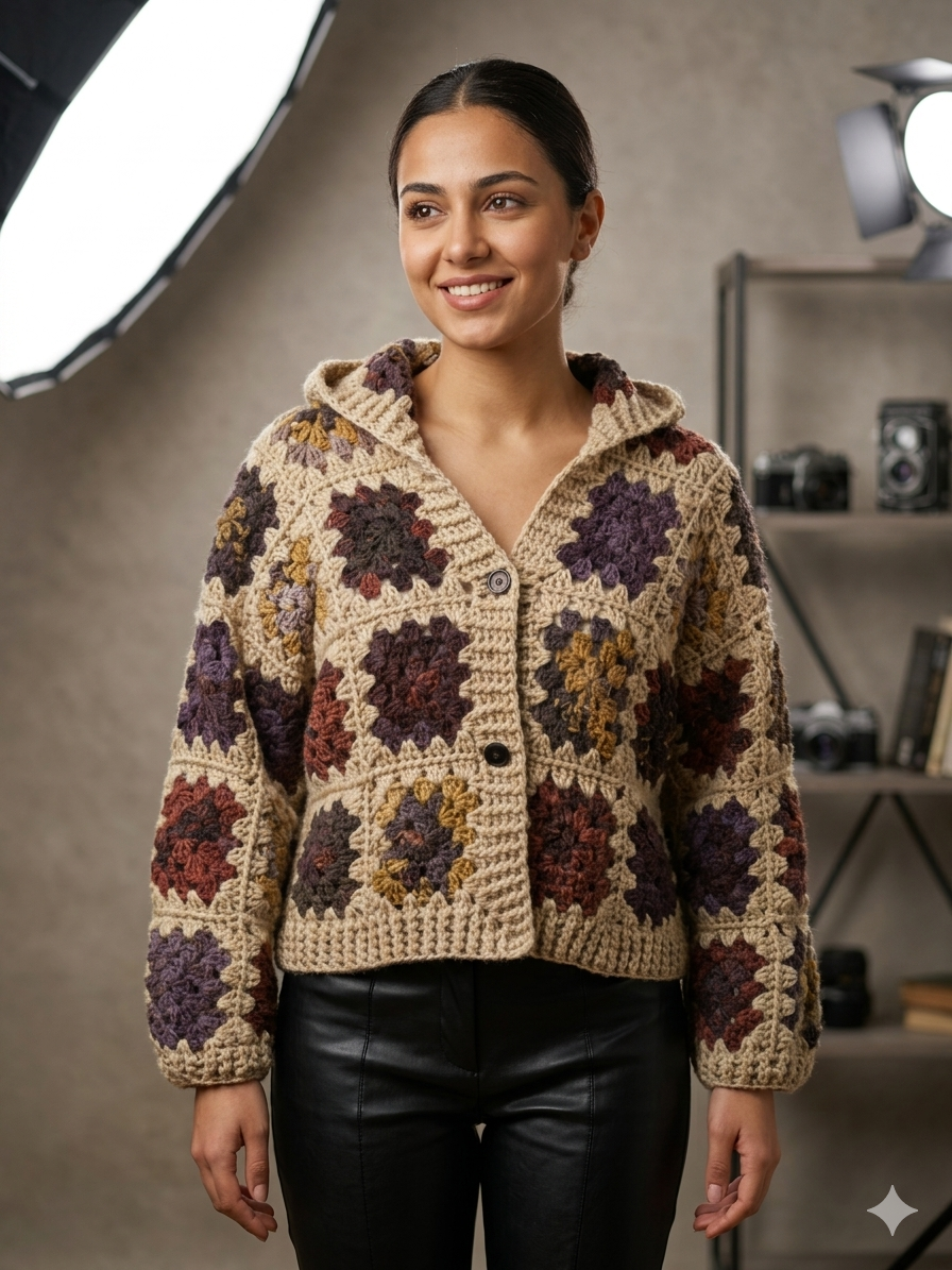 This exquisite piece is a masterclass in elevated granny square construction, merging bohemian nostalgia with high-fashion structural integrity. Crafted using a sophisticated palette of earthy ochre, deep plum, and rustic mahogany, each motif is meticulously joined to create a seamless, fluid drape.