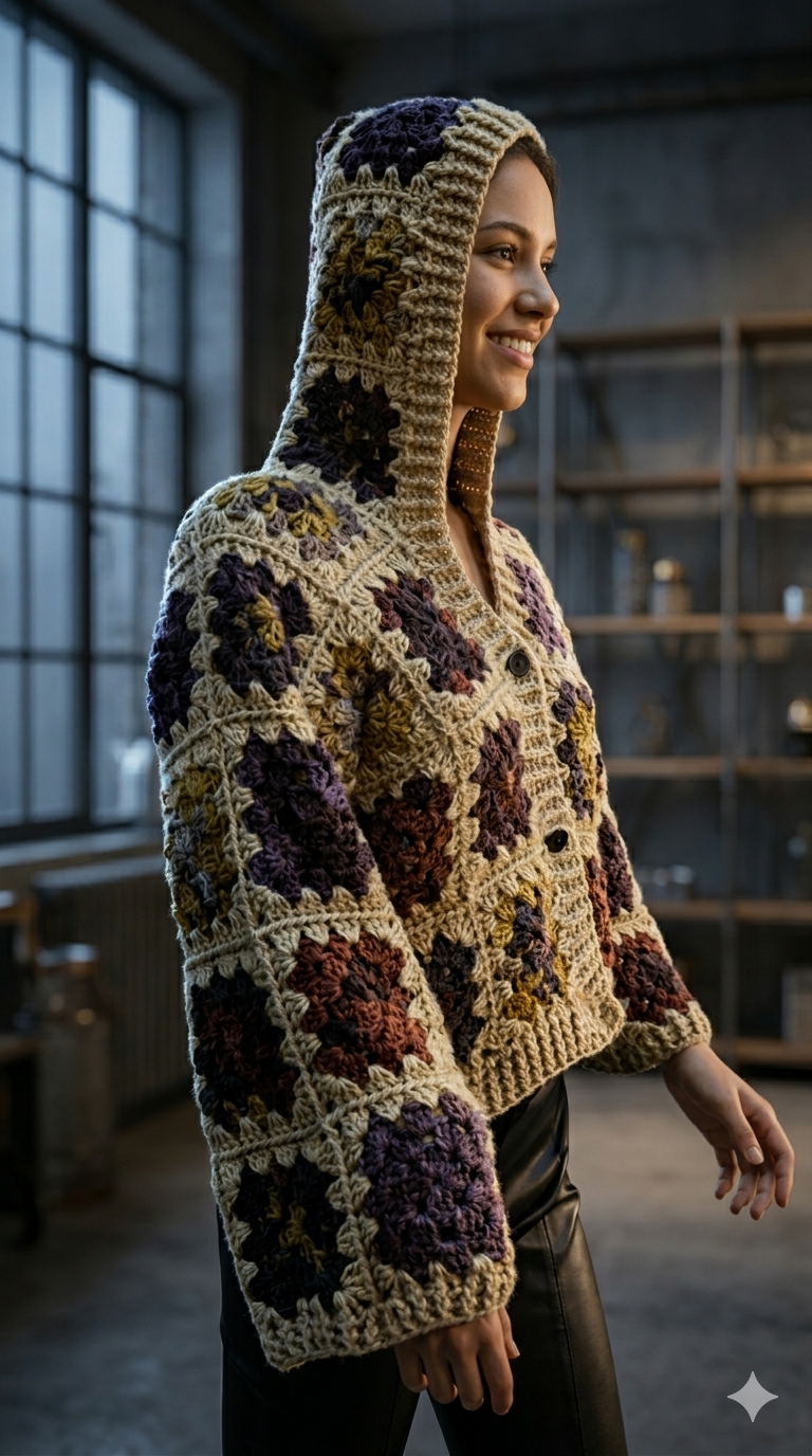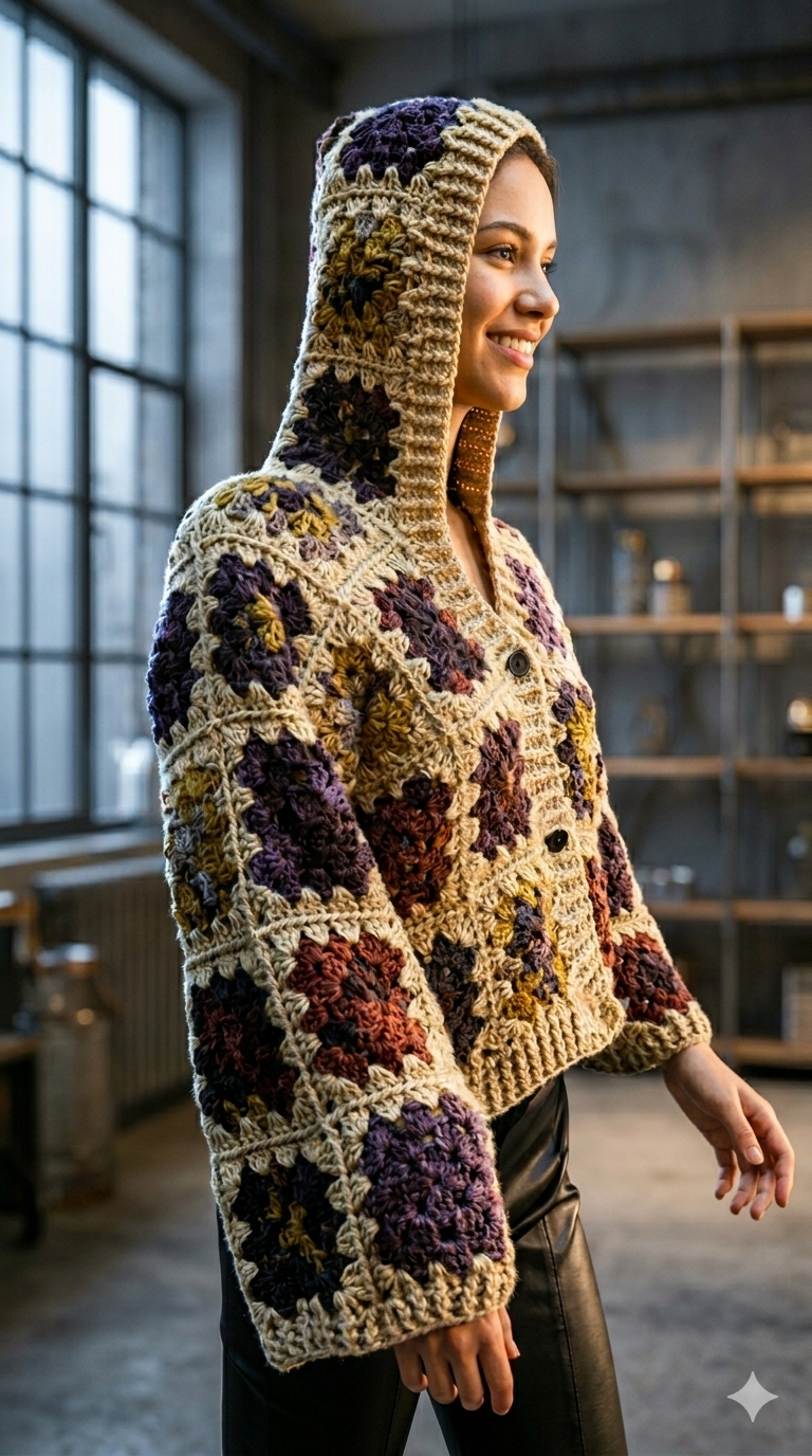 The jacket features a sculptural hooded neckline and an exaggerated, wide-cut sleeve that emphasizes the intricate texture of the cluster-stitch detailing. Finished with a clean-ribbed hem and tonal fastenings, this cardigan transcends traditional crochet, positioning itself as a “wearable art” staple for the modern, conscious wardrobe. It’s not just a garment; it’s a celebration of textural depth and artisanal precision.
