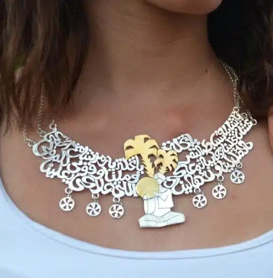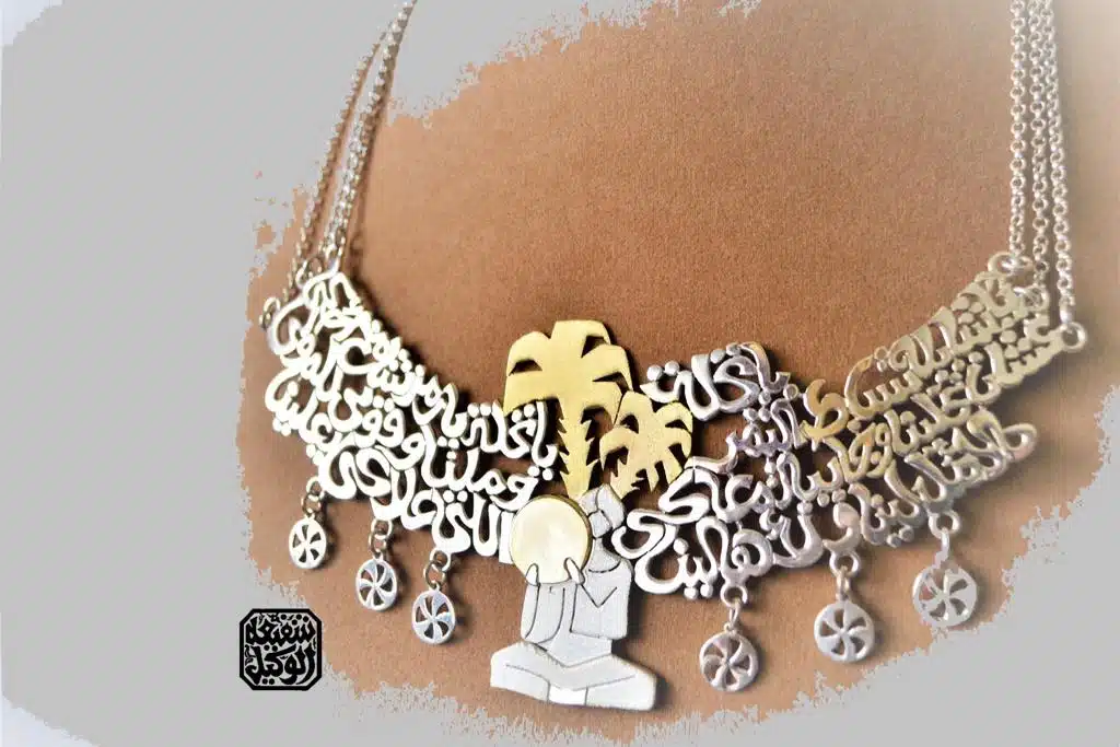 A delicately handmade necklace featuring the famous Bikar’s poetry ( The Palm Tree ) ( يا نخلة )