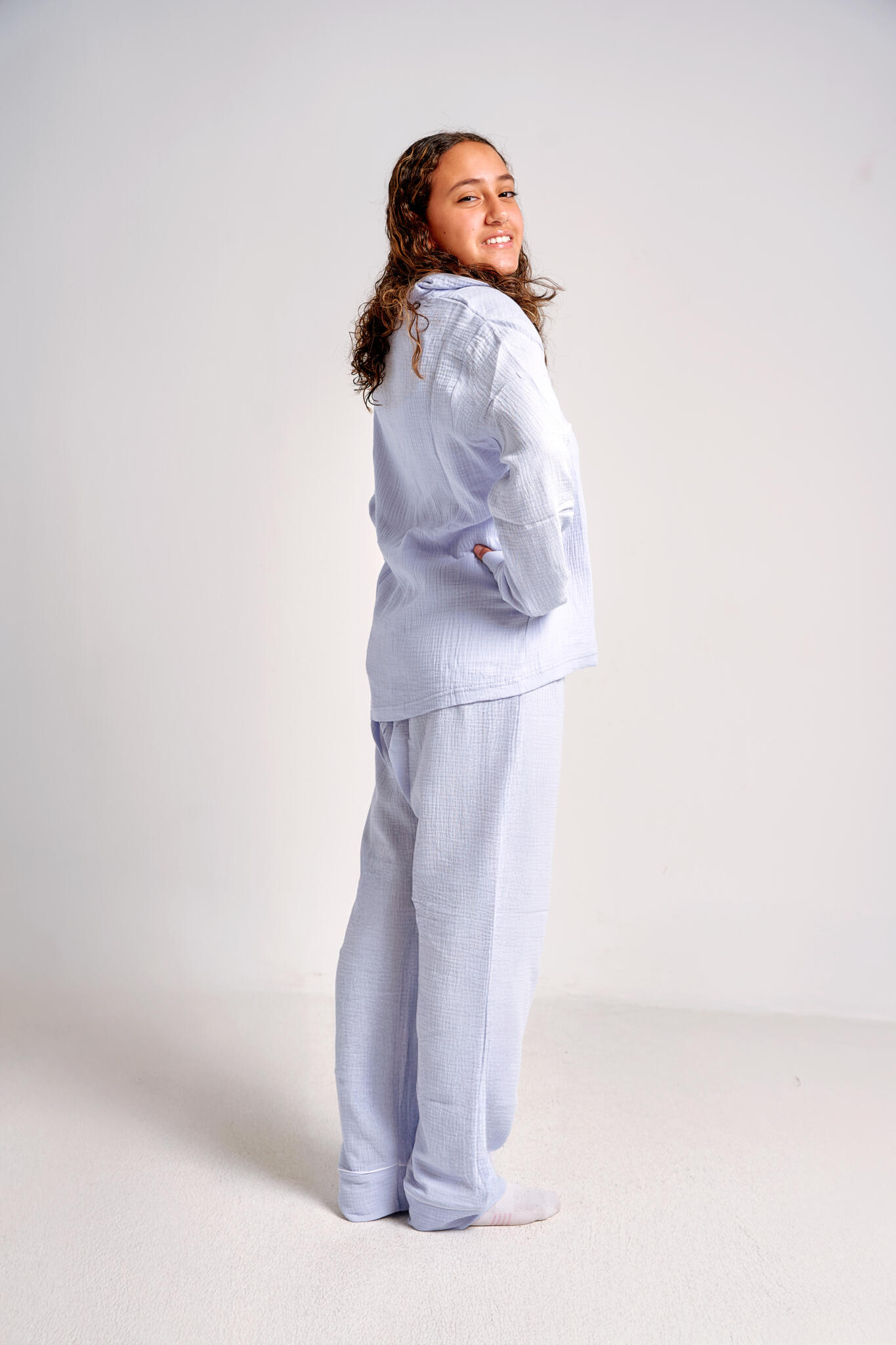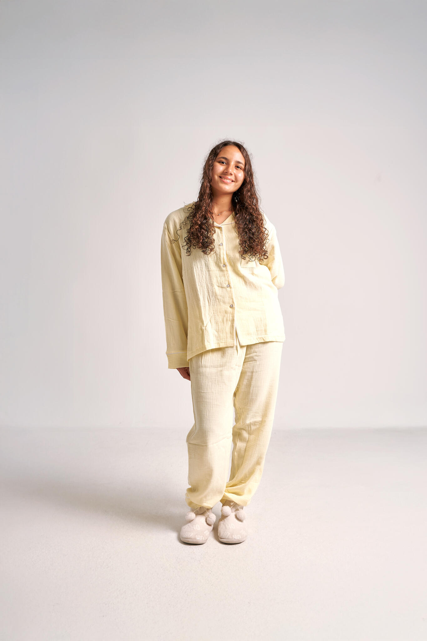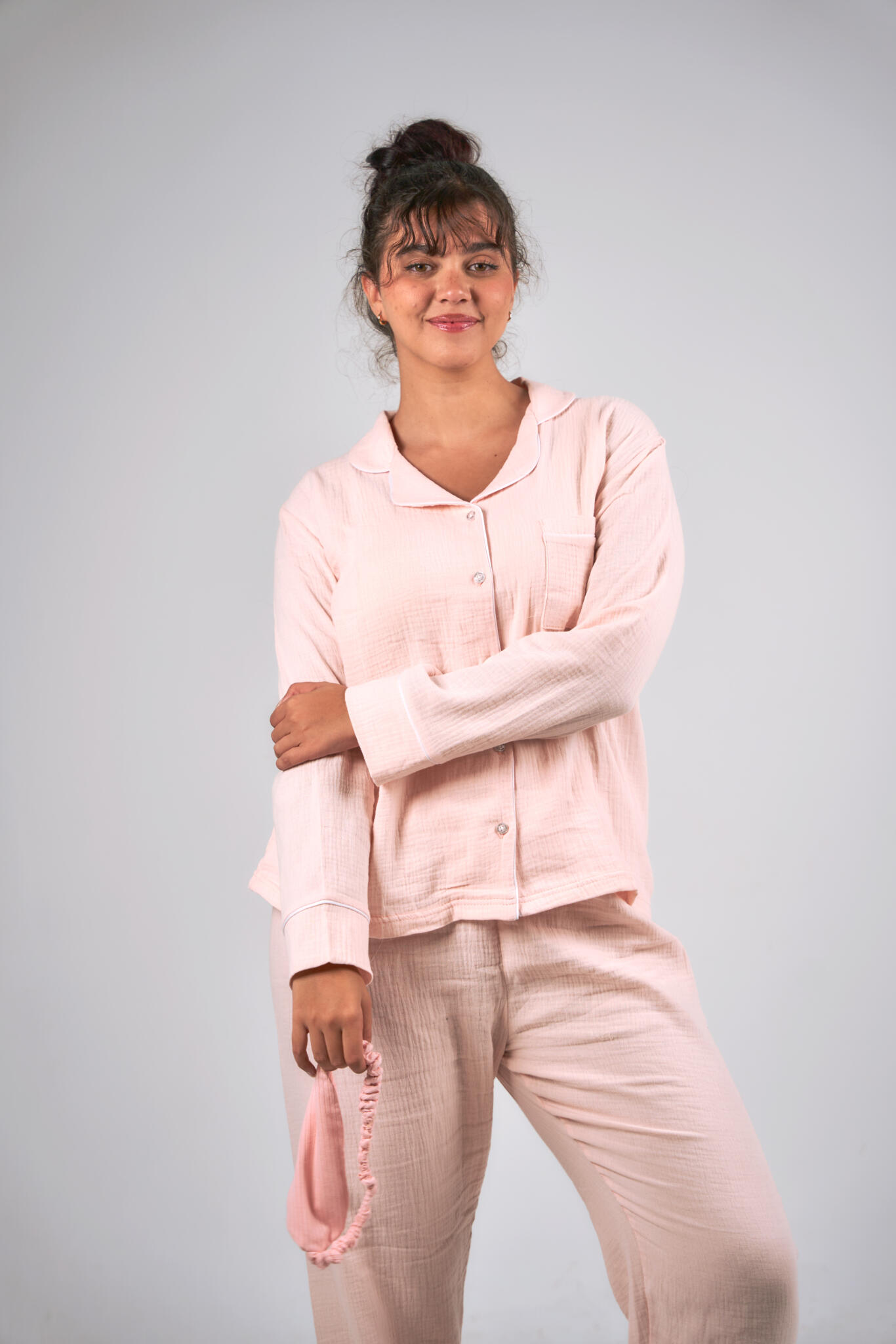 This pajama set has a light, airy cotton-gauze texture, very natural, breathable, and cozy.
