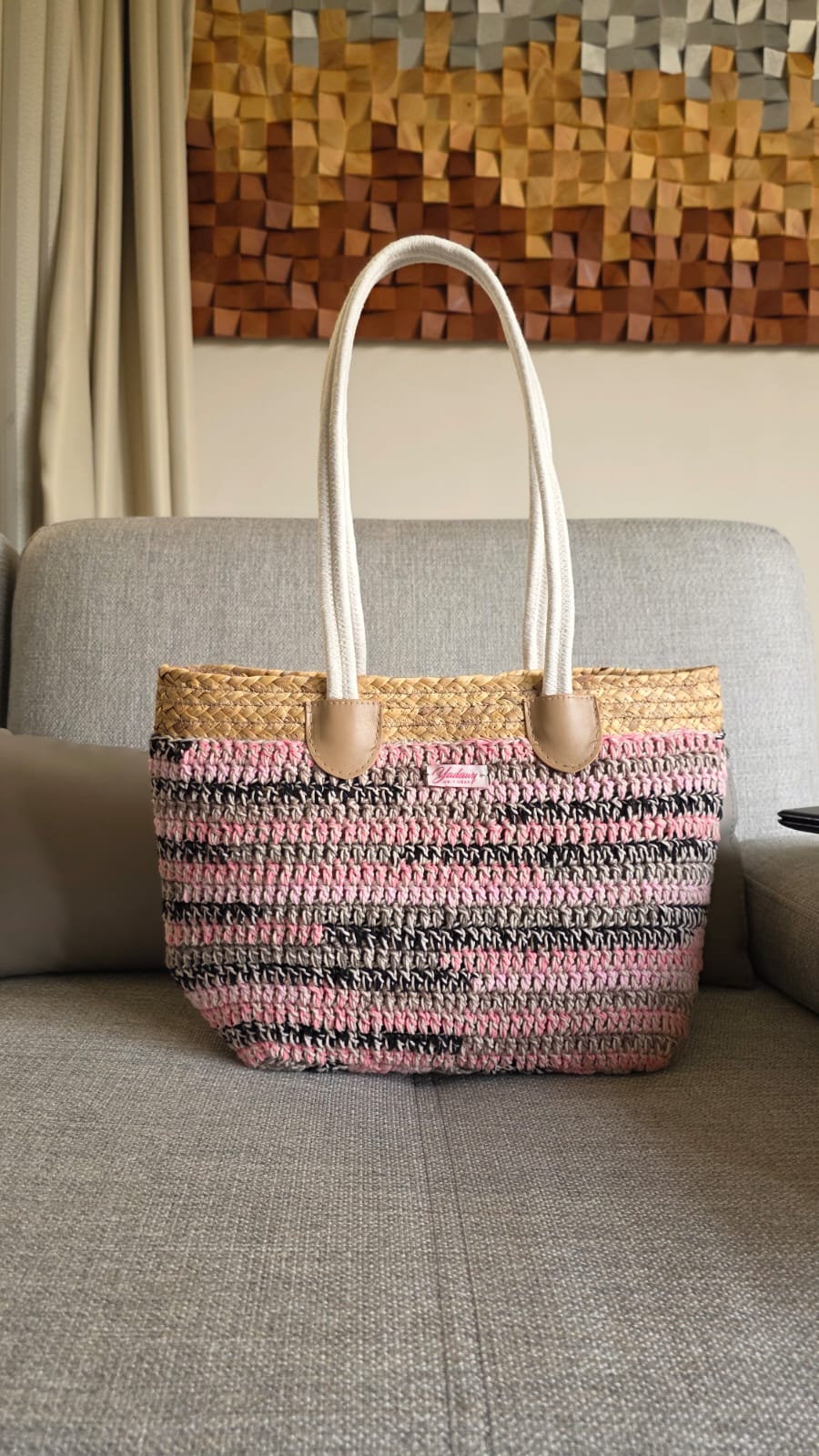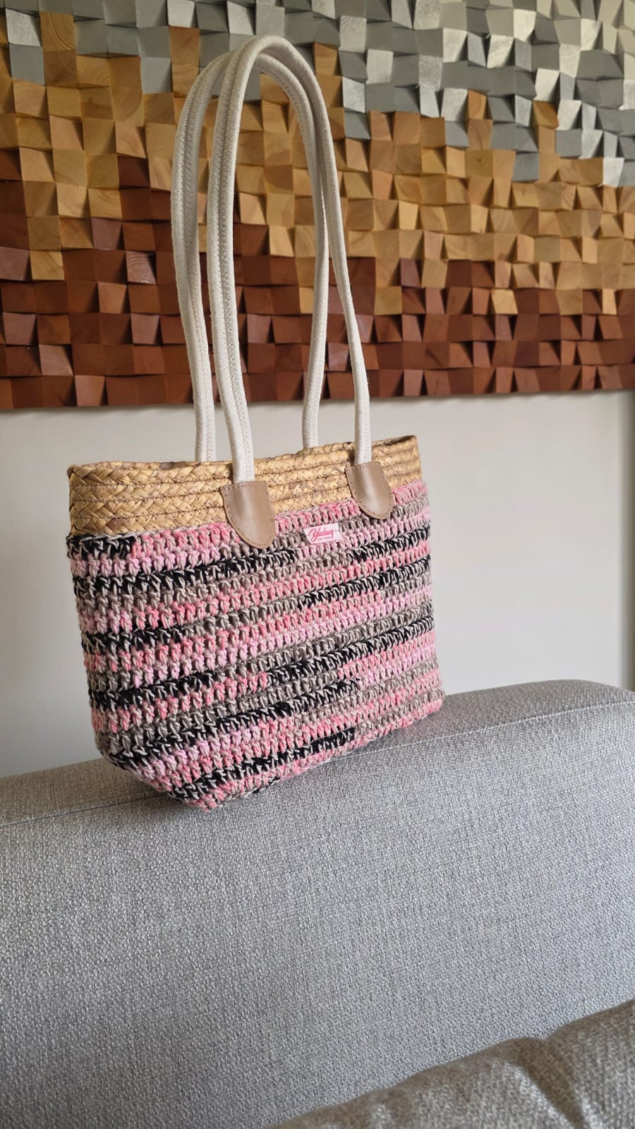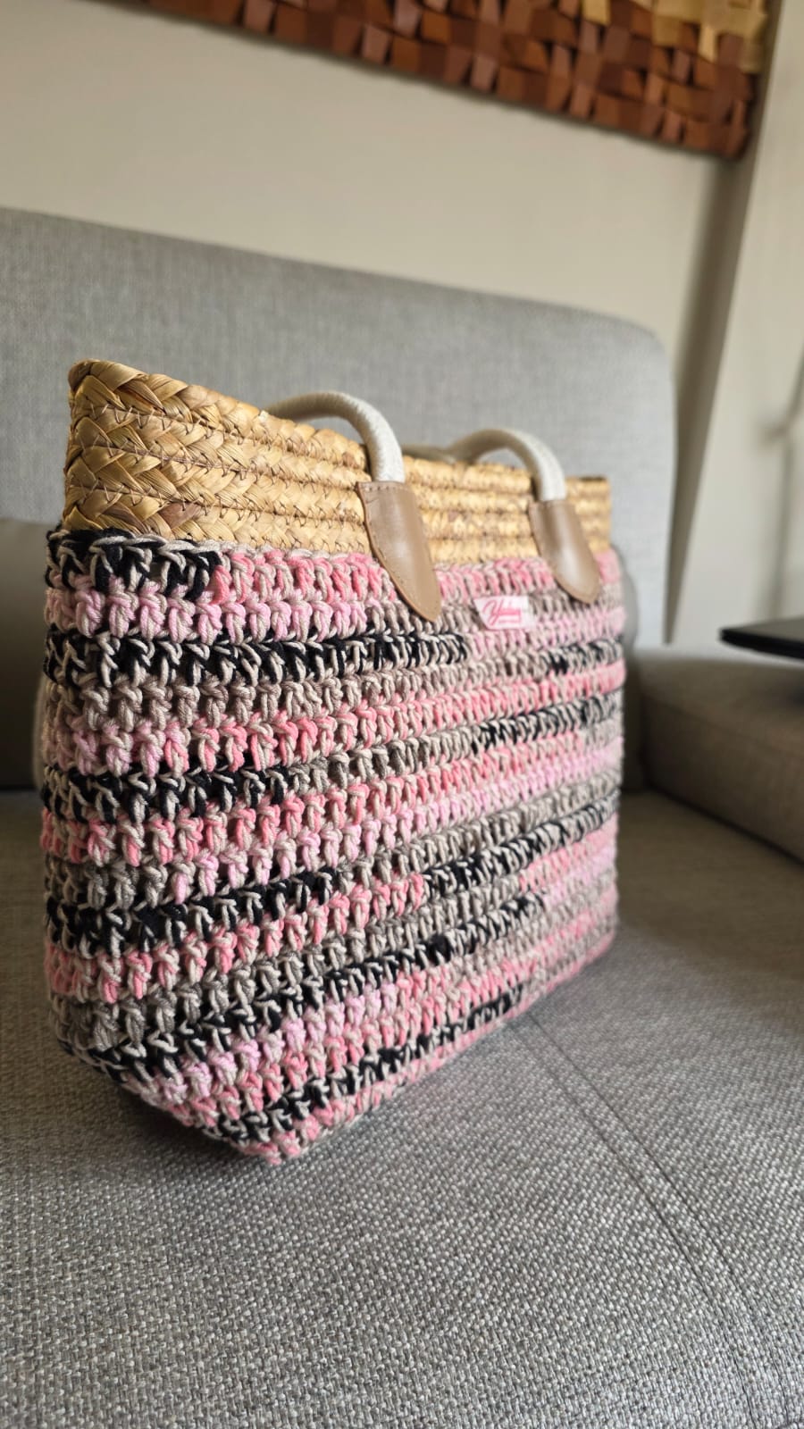 - The mix of pink, beige, and black with the natural straw top gives a warm, earthy yet playful vibe—like a sunset on the beach.