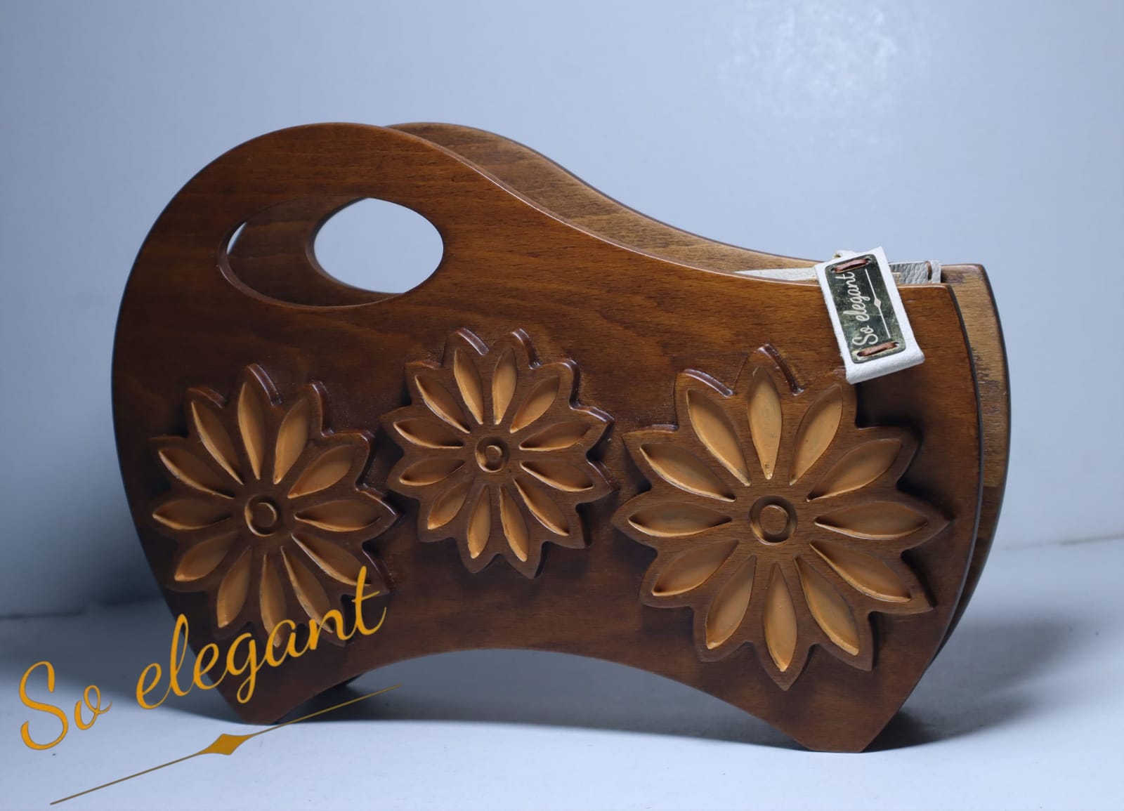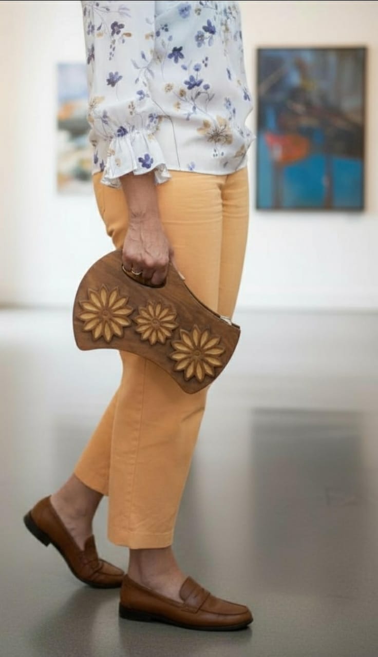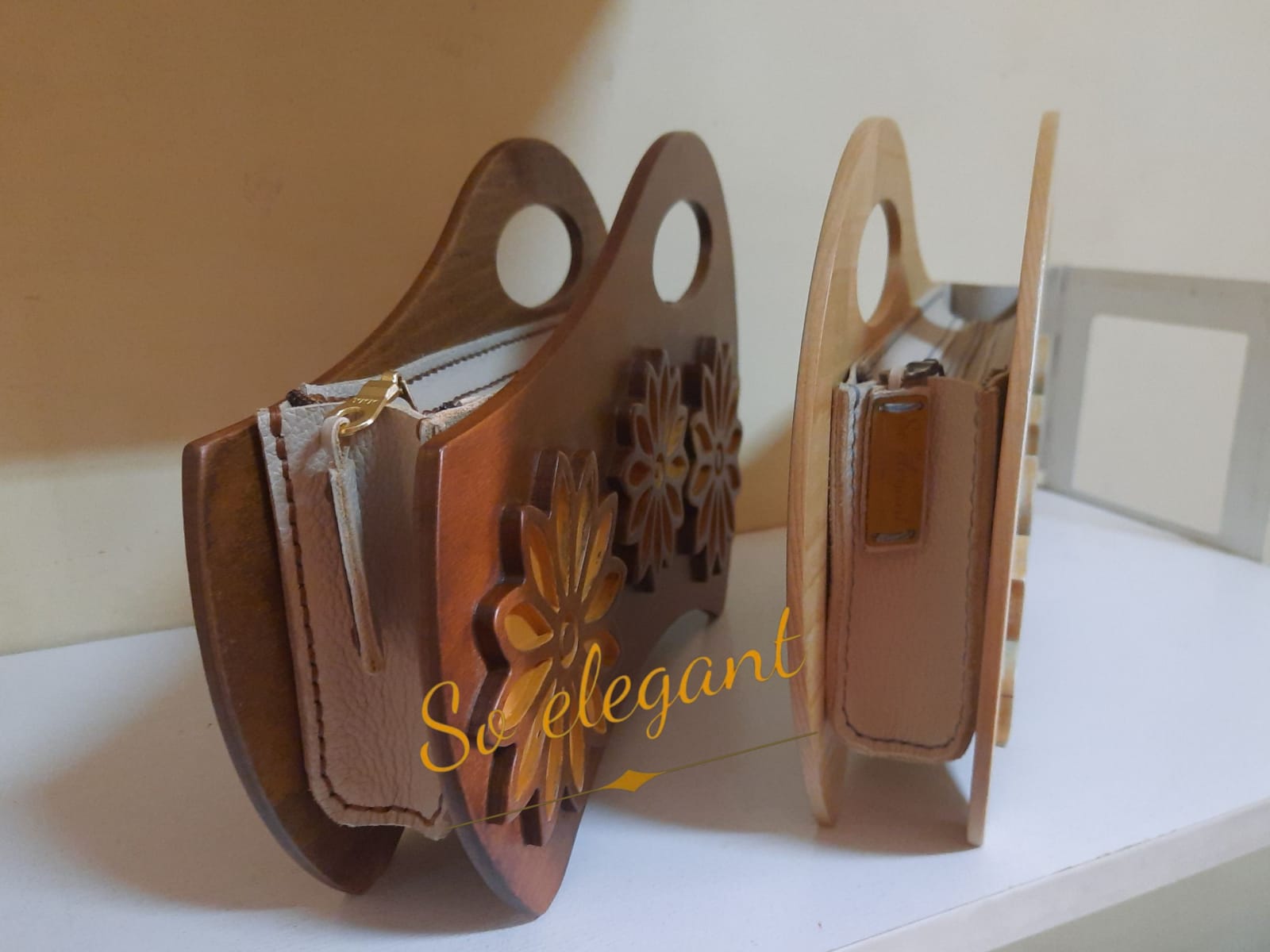 A one of a kind statement piecethat harmonizes natural elements {beech wood and natural leather} with high fashion..Designed to be held and admired. The solid feel of the wood meets the softness of theleather in a contrasting texture.