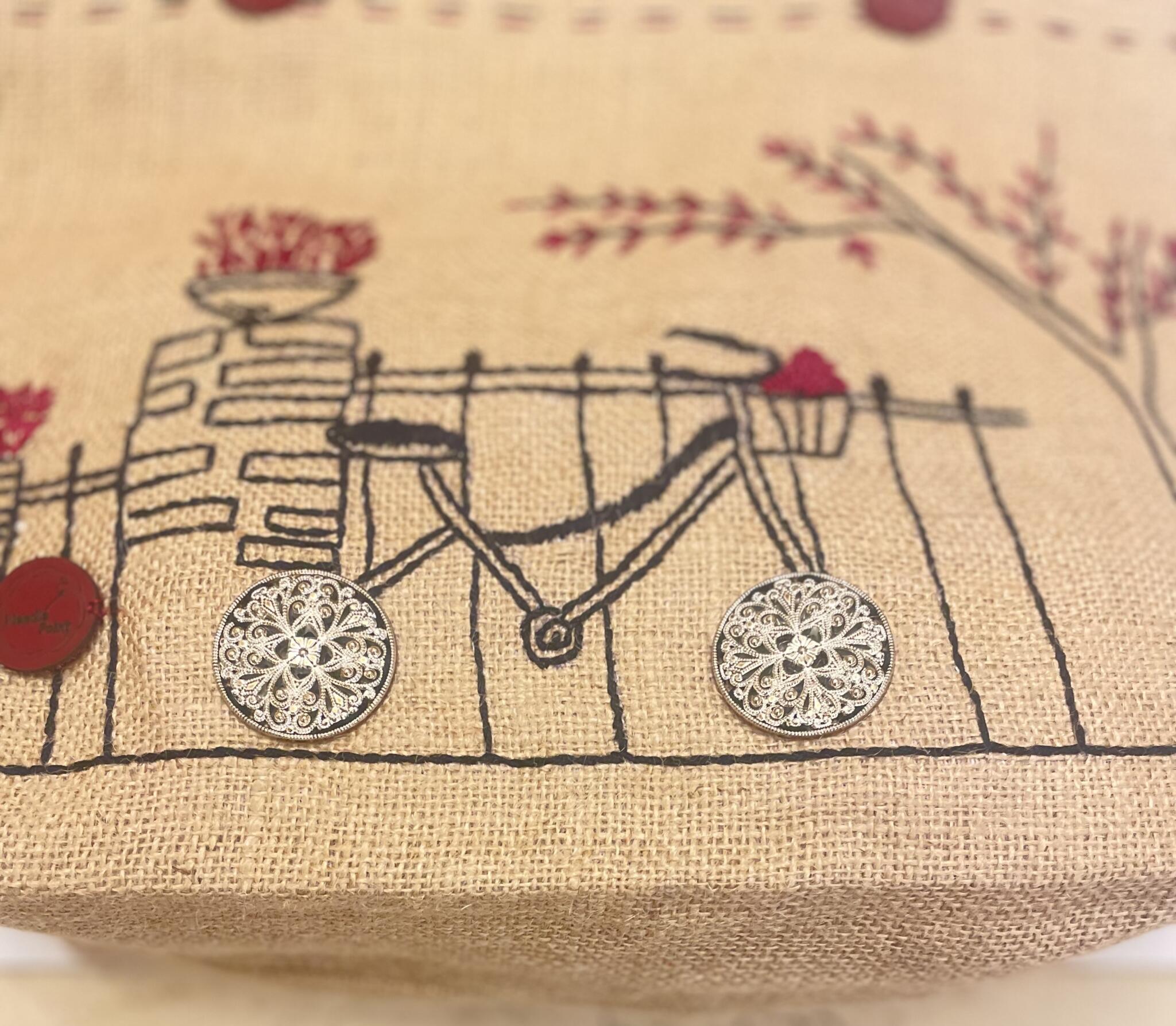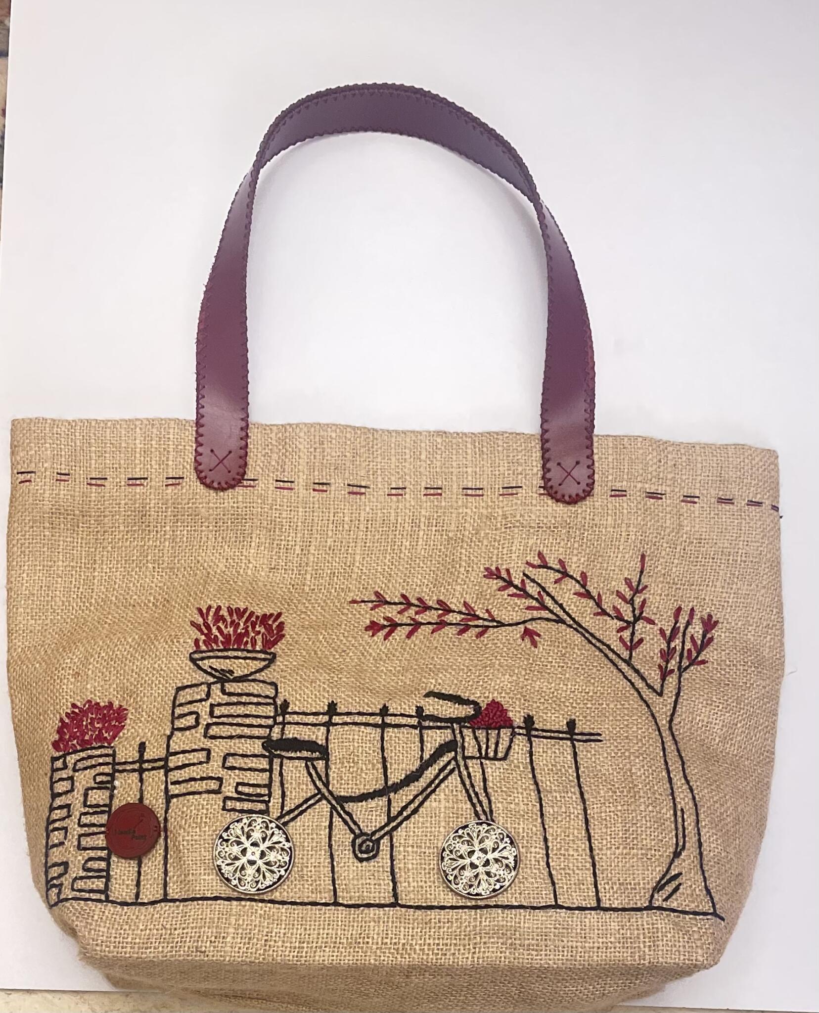 Burlap bag embroidered with a bicycle design using colorful threads.