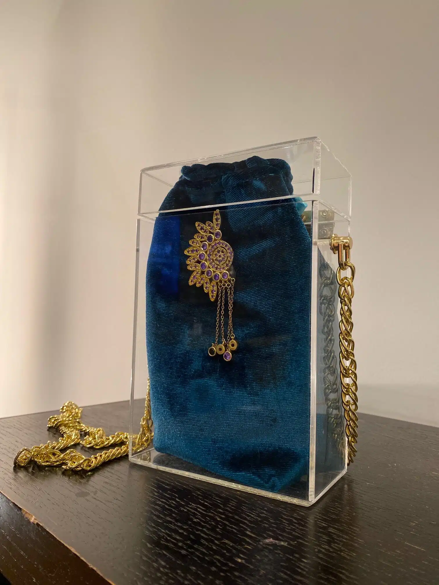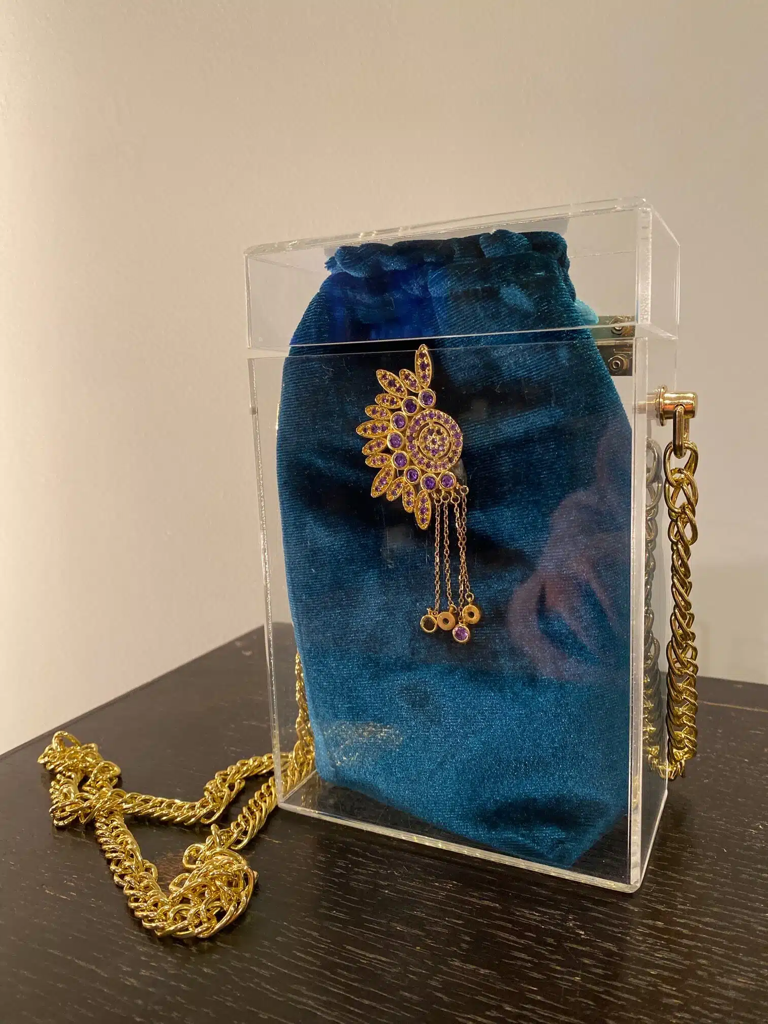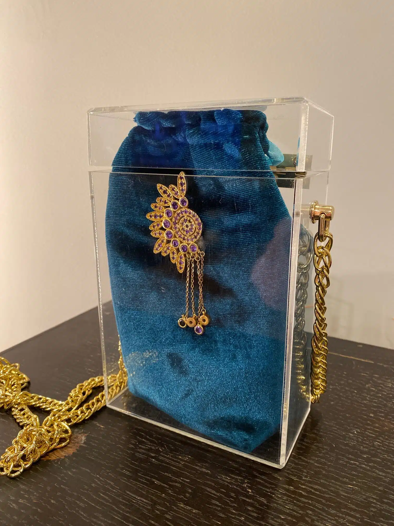 The Turquoise Crystal Plexi Box, designed in an Acrylic Plexi Box Skeleton , with inside Velvet Tailored Pull-string Pouch with satin inside-lining, & our signature Gold-Plated Piece embedded with purple color stones, by CH by Christine Habib Azer.