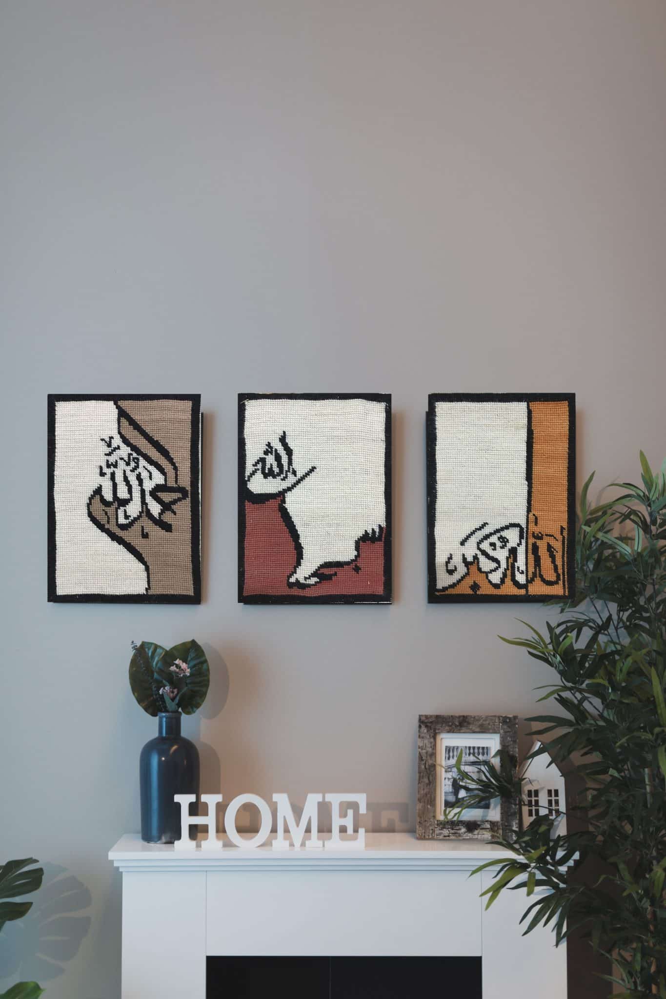 This triptych textile artwork beautifully blends Arabic calligraphy with contemporary abstract design. Each piece tells a unique visual story through intricate needlepoint embroidery, reflecting cultural heritage and artistic expression. The carefully selected color palette of earthy tones and contrasting shades enhances the depth and emotion of the composition. The artwork is a testament to craftsmanship, tradition, and modern aesthetics, making it a striking addition to any space.