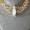 Gold plated copper choker with 3 layers of chains. It has 3 hooks to close the necklace at the back. The stone is over 14gm amethyst. This is custom made so a replica will not have the same stone.