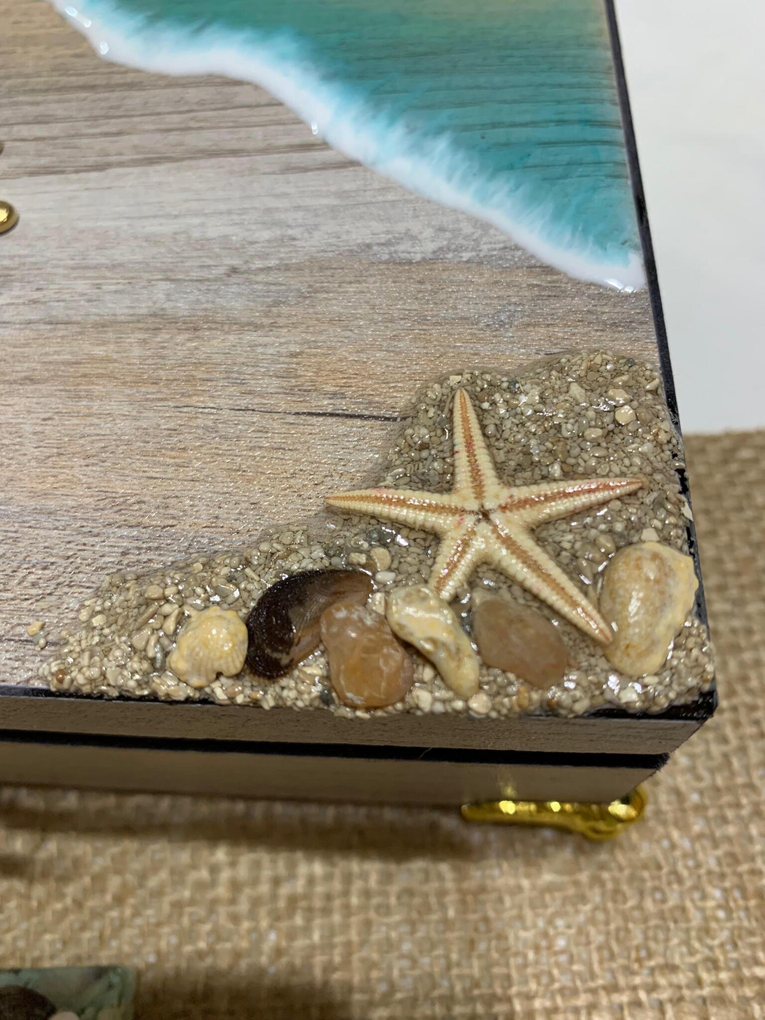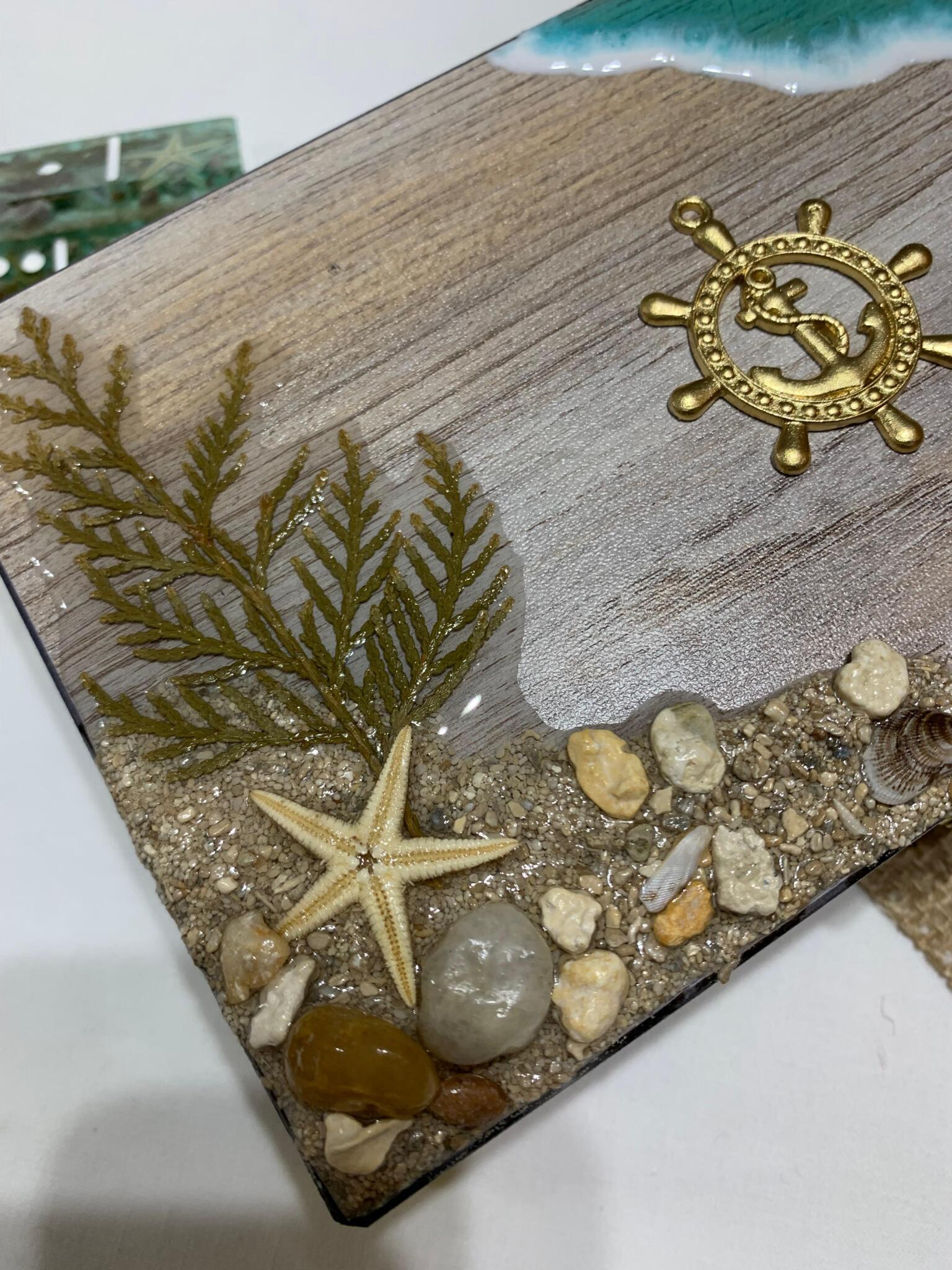 Design: Hand-poured resin “Ocean Wave” art with real sand and nautical accents.