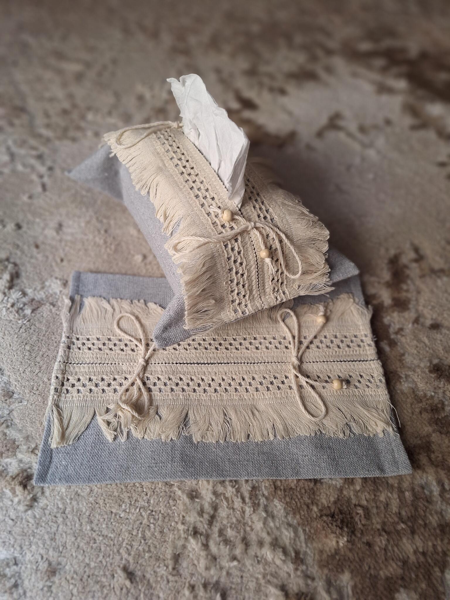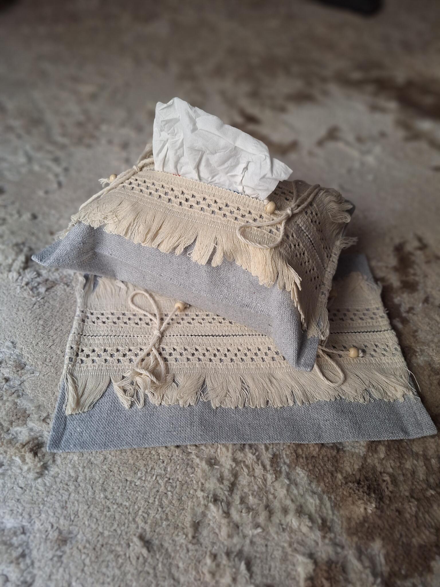 تيشو كفر بوهيمي راقي، معمول من خامة قماش تقيلة بجودة عالية، ومزين بشريط منسوج وشراشيب ناعمة بتدي إحساس بالدفا والنعومة في أي ركن يتحط فيه.