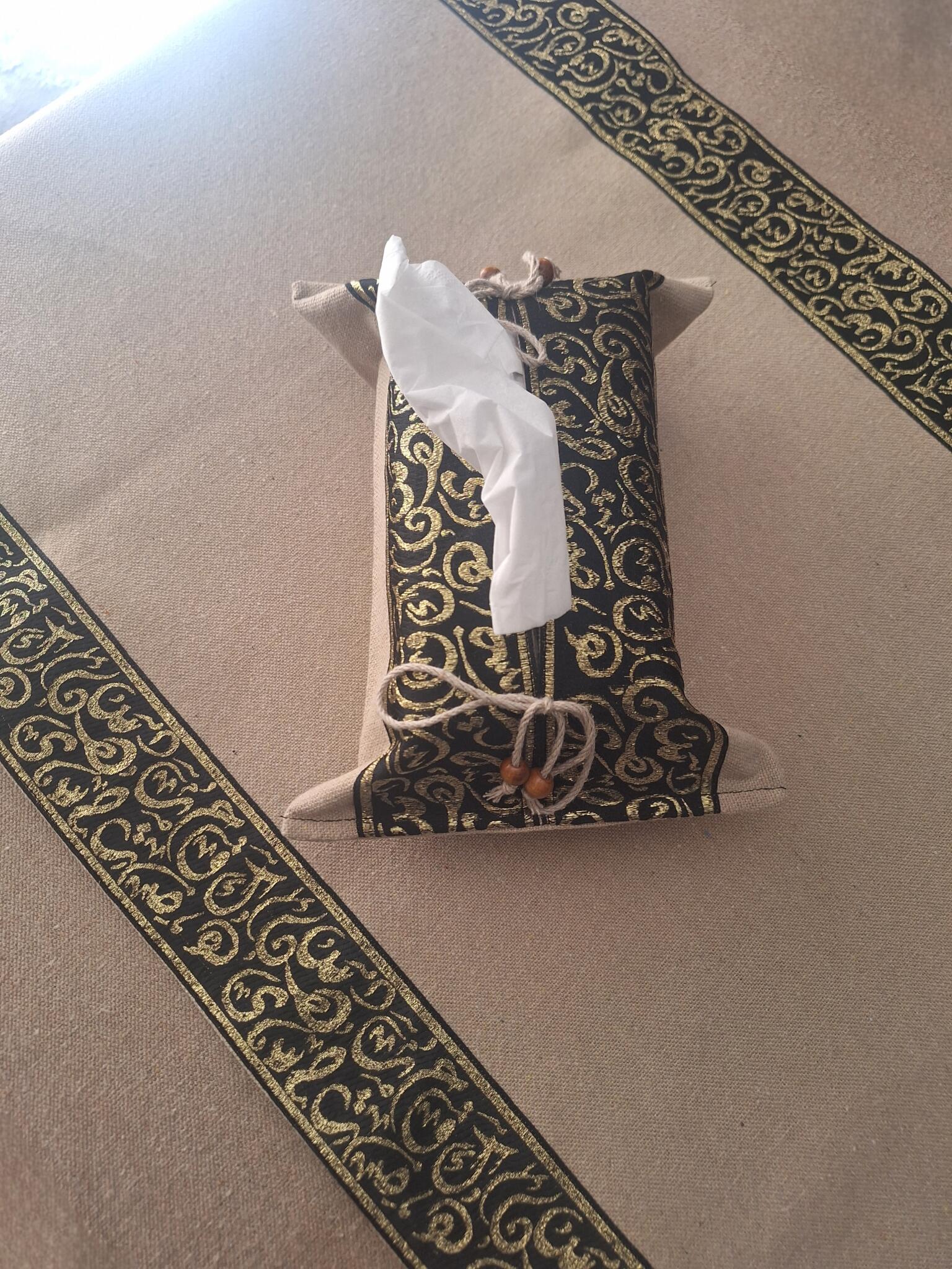Elegant handmade runner in beige with black borders beautifully embroidered with golden sarma thread forming Arabic letters — a perfect blend of heritage and elegance.