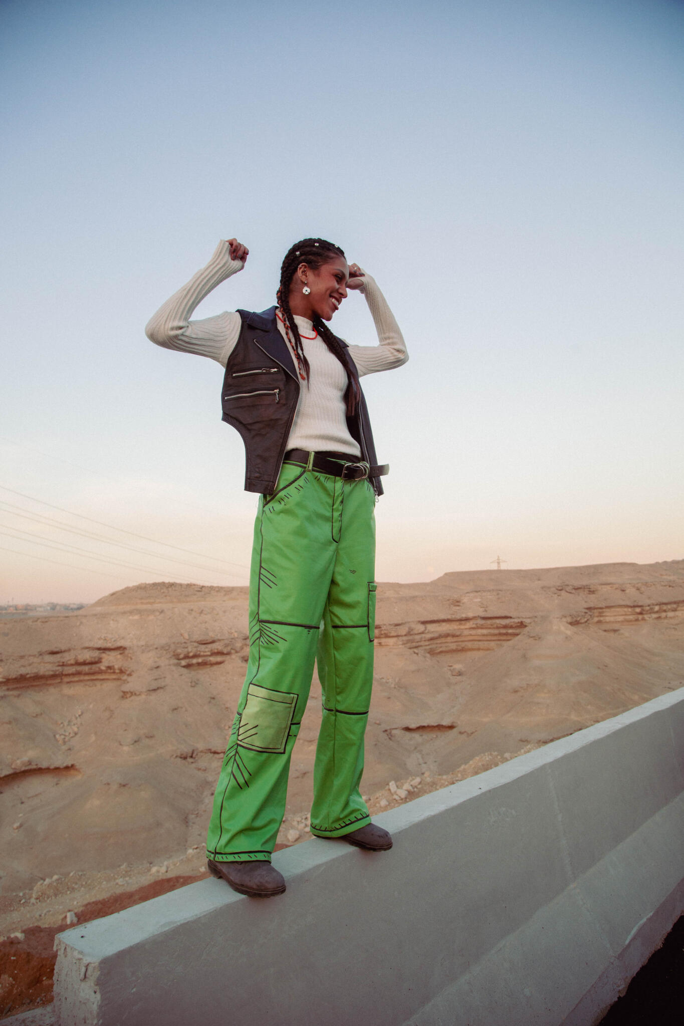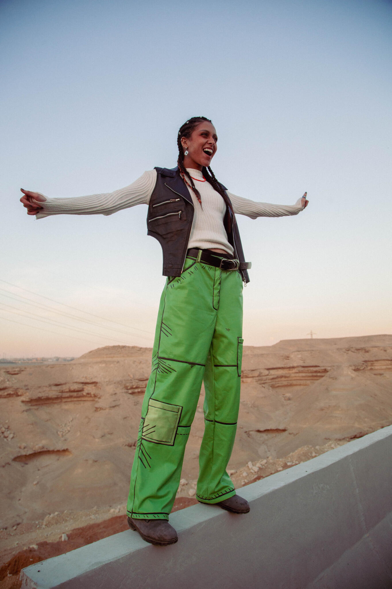 These kiwi-green pants reimagine comfort and style with a soft velvet lining and bold black 2D illustrations. A playful yet edgy piece that blends vibrant color with artistic detail.