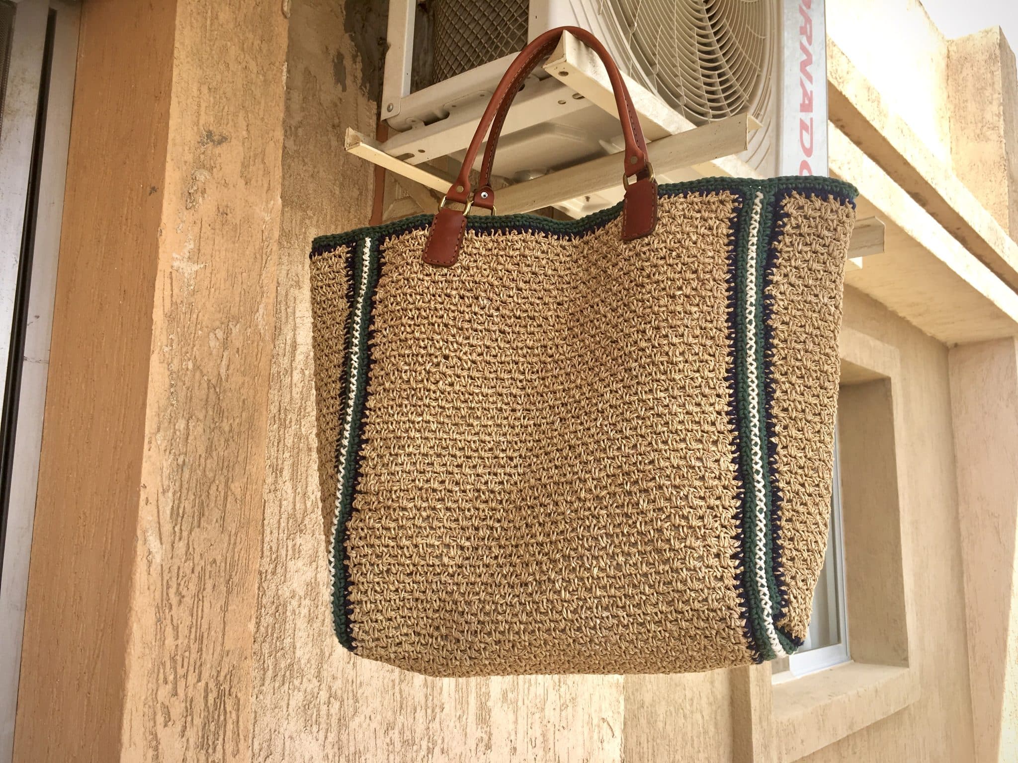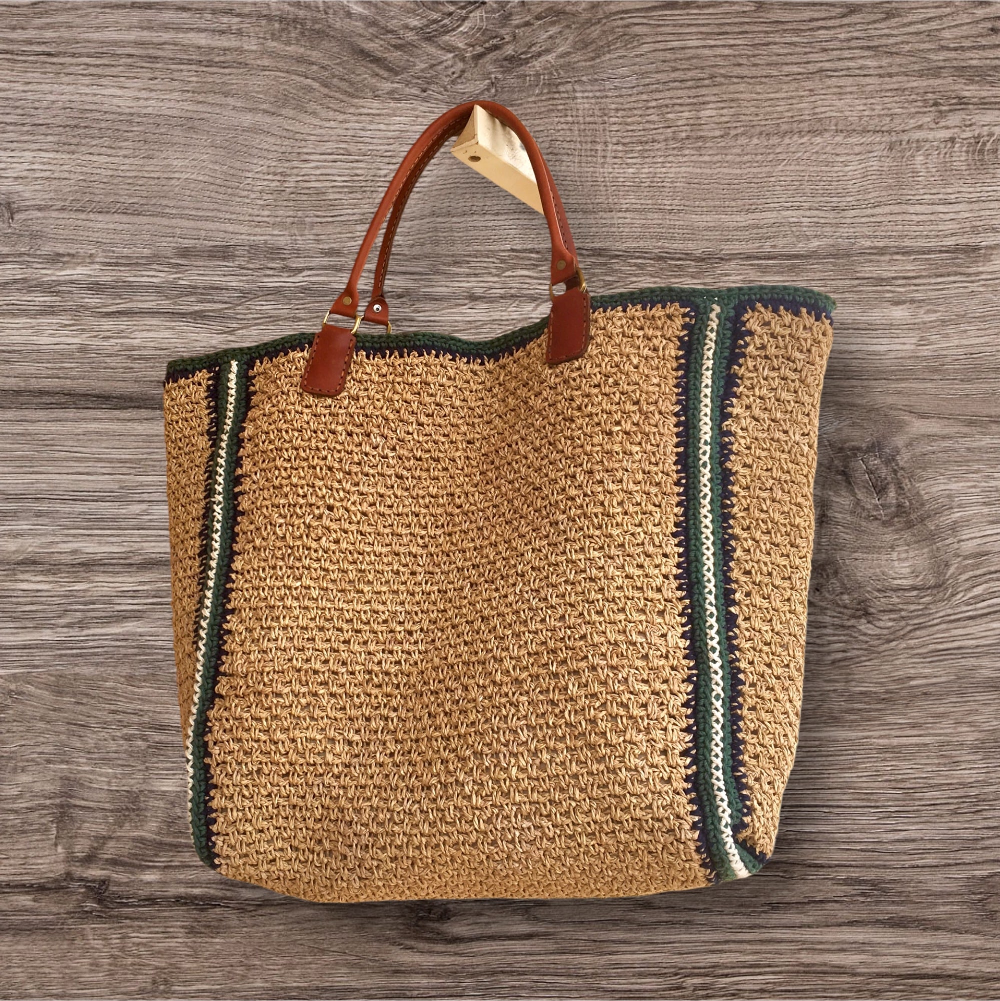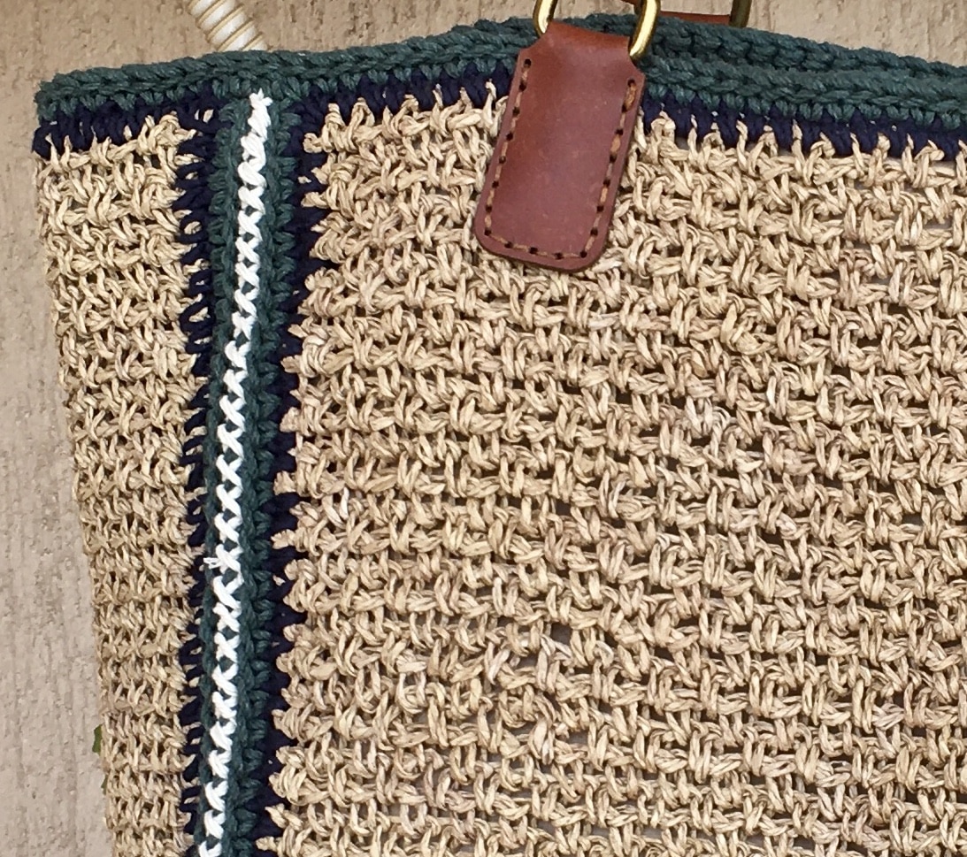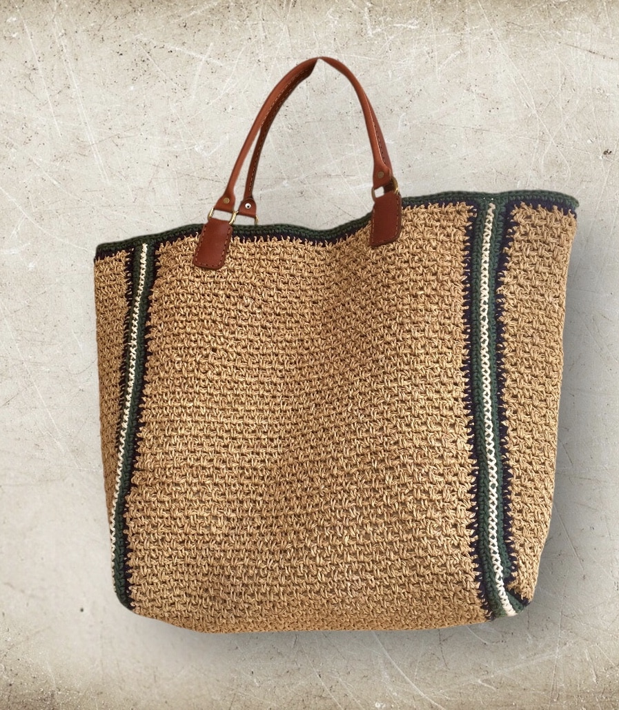 Big tote bag made of Turkish Rafai yarn , base color is Beige and contour with dark blue and green colors