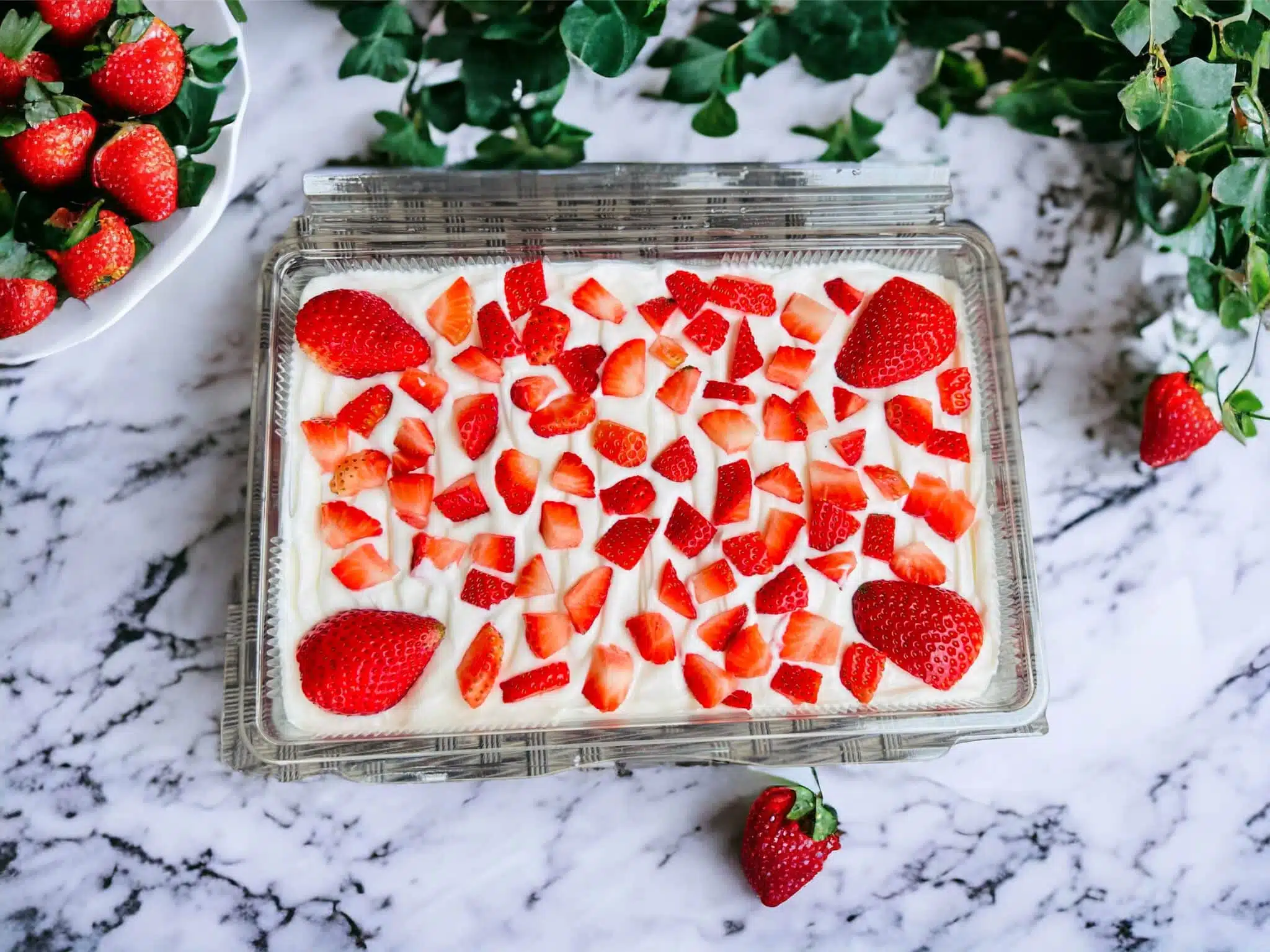 Vanilla cake soaked in 3 different milk, topped with fluffy cream and topped with your preferred topping (strawberry or Caramel)