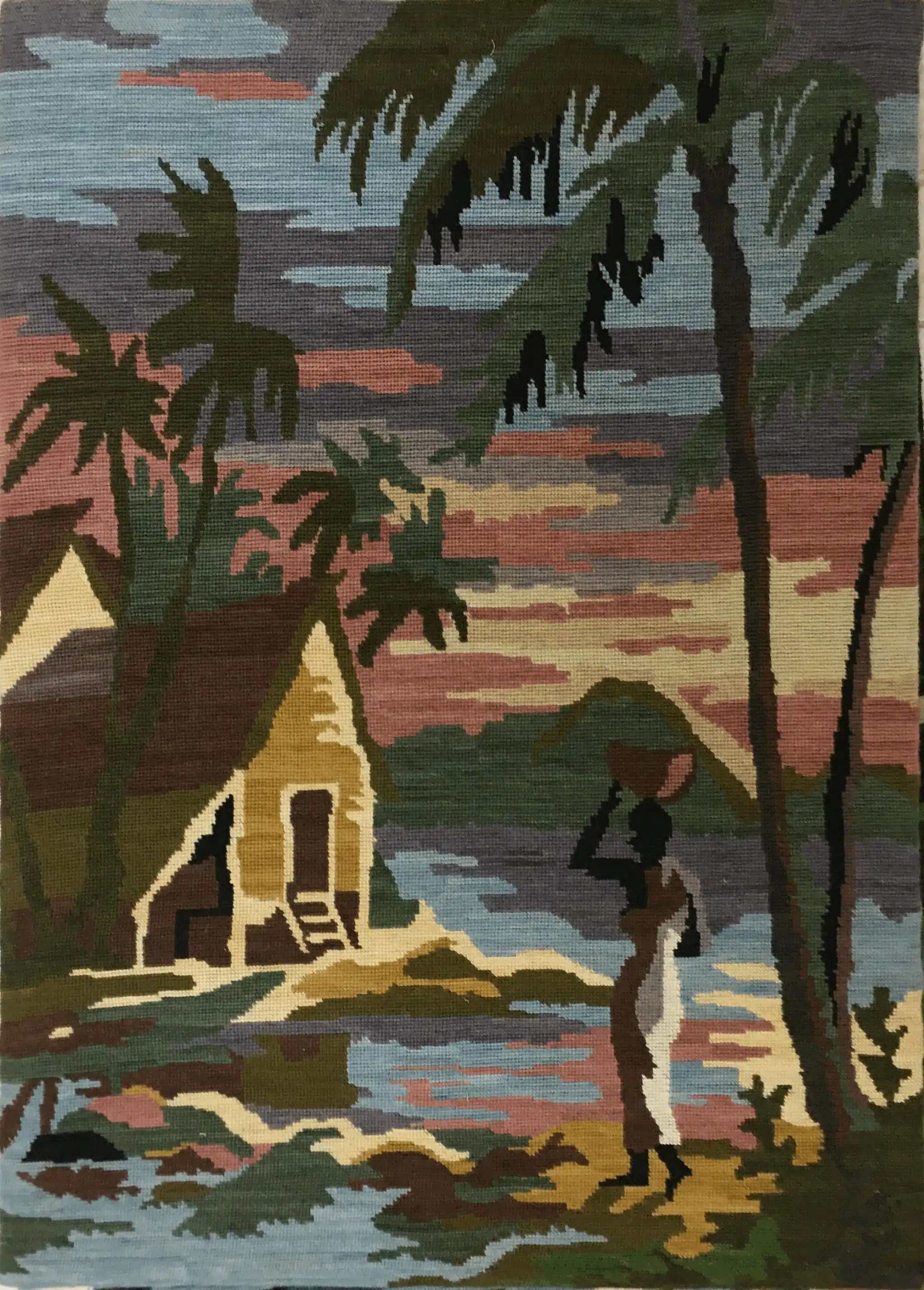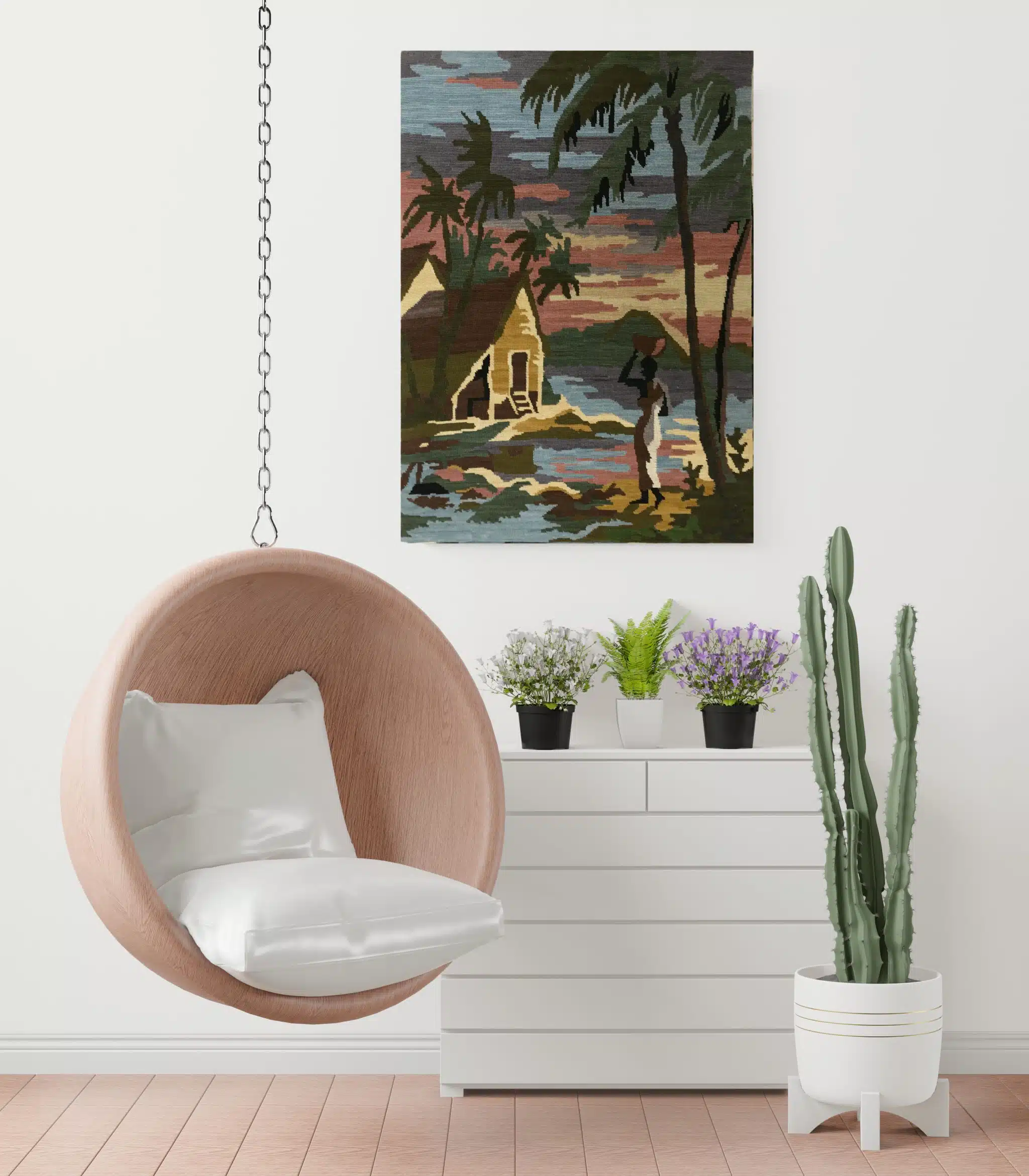 This vibrant handmade textile depicts a serene tropical village scene at sunset. The artwork features palm trees swaying in the breeze, a traditional hut, and a silhouette of a woman carrying a basket, set against a colorful sky with hues of orange, pink, and blue. The natural surroundings, including water and lush greenery, enhance the idyllic and tranquil atmosphere.