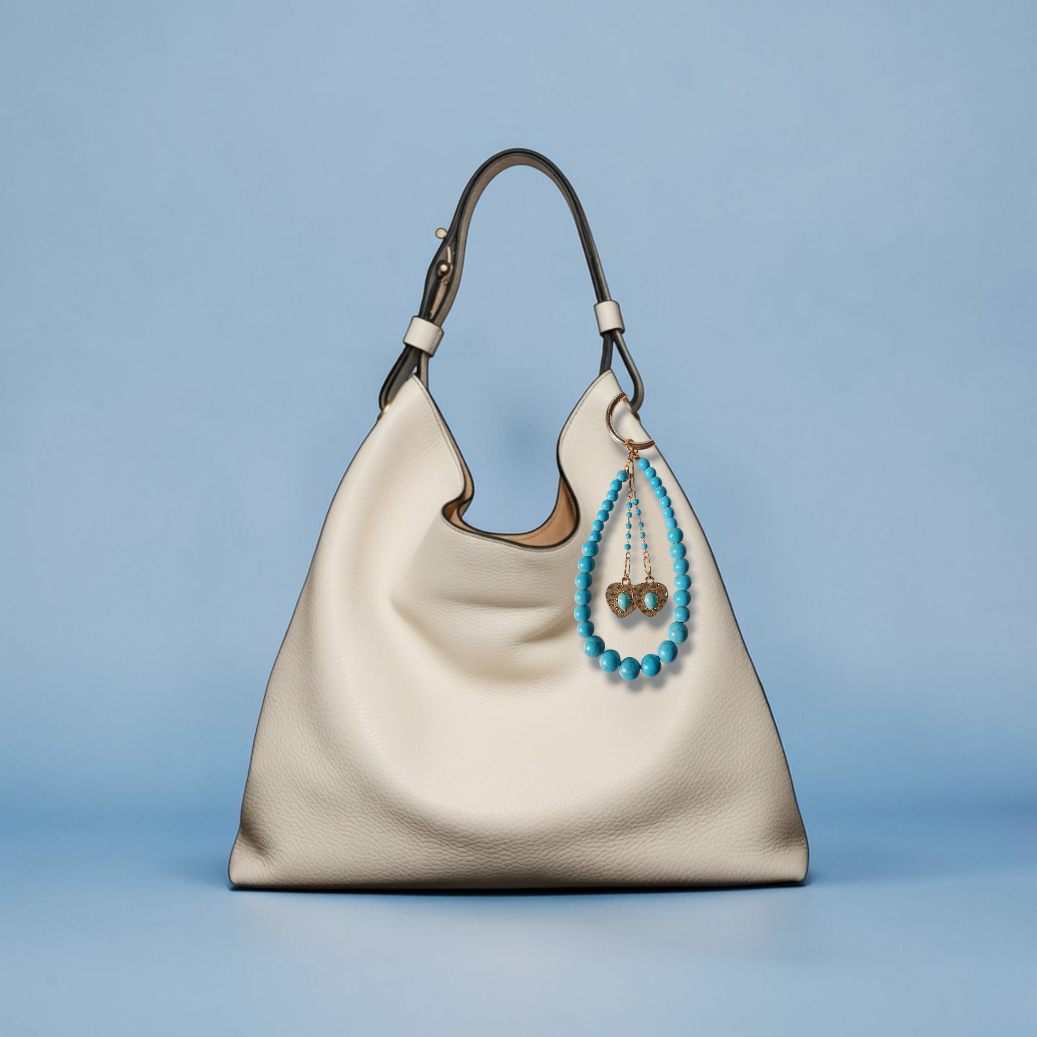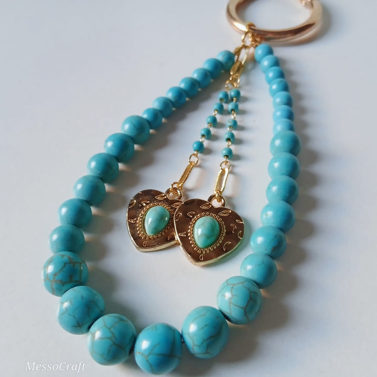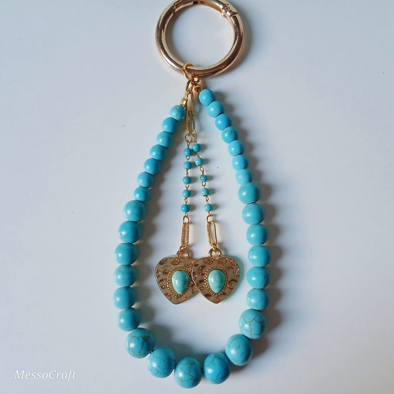 Bag charm | key chain made of blue Turquoise stones beads in several sizes and 2 tiny chains with 2 pendant on the shape of heart with a blue Turquoise gemstone