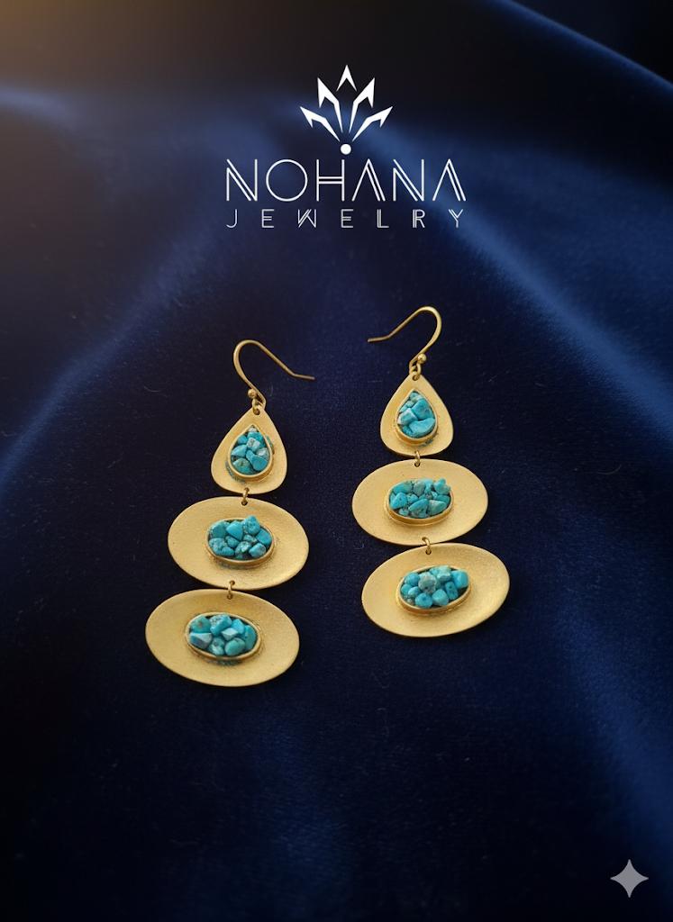 These elegant Nohana Jewelry earrings feature cascading gold discs accented with vibrant turquoise stones. The mix of teardrop and oval shapes creates a graceful, handcrafted look that beautifully contrasts against the warm gold tones.