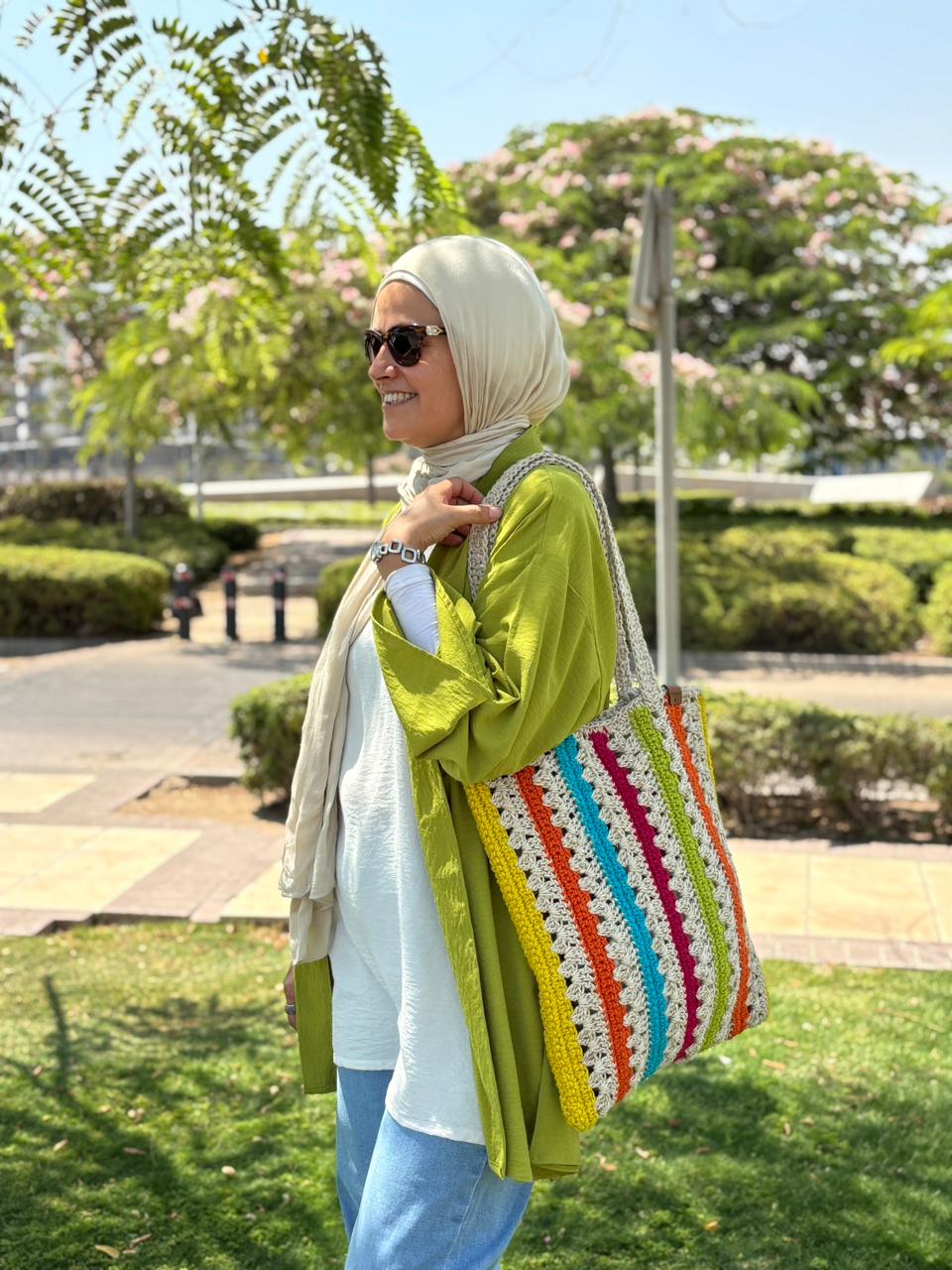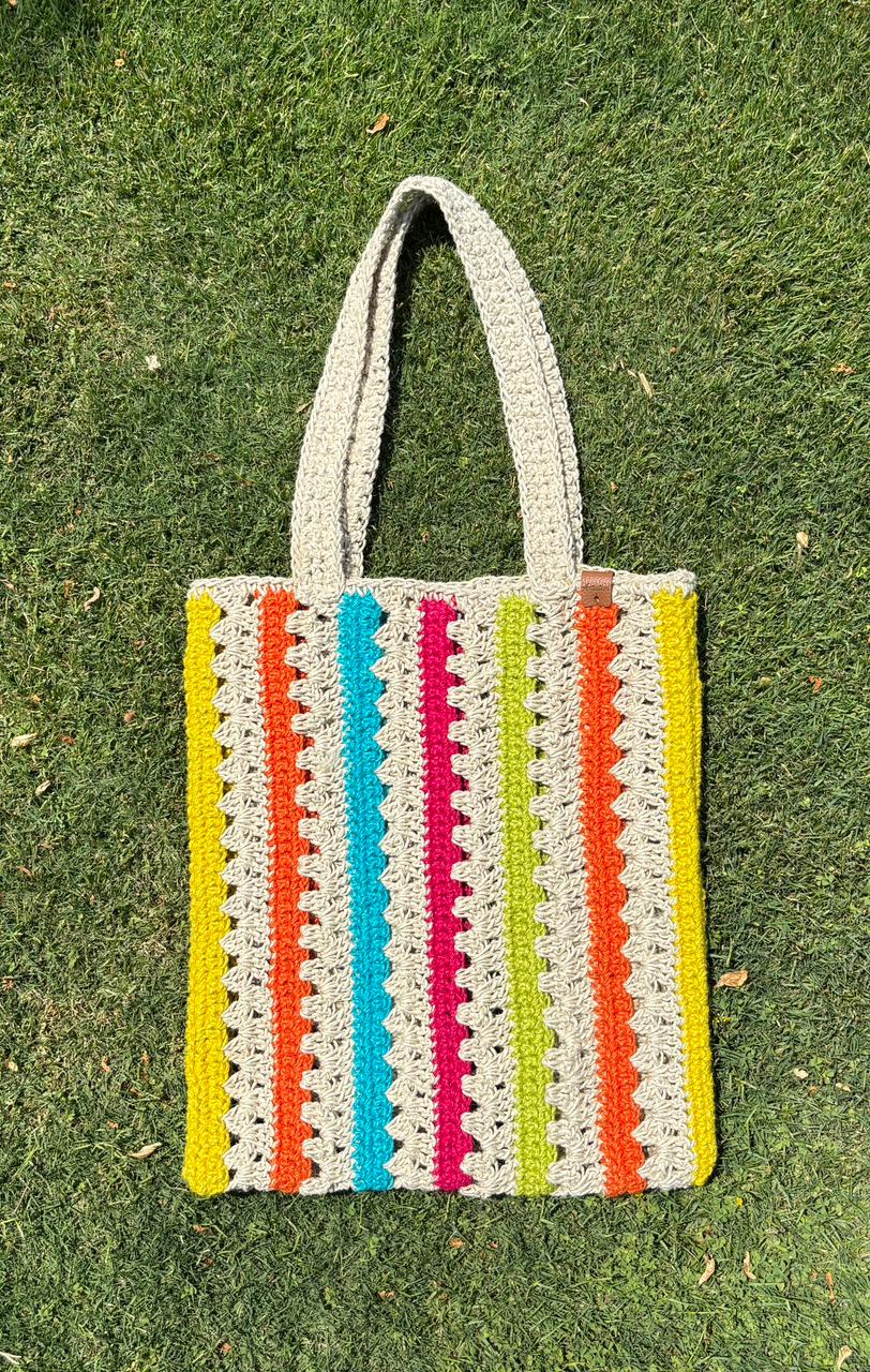 Brighten your day with this eye-catching crocheted bag! It features bold vertical stripes in a rainbow of colors against a natural beige background, offering a fun and functional accessory.