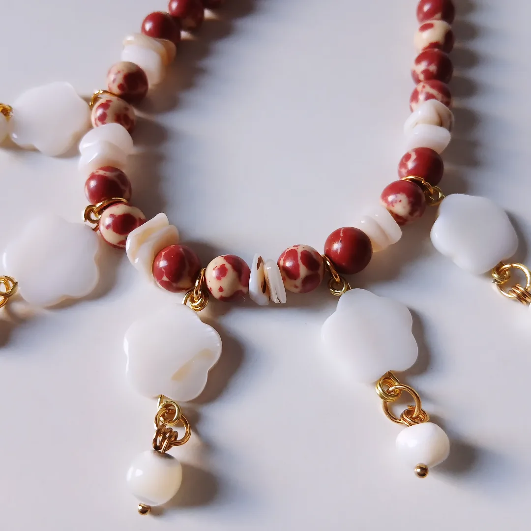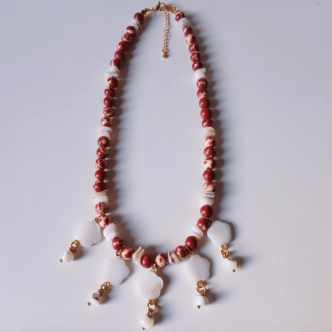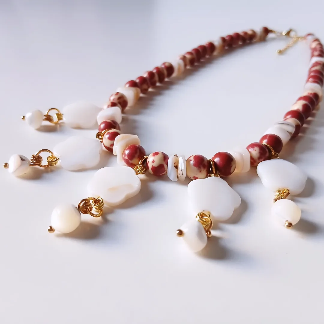 Necklace made of casper and fayrouz and seashell stones in umber and creamy colours with seashell beads in the shape of flowers