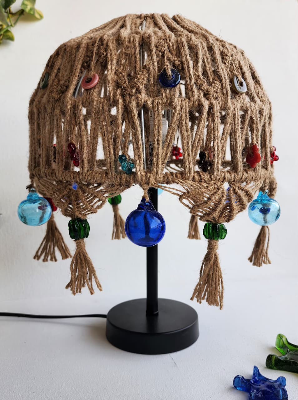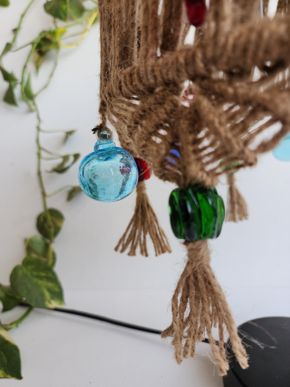 Colors: Coffee jute rope and multi color glass charms ( red, blue , light blue , orange and honey yellow ).