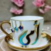 An elegant porcelain mug featuring a hand-painted Arabic name in turquoise and navy tones, finished with luxurious gold details and delicate crystal accents. Comes with a matching saucer, making it perfect for gifts, bridal trousseaus, or adding a refined touch to your coffee moments.