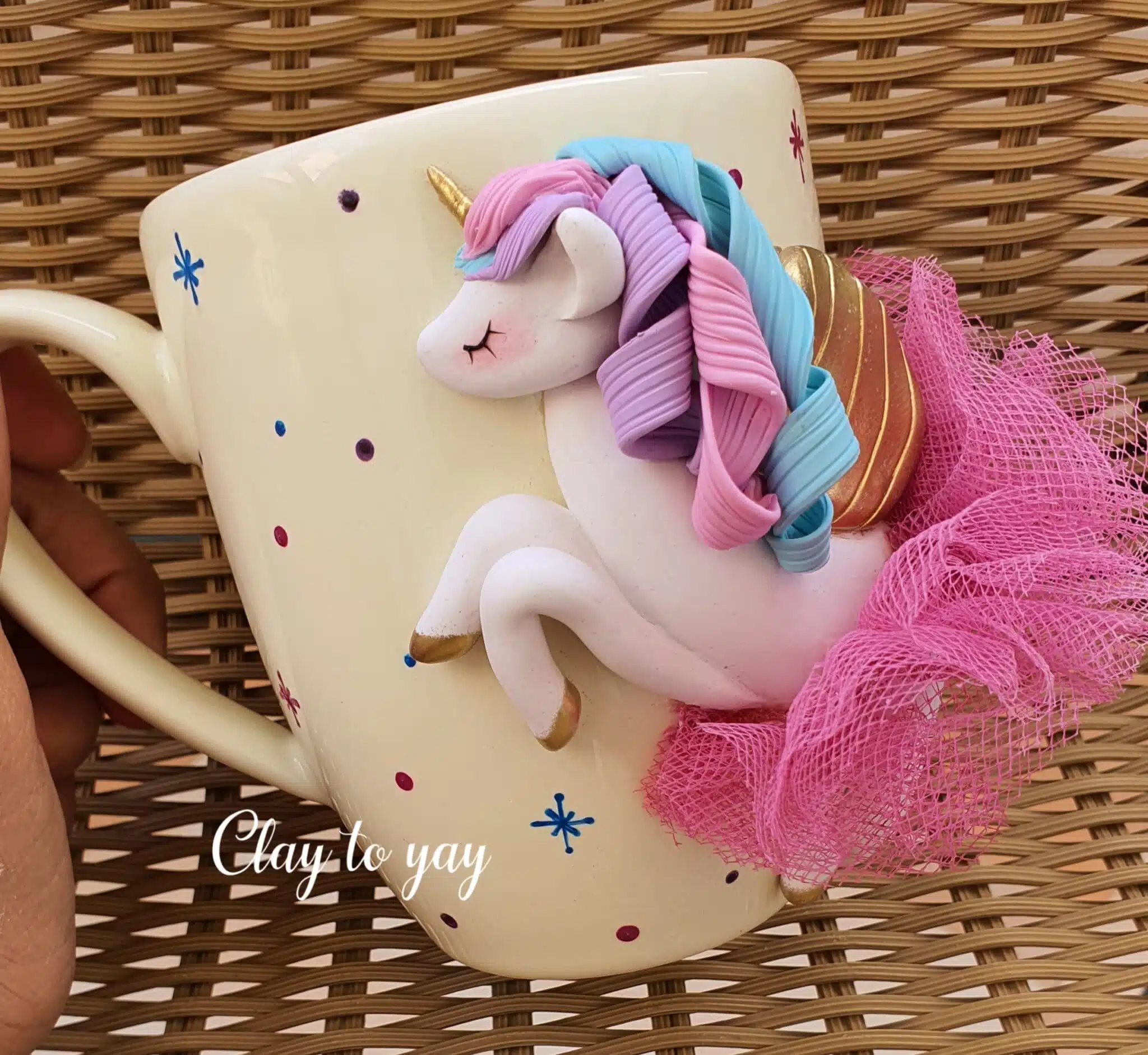 Porclain mug with a unicorn design made of polymerclay