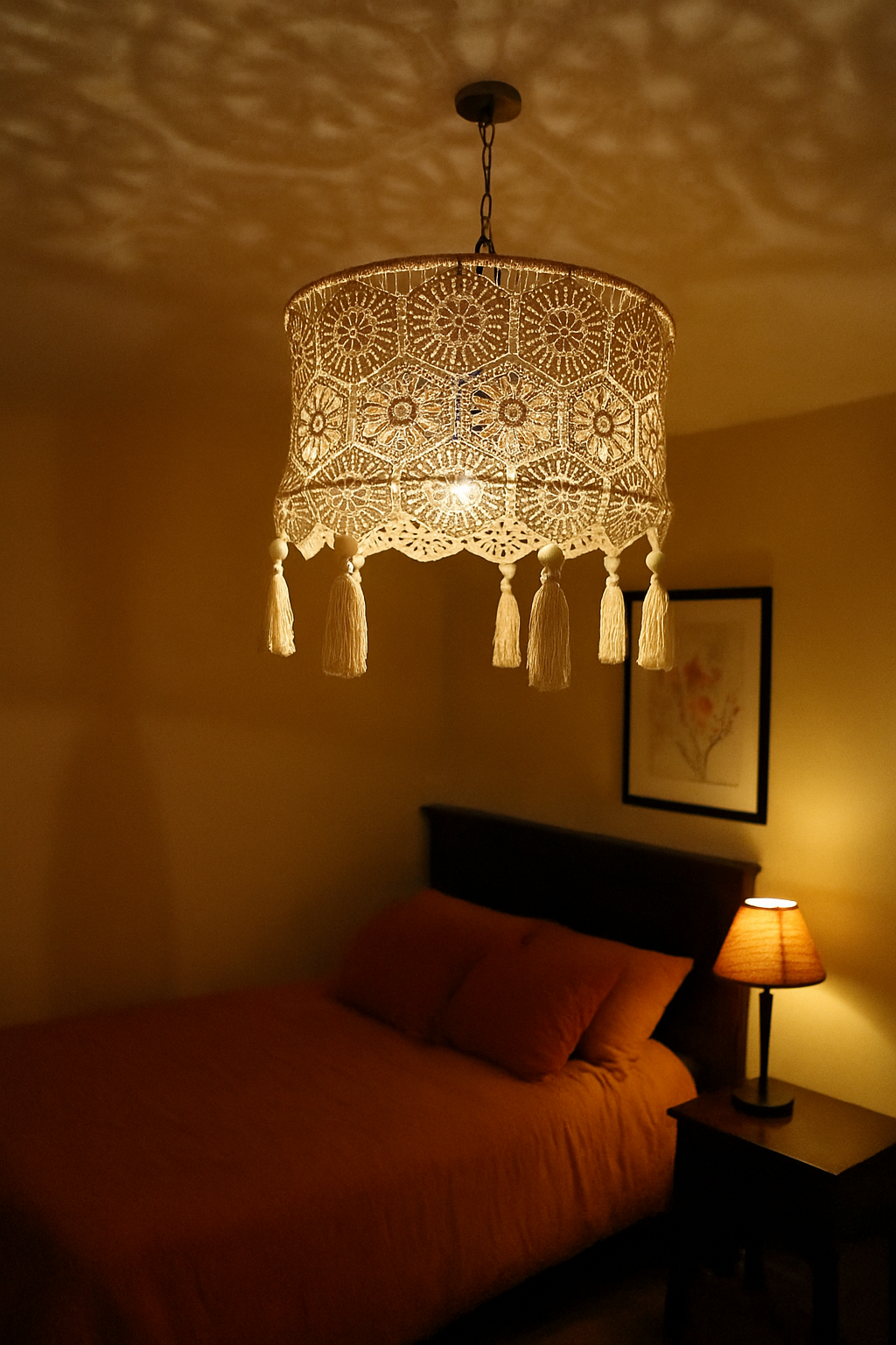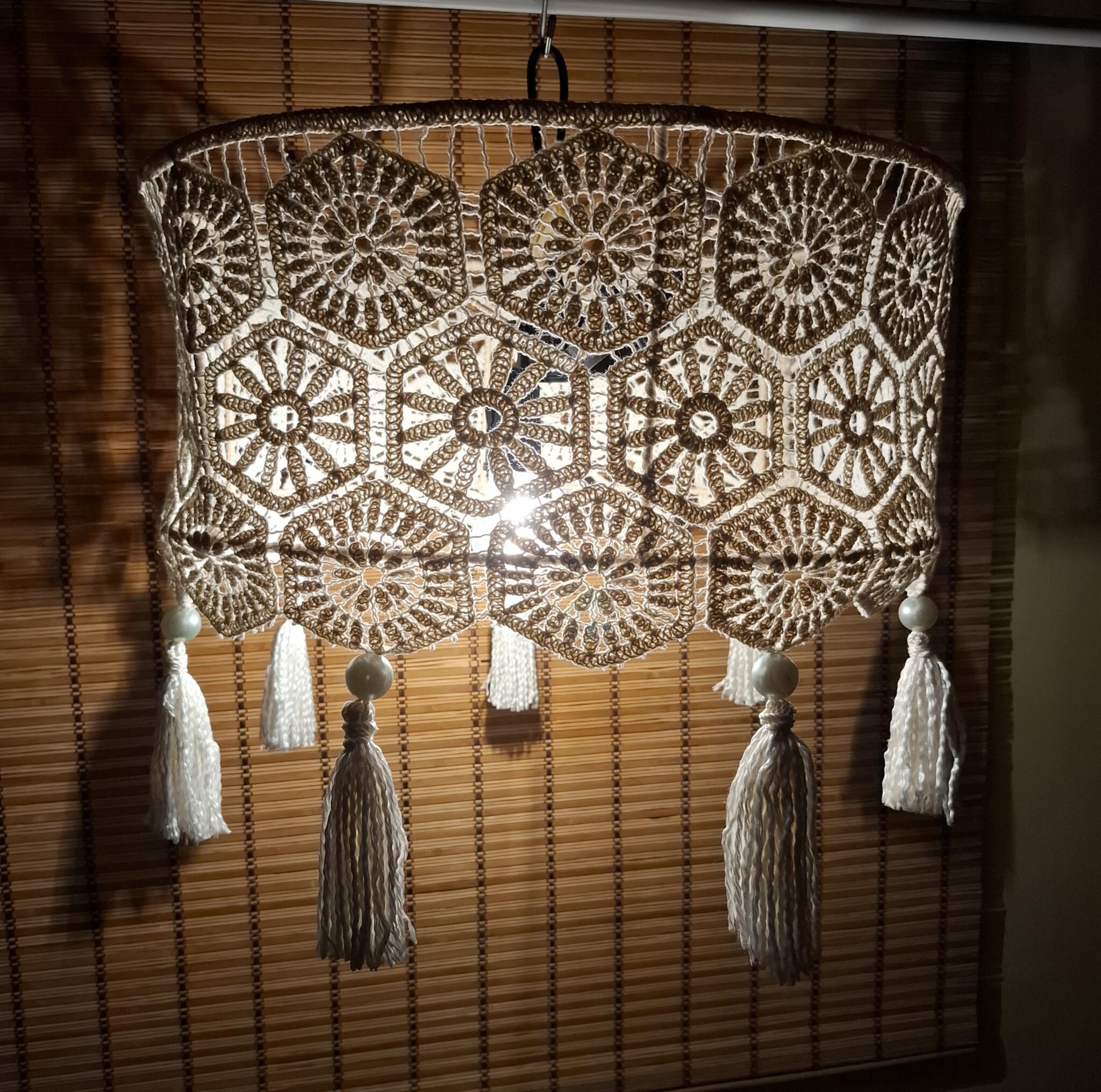 Delicate craftsmanship meets timeless elegance in the Vintage Bloom Crochet Lampshade. Featuring intricate floral hexagonal motifs hand-crocheted with fine cotton thread, this piece adds a soft, vintage charm to any room. Ideal for cozy lighting in living rooms, bedrooms, or reading nooks, it brings a handcrafted warmth and a nostalgic touch to your interior decor.