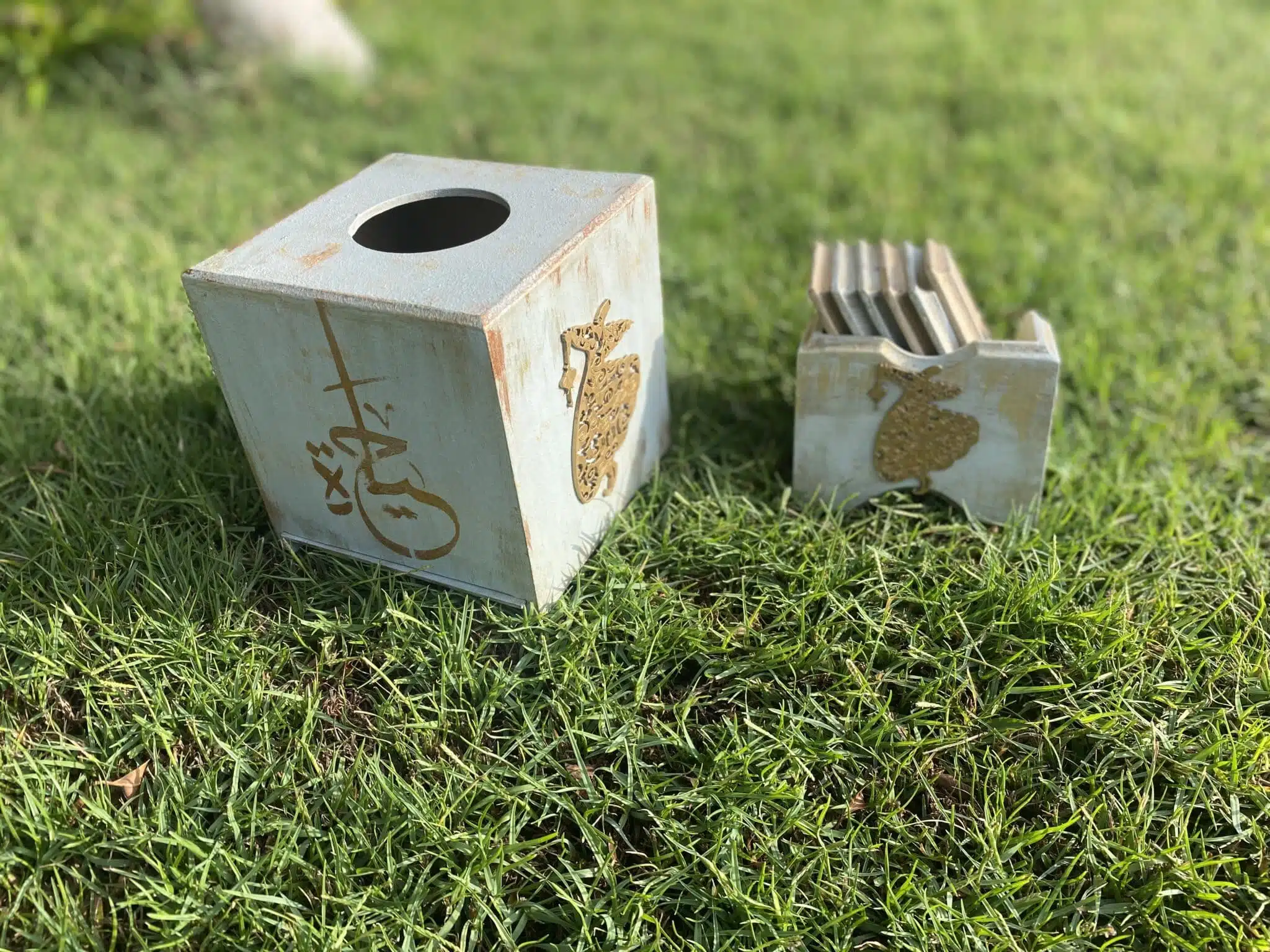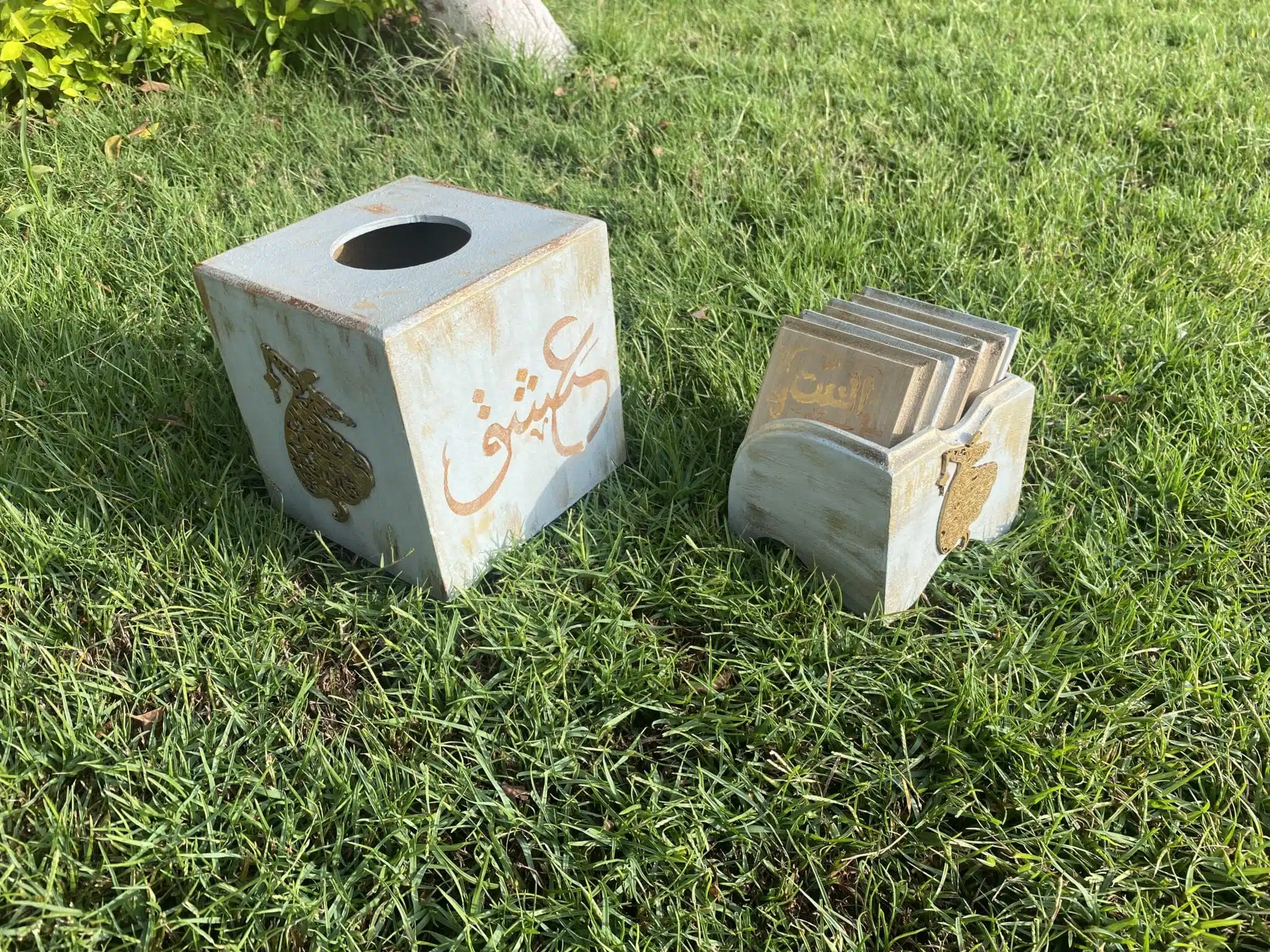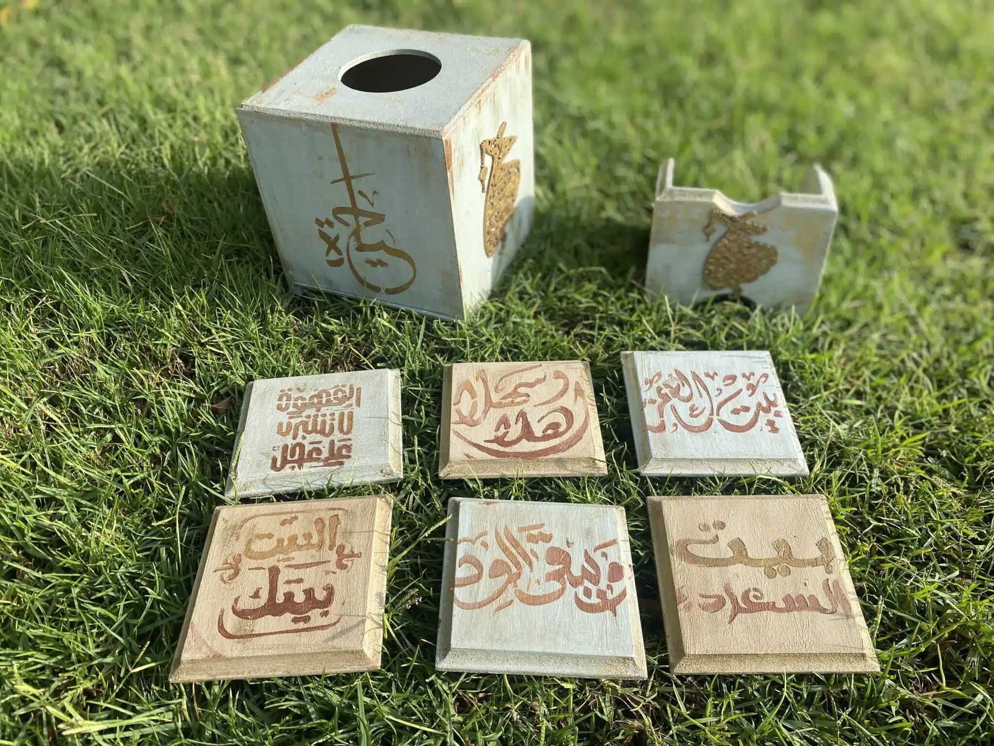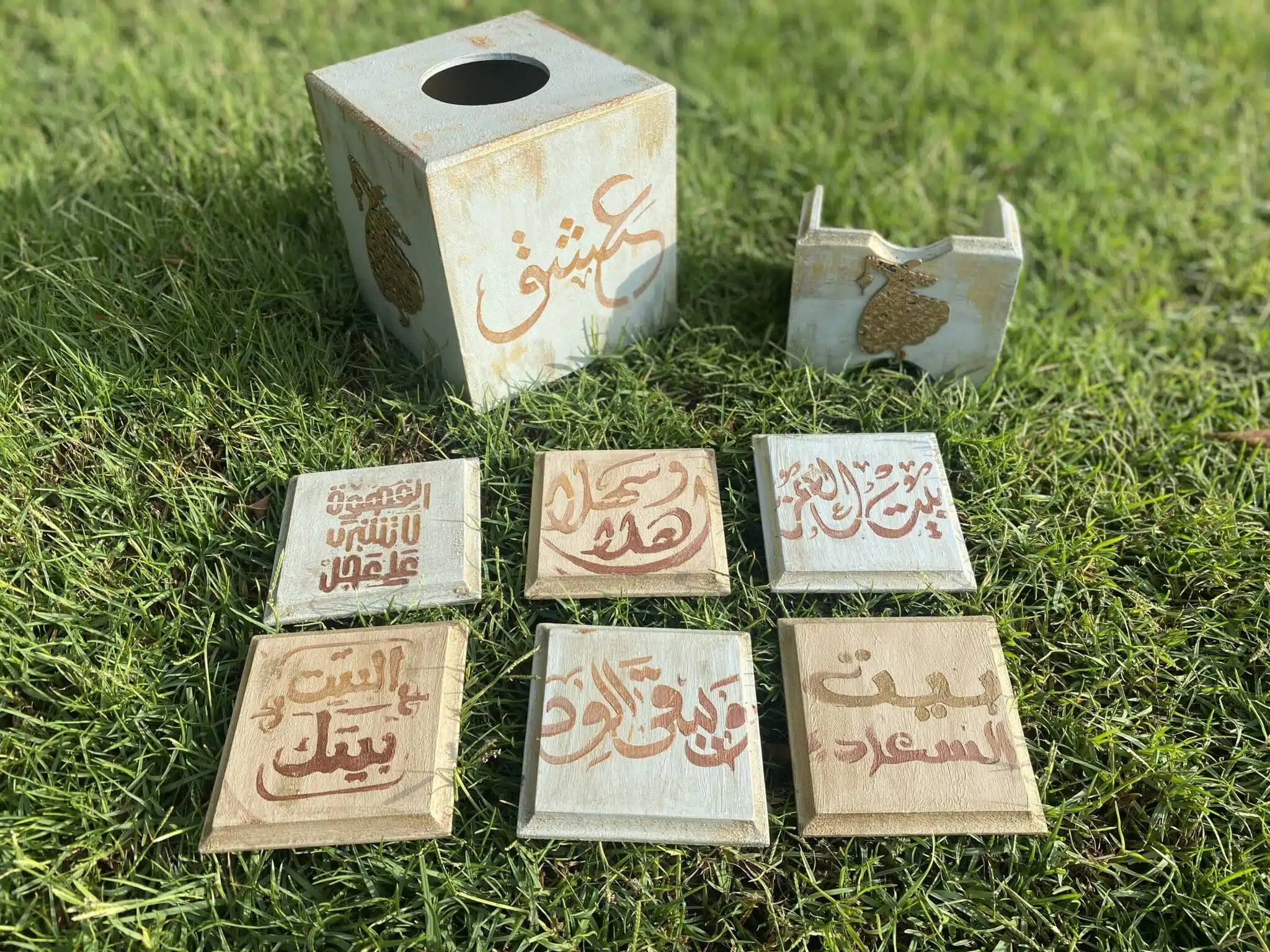 Wooden set tissue box and coasters with Arabic greetings and vintage blue color