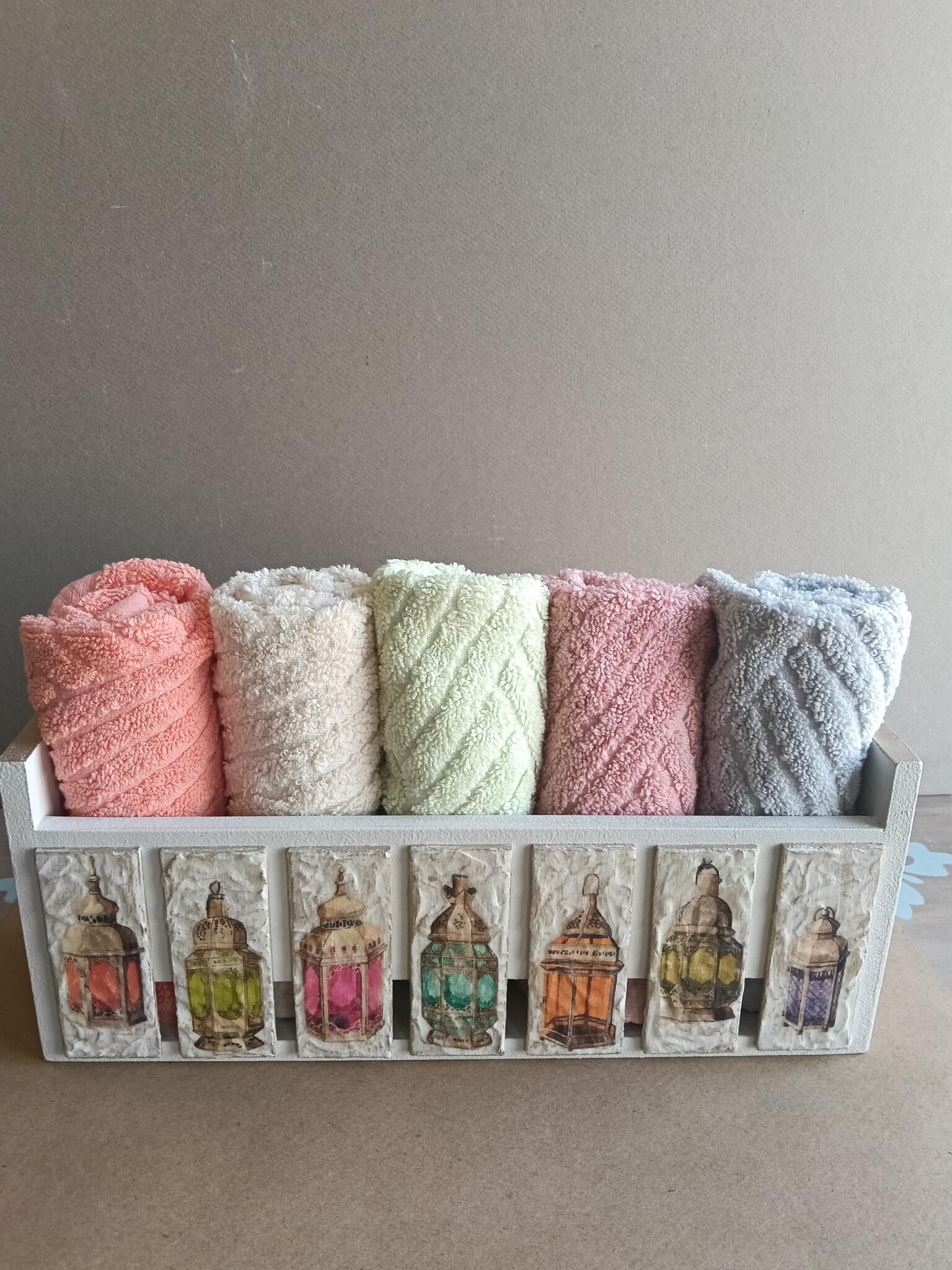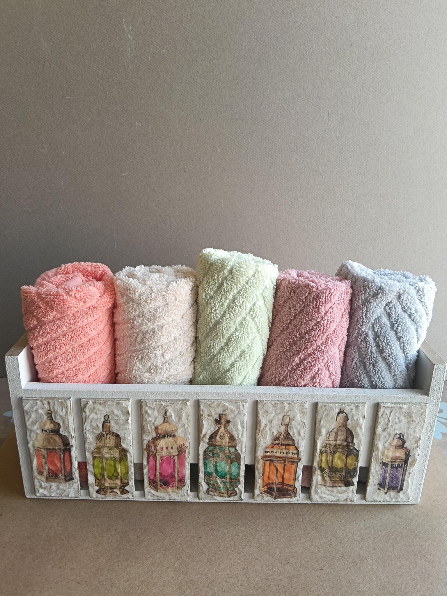 Wooden box size 30*8 cm height 12 cm painted and decorated with wooden tiles each decoupaged with a vintage fanoos and has a ceramic effect