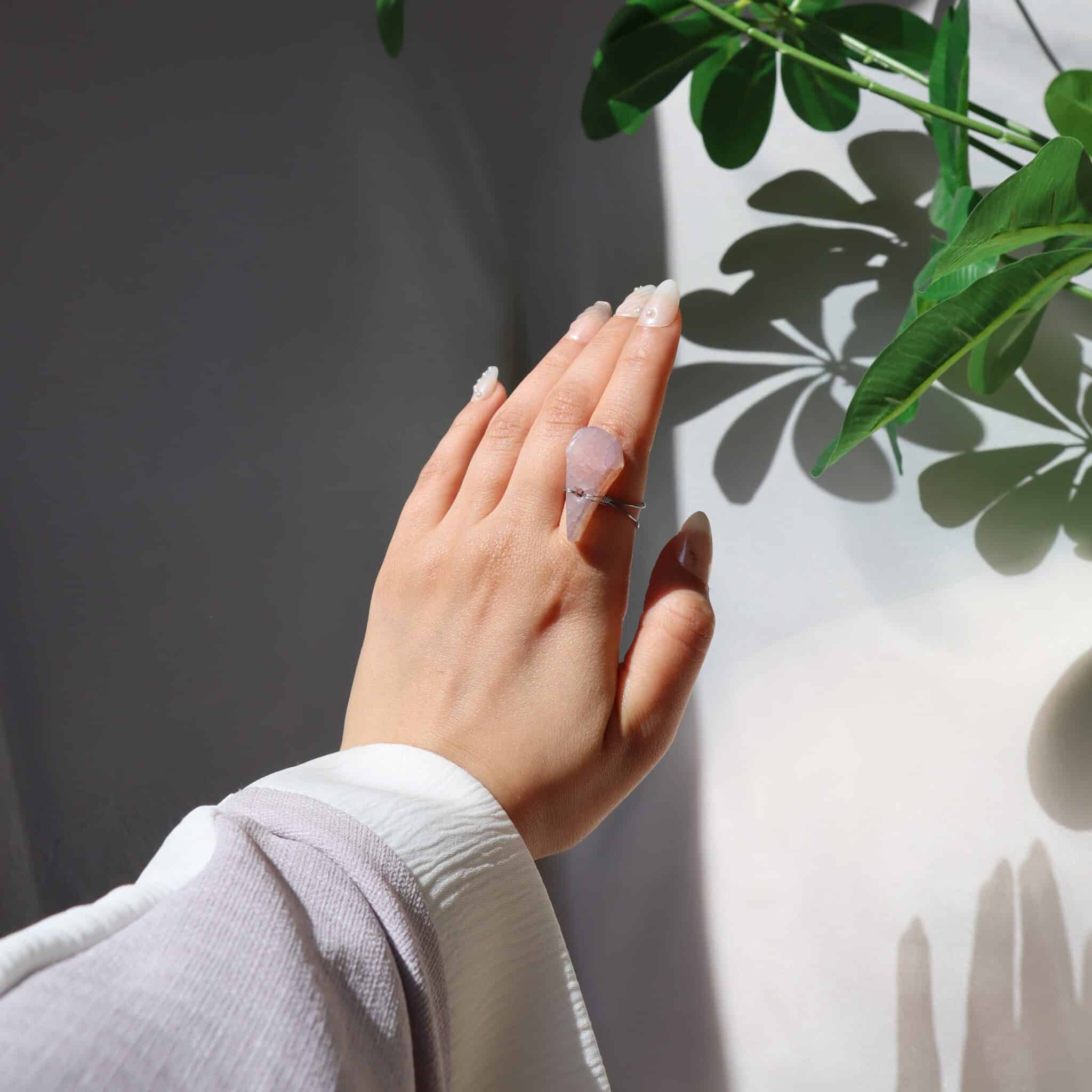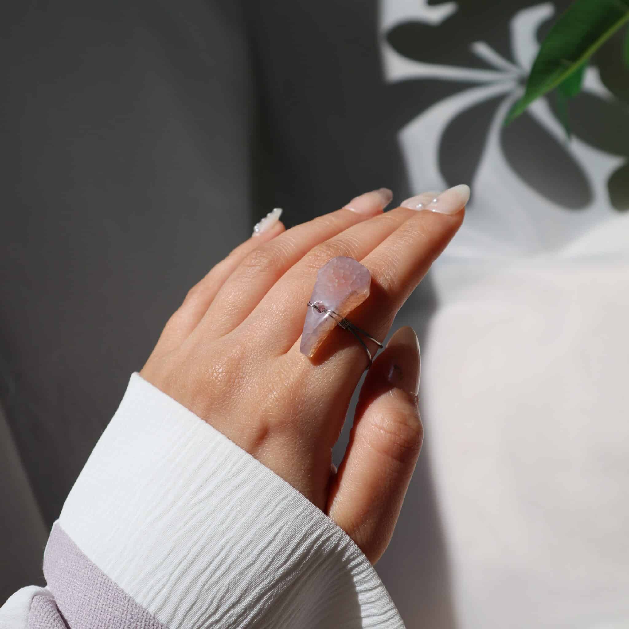 Handmade ring featuring a natural lilac stone wrapped in silver-toned wire.