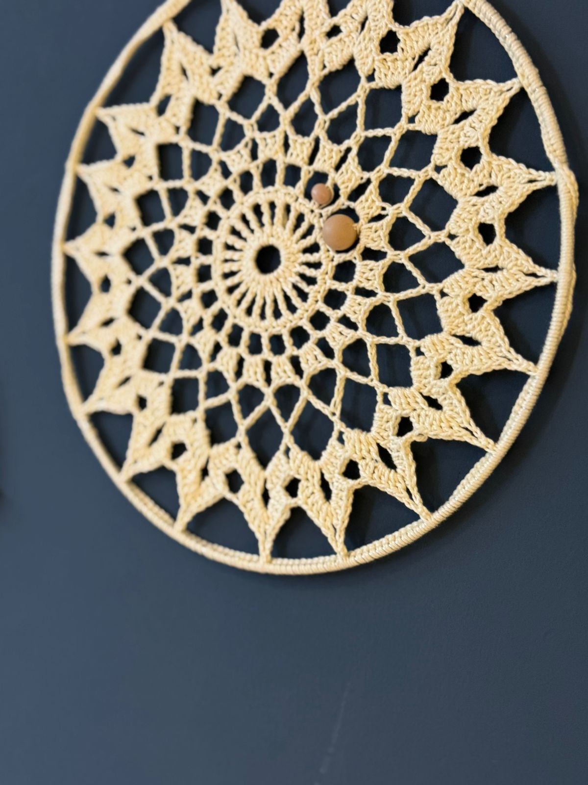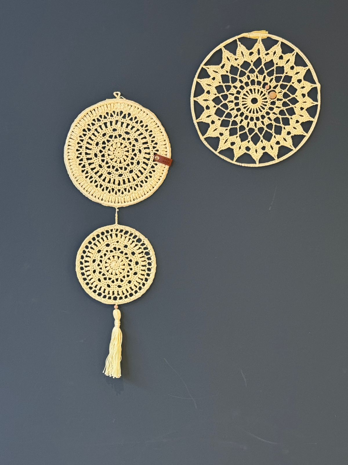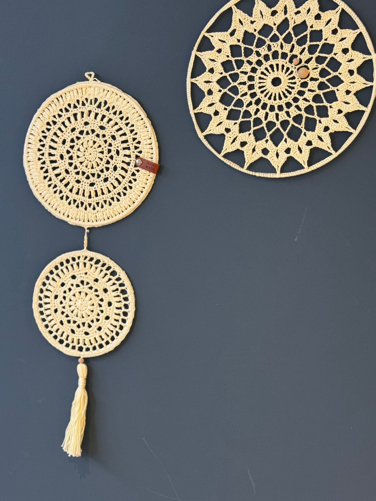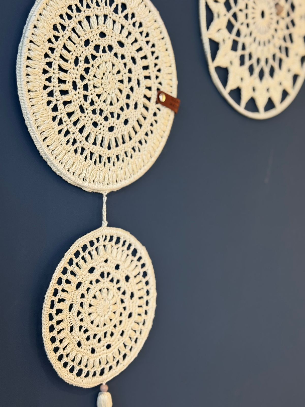 Handmade crochet wall hangings with intricate circular patterns in neutral tones, displayed on a dark background.